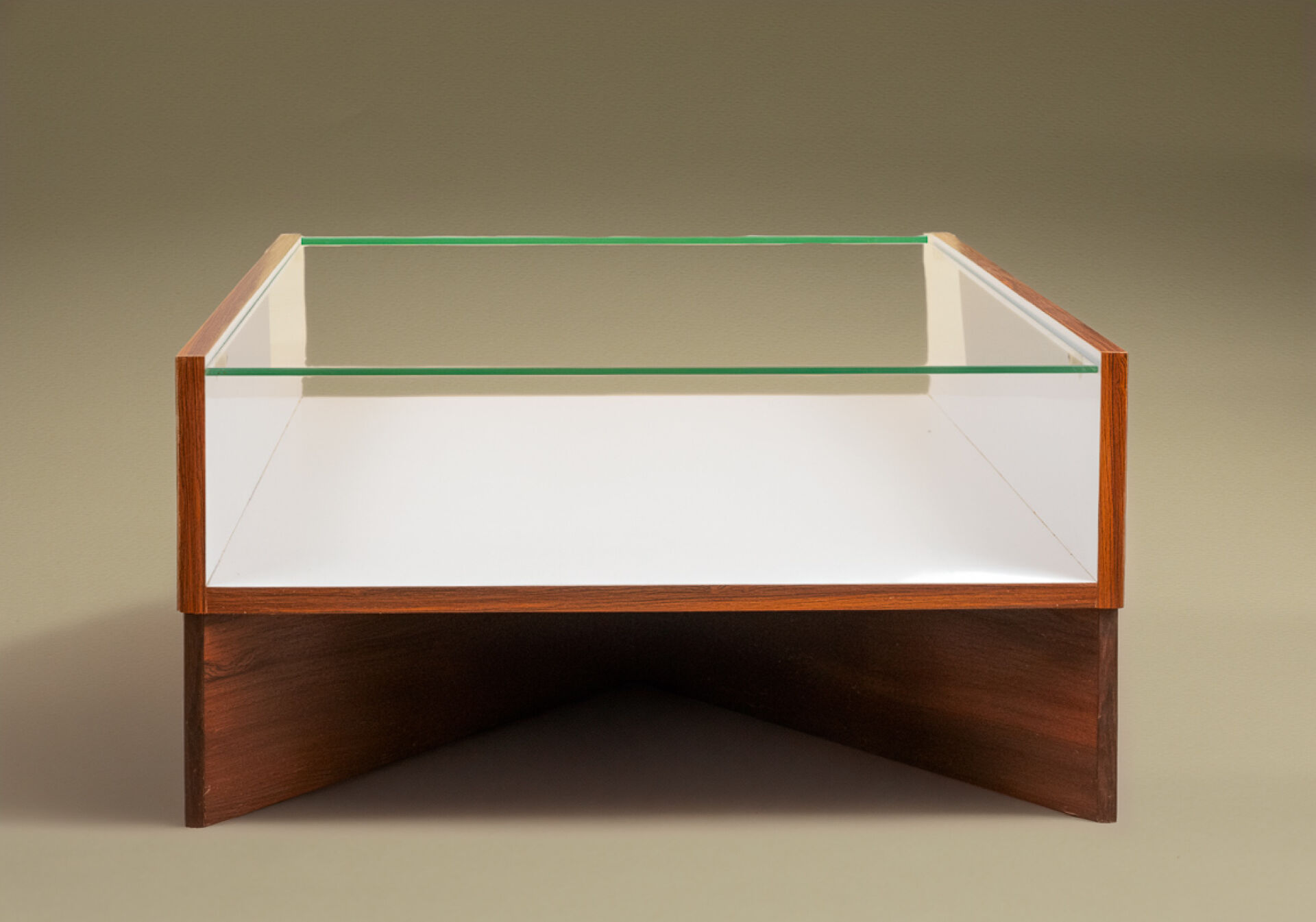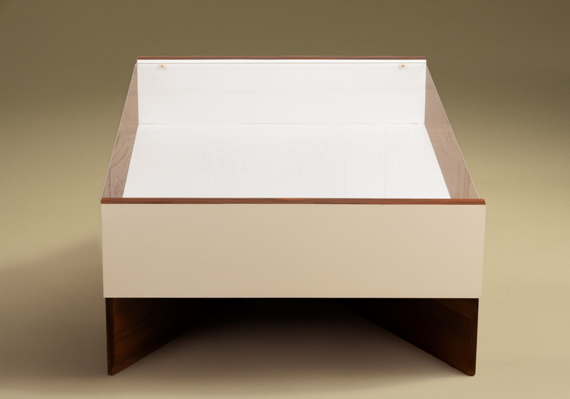 Pierre GUARICHE (1926-1995). Table basse modèle CA21 dite "Aquilon". Bois, mélaminé et verre, modèle créé en 1965 (légères traces d'usures). Haut. : 36 cm - Larg. : 70 cm - Prof. : 70 cm Cette table figure dans le livre "Pierre GUARICHE" de Delphine JACOB, Lionel BLAISSE et Aurélien JEAUNEAU aux éditions NORMA en page 158 et 159.