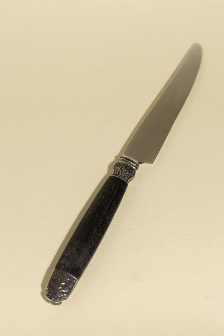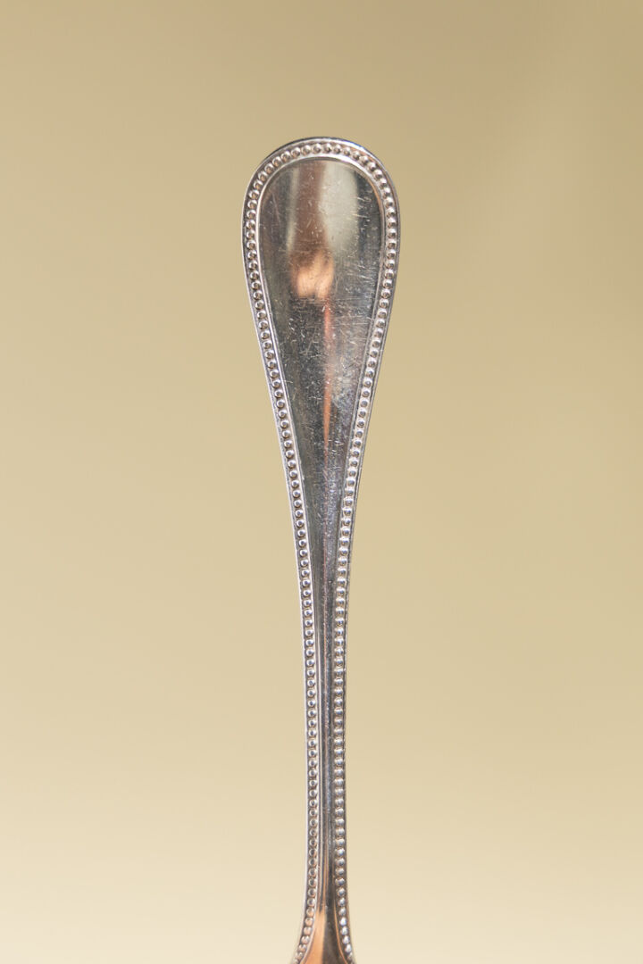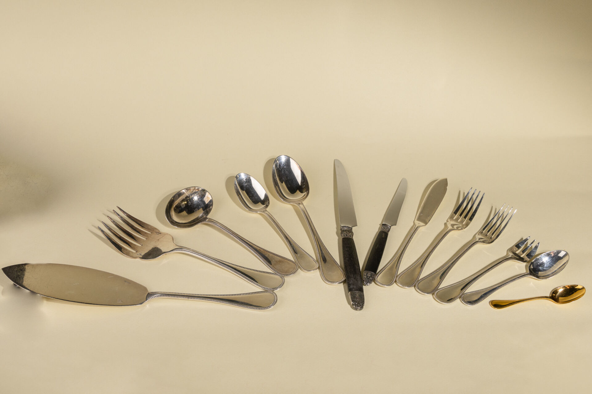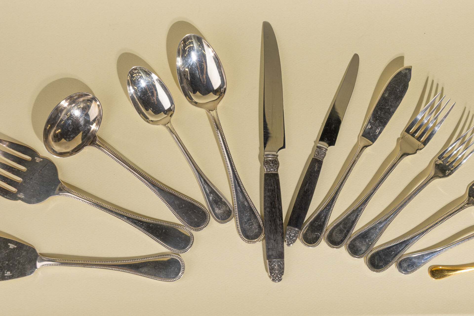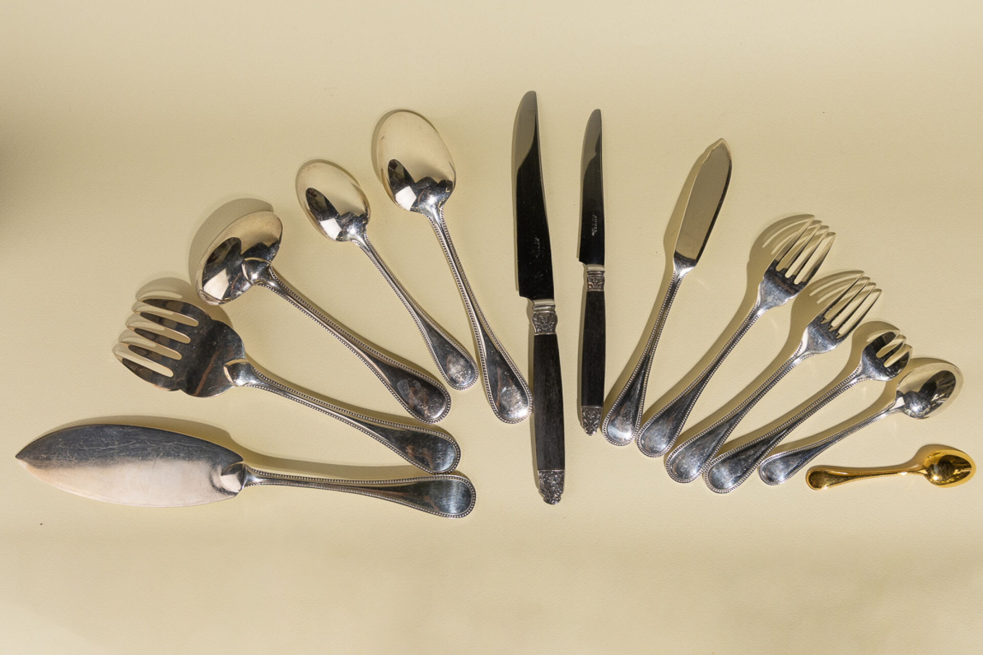 Maison CHRISTOFLE. Partie de ménagère en métal argenté et doré modèle "Perles" comprenant : - douze couverts; - douze couverts à poisson; - douze couverts à entremet; - douze fourchettes à gâteau; - douze fourchettes à huîtres; - douze cuillères à café; - douze cuillères à moka et une pince à sucre en argent doré. - pelle à tarte; - cuillère à sauce; - couverts de service à poisson. (125 pièces). On joint : Douze couteaux et onze couteaux à fromage manche en bois, lame acier (fentes).