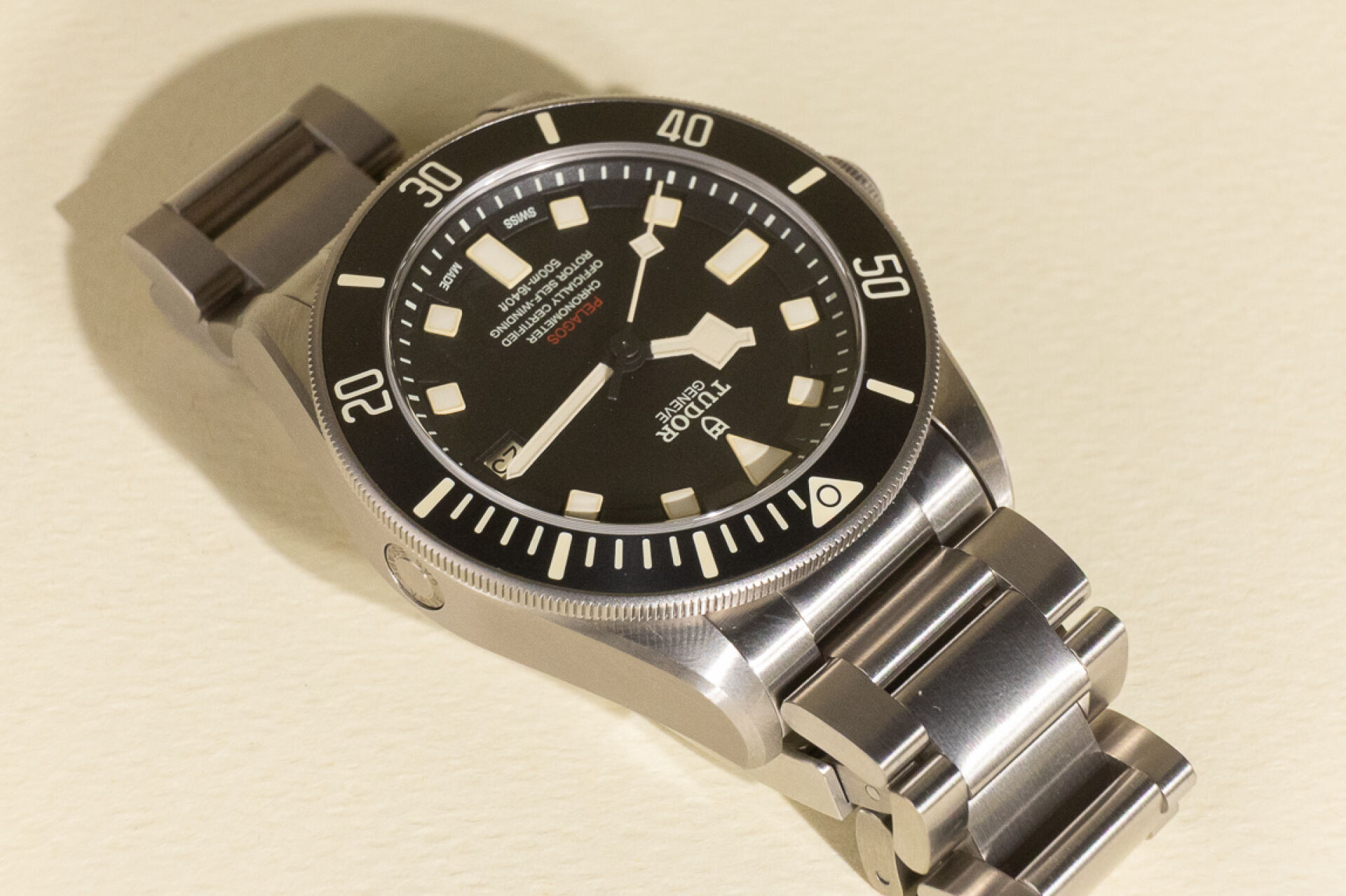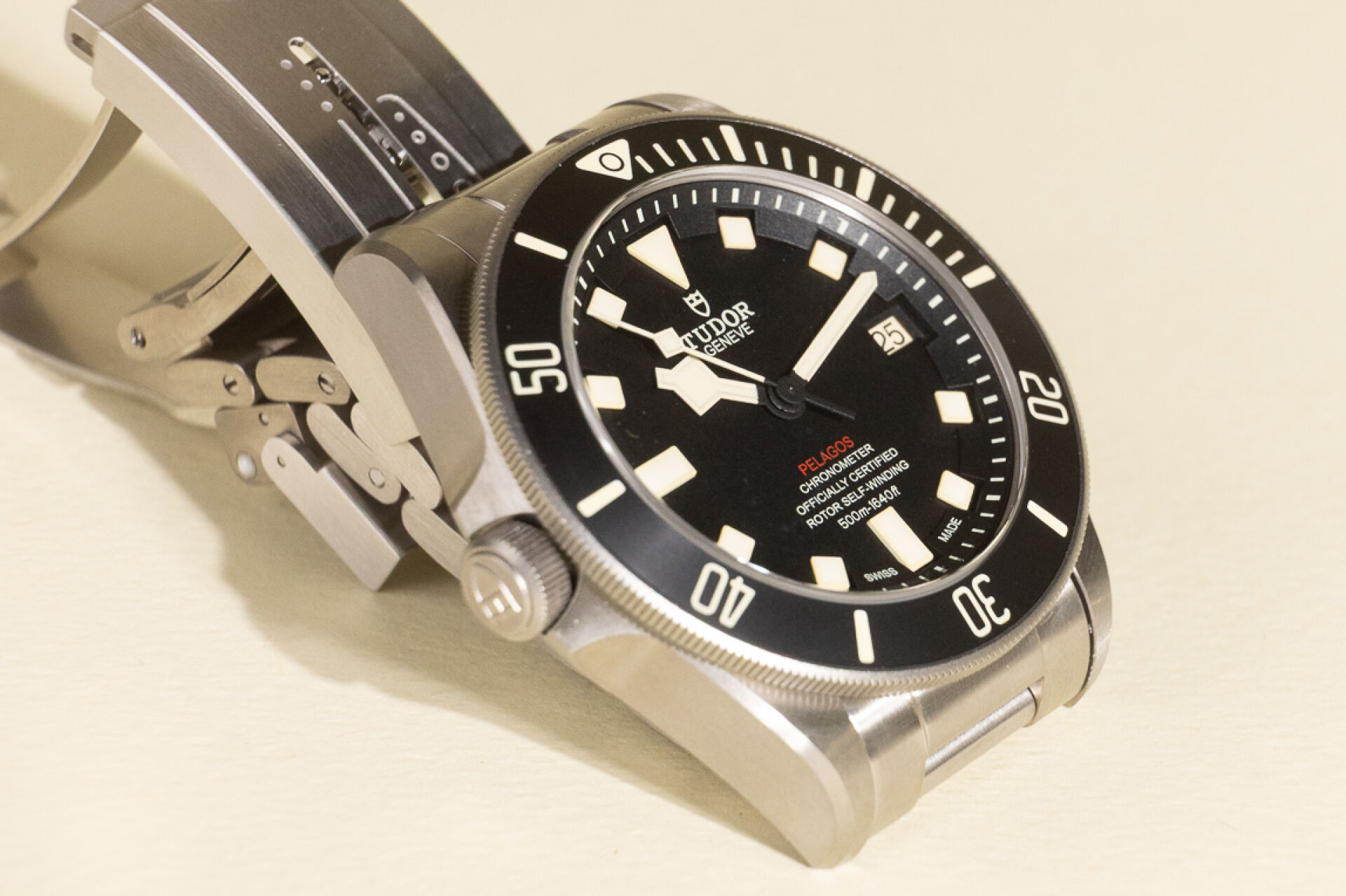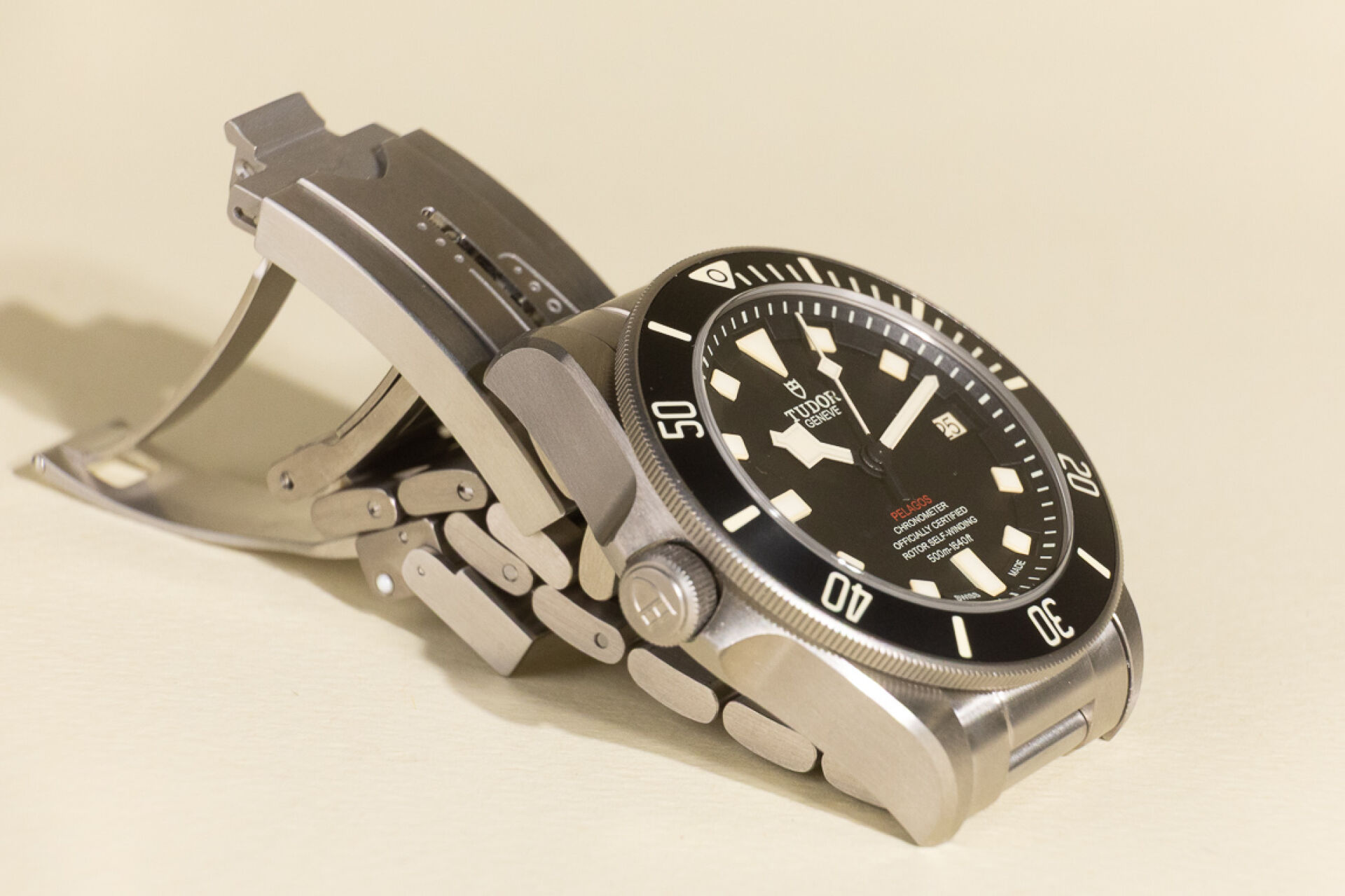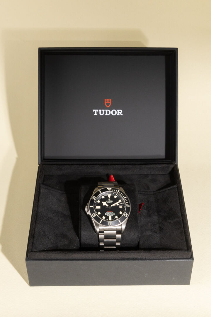Maison TUDOR. Montre bracelet homme "Pelagos", boitier circulaire en titane, finition satinée, fond du cadran noir, index bâtons pour les heures, guichet dateur à 3h avec les jours pairs affichées en rouge et les jours impairs en noir, lunette tournante unidirectionnelle graduée 60 minutes avec disque noir mat en céramique et graduation recouvertes d'un revêtement luminescent beige, glace saphir. Mouvement mécanique à remontage automatique, calibre manufacture MT5612, couronne de remontoir vissée à 9h ornée du logo Tudor en relief, valve à hélium automatique à 3h. Bracelet en titane avec boucle déployante et rabat de verrouillage en acier et système de rallonge de bracelet. Bracelet supplémentaire. Diam. : 42 mm Papiers, écrin, boite et surboite. Montre fonctionnant lors de l'expertise, révision conseillée. Conditions de vente spécifiques : Veuillez noter que toutes les montres sont vendues en l'état. Aucune garantie n'est faite sur l'état de marche, une révision est donc conseillée. Certaines montres ont été ouvertes pour identifier le type et la qualité du mouvement, y compris les montres résistantes à l'eau, il est donc conseillé à l'acheteur de consulter un horloger pour revoir l'étanchéité de la montre.