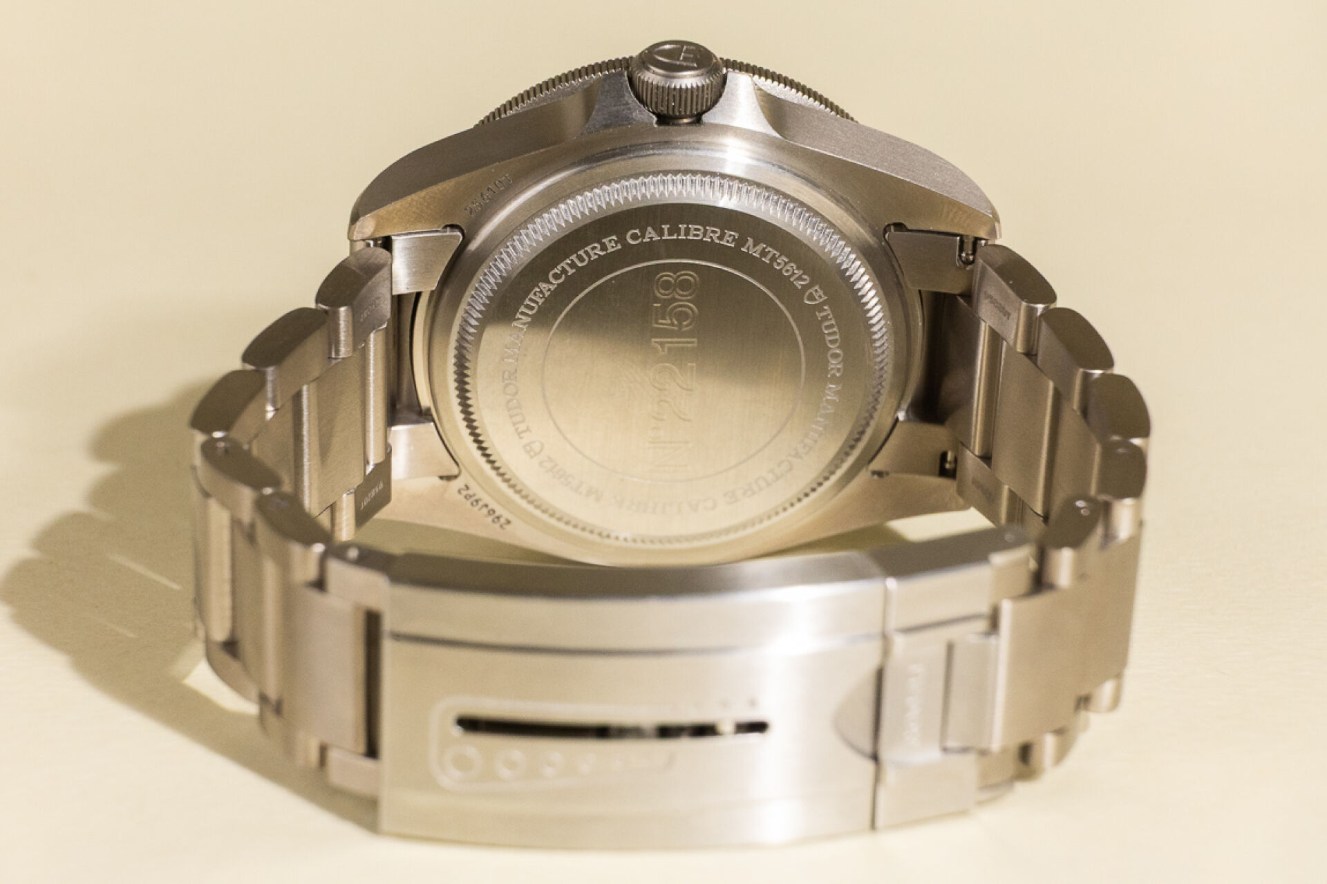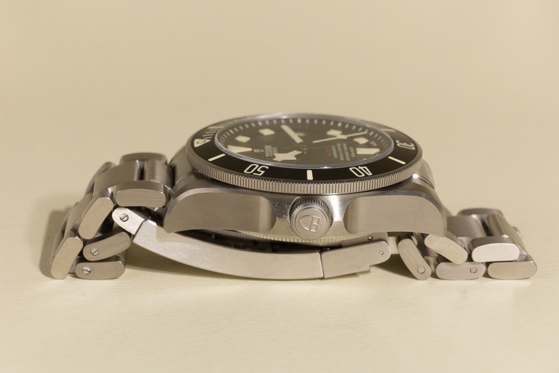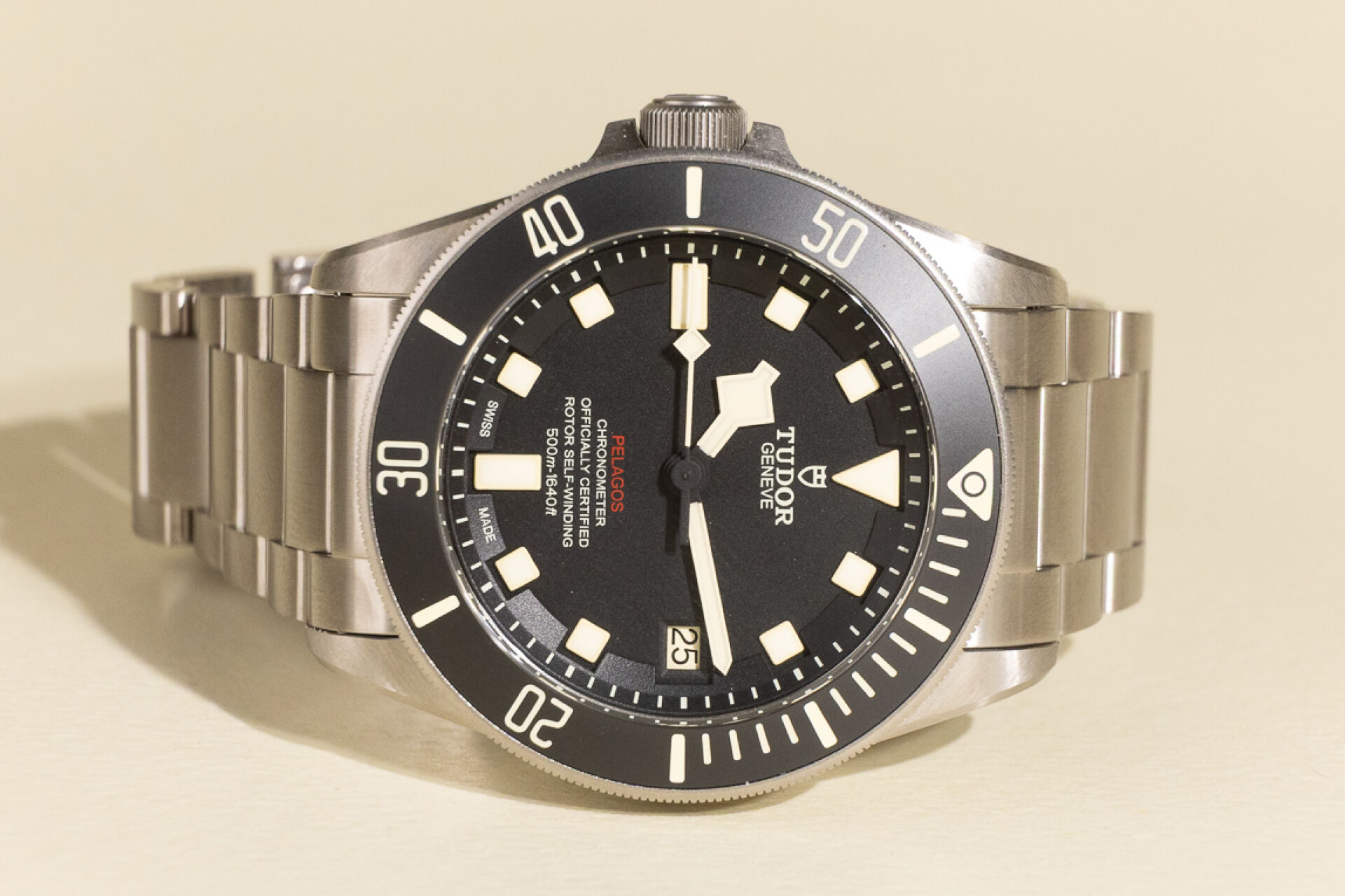 Maison TUDOR. Montre bracelet homme "Pelagos", boitier circulaire en titane, finition satinée, fond du cadran noir, index bâtons pour les heures, guichet dateur à 3h avec les jours pairs affichées en rouge et les jours impairs en noir, lunette tournante unidirectionnelle graduée 60 minutes avec disque noir mat en céramique et graduation recouvertes d'un revêtement luminescent beige, glace saphir. Mouvement mécanique à remontage automatique, calibre manufacture MT5612, couronne de remontoir vissée à 9h ornée du logo Tudor en relief, valve à hélium automatique à 3h. Bracelet en titane avec boucle déployante et rabat de verrouillage en acier et système de rallonge de bracelet. Bracelet supplémentaire. Diam. : 42 mm Papiers, écrin, boite et surboite. Montre fonctionnant lors de l'expertise, révision conseillée. Conditions de vente spécifiques : Veuillez noter que toutes les montres sont vendues en l'état. Aucune garantie n'est faite sur l'état de marche, une révision est donc conseillée. Certaines montres ont été ouvertes pour identifier le type et la qualité du mouvement, y compris les montres résistantes à l'eau, il est donc conseillé à l'acheteur de consulter un horloger pour revoir l'étanchéité de la montre.