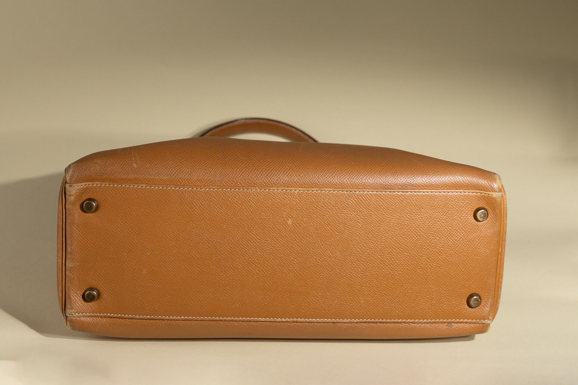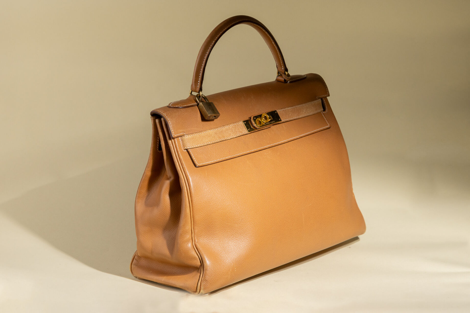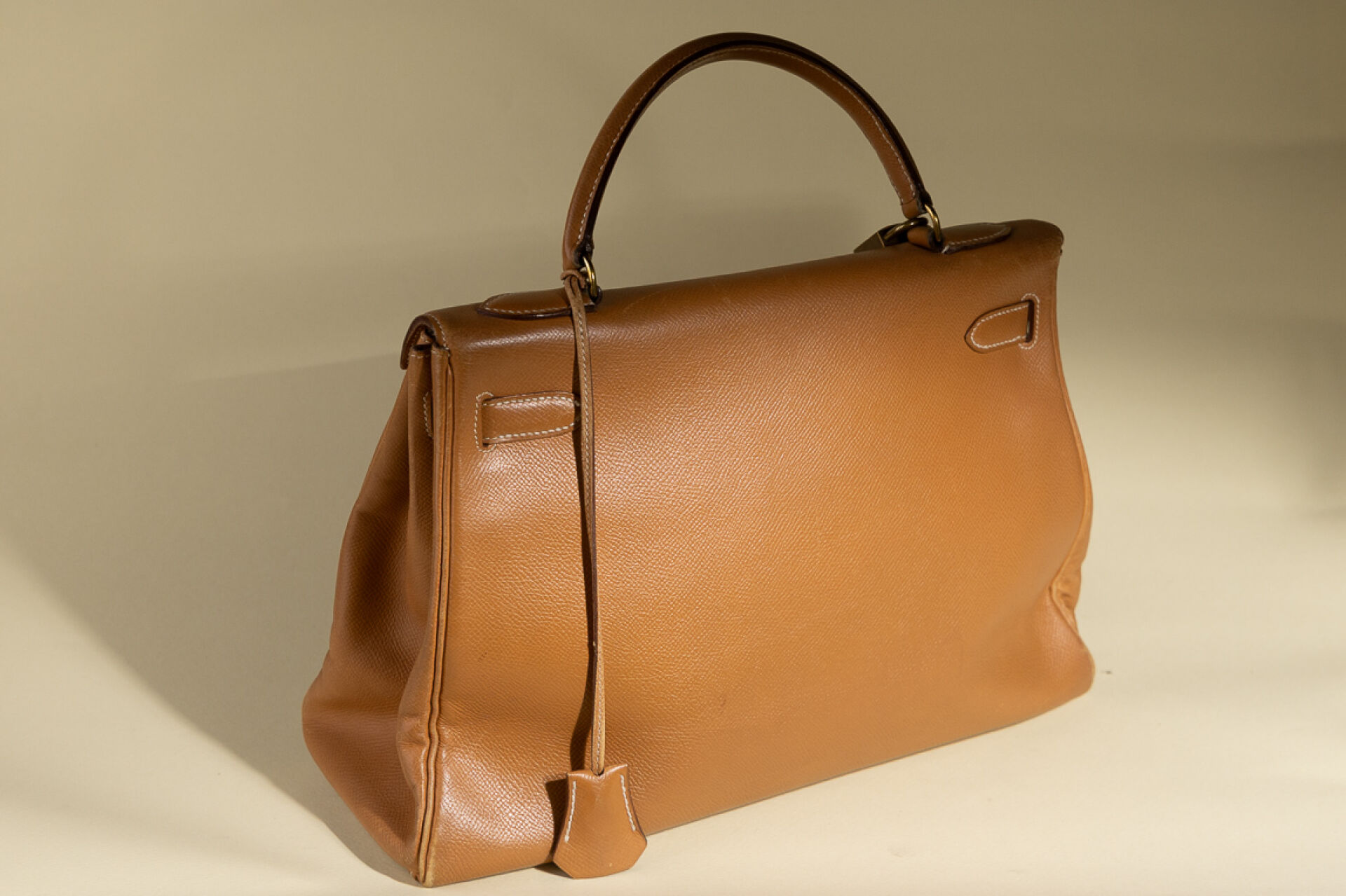 Maison HERMES, Paris, 1988. Sac "Kelly" retourné en cuir epsom gold, accastillage métal doré, clefs, cadenas, clochette (petites usures aux angles, petites griffures). Haut. : 21 cm - Long. : 32 cm Avec Dustbag.