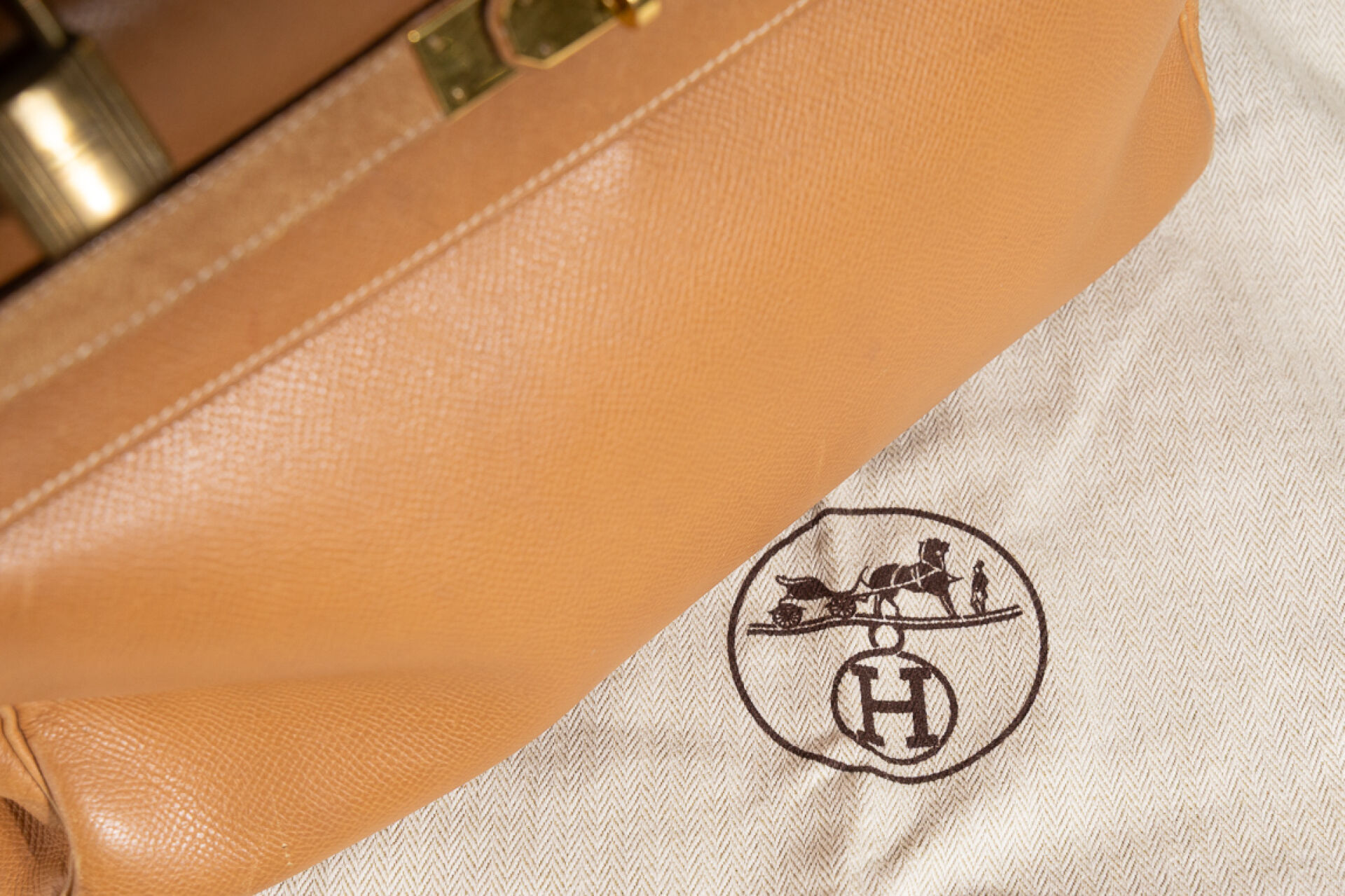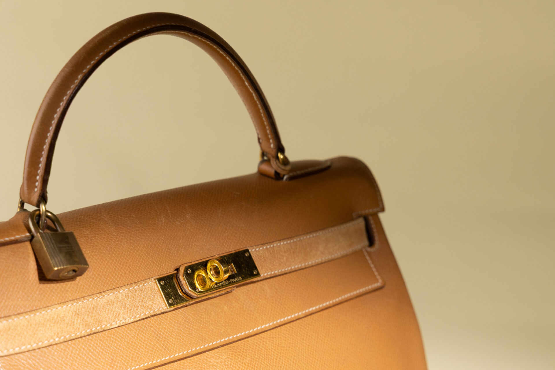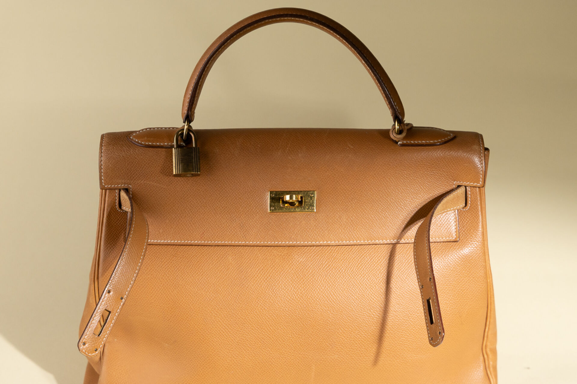 Maison HERMES, Paris, 1988. Sac "Kelly" retourné en cuir epsom gold, accastillage métal doré, clefs, cadenas, clochette (petites usures aux angles, petites griffures). Haut. : 21 cm - Long. : 32 cm Avec Dustbag.