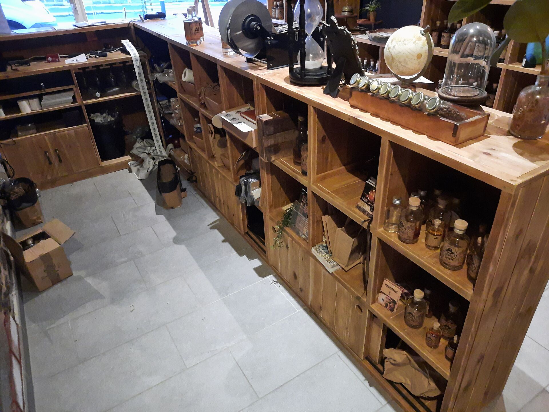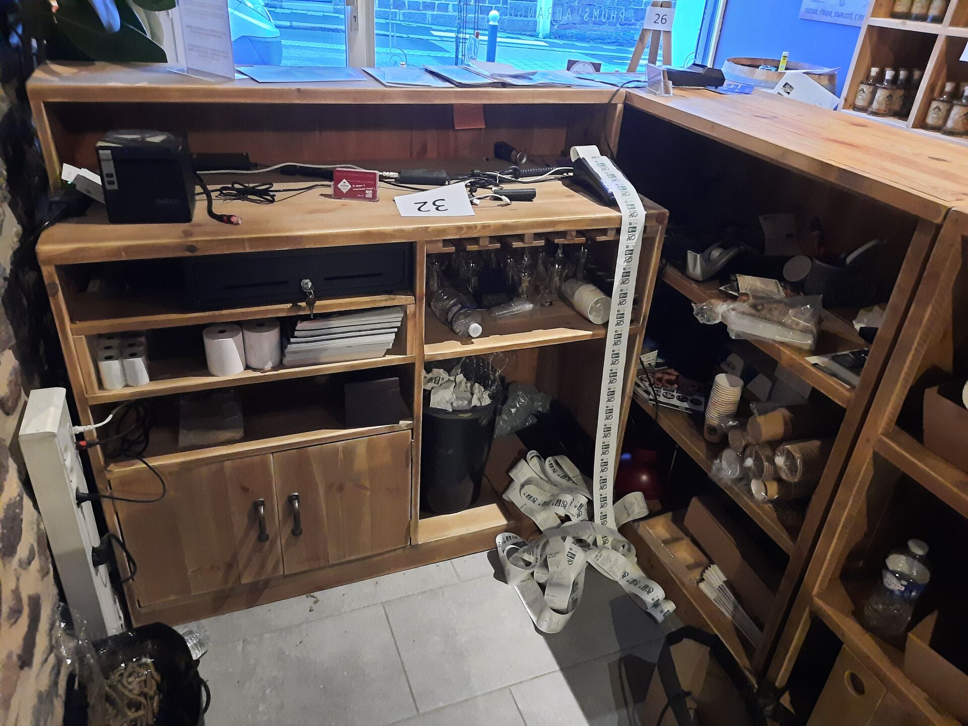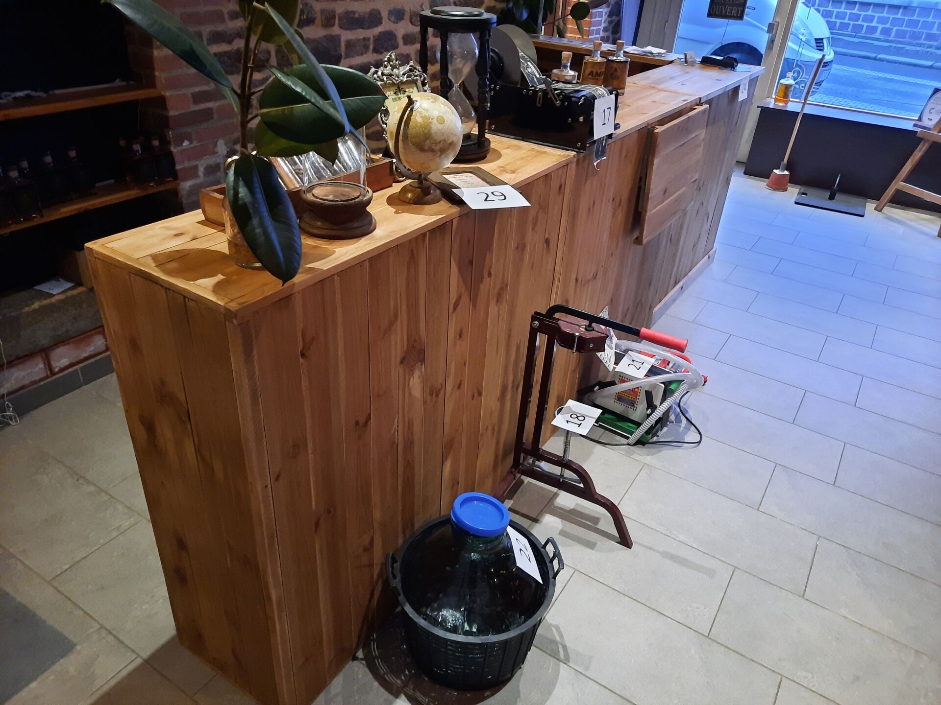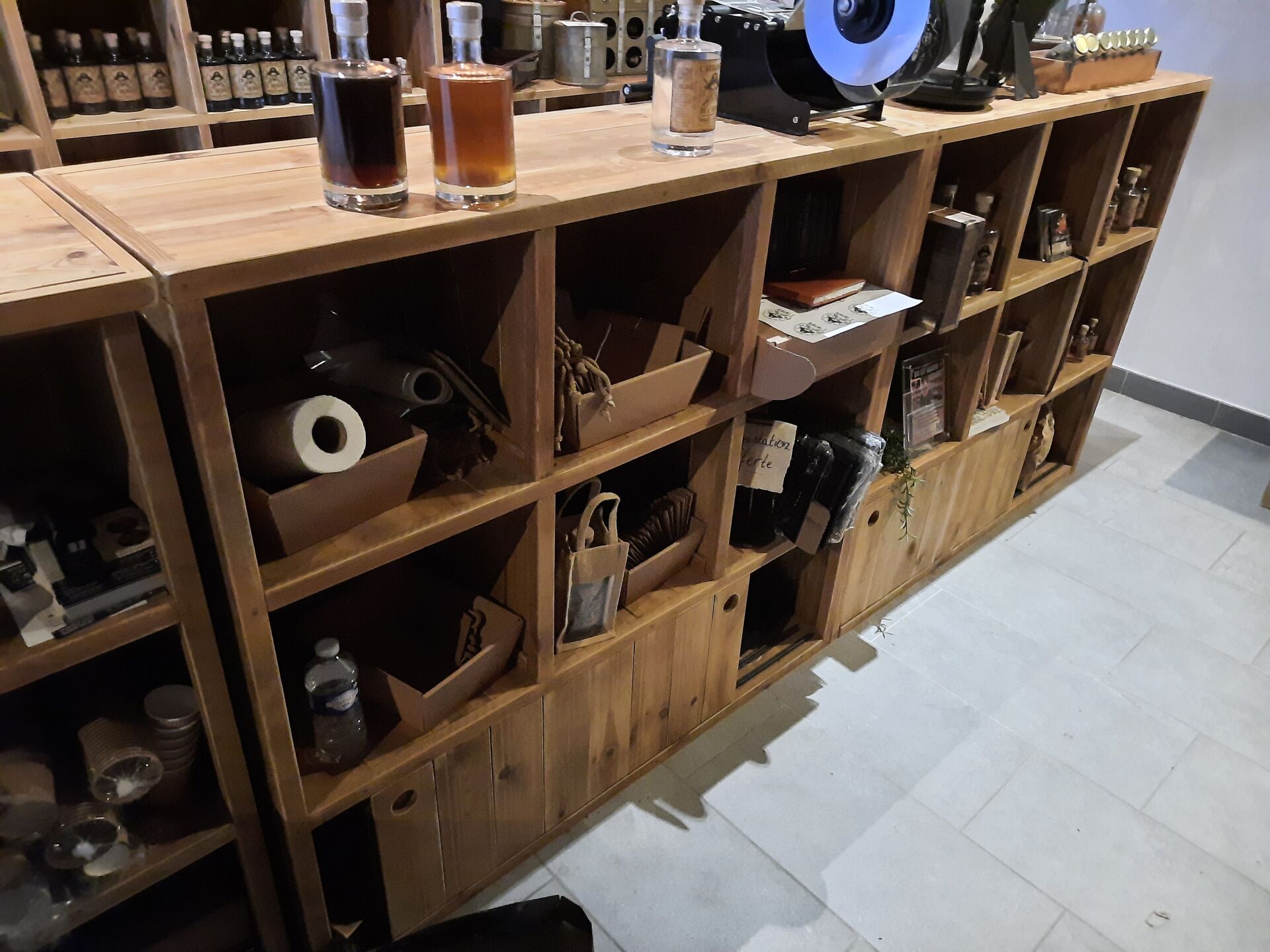 Banque d'accueil formant angle en pin (348 x 160 cm) composée de 4 modules indépendants dont : - 2 de 119x39x110 cm, - 1 de 109x39x110 cm, - 1 de 119x49x110 cm - 2 tablettes rabattables - Espaces de rangement dont certains à portes coulissantes