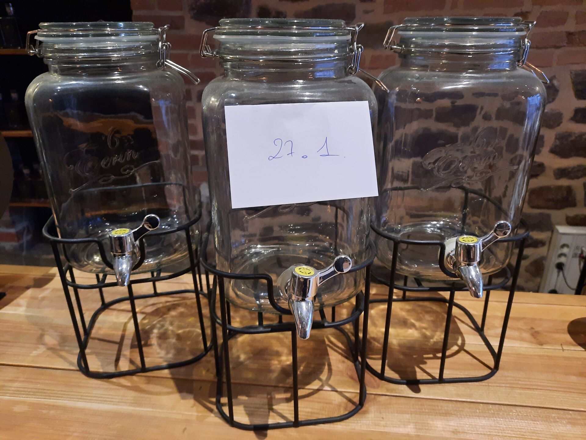 3 distributeurs de boisson en verre avec robinet et support métal (supposés 6 L)