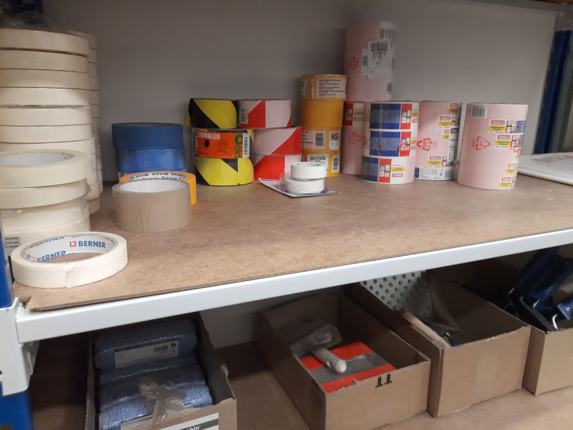 Stock de consommables pour peinture dont adhésif de masquage, films de protection, pinceaux, rouleaux, manchons On joint : Rouleaux de bandes pour plaques de plâtre, colle papier peint, colles toiles de verre, accessoires divers
