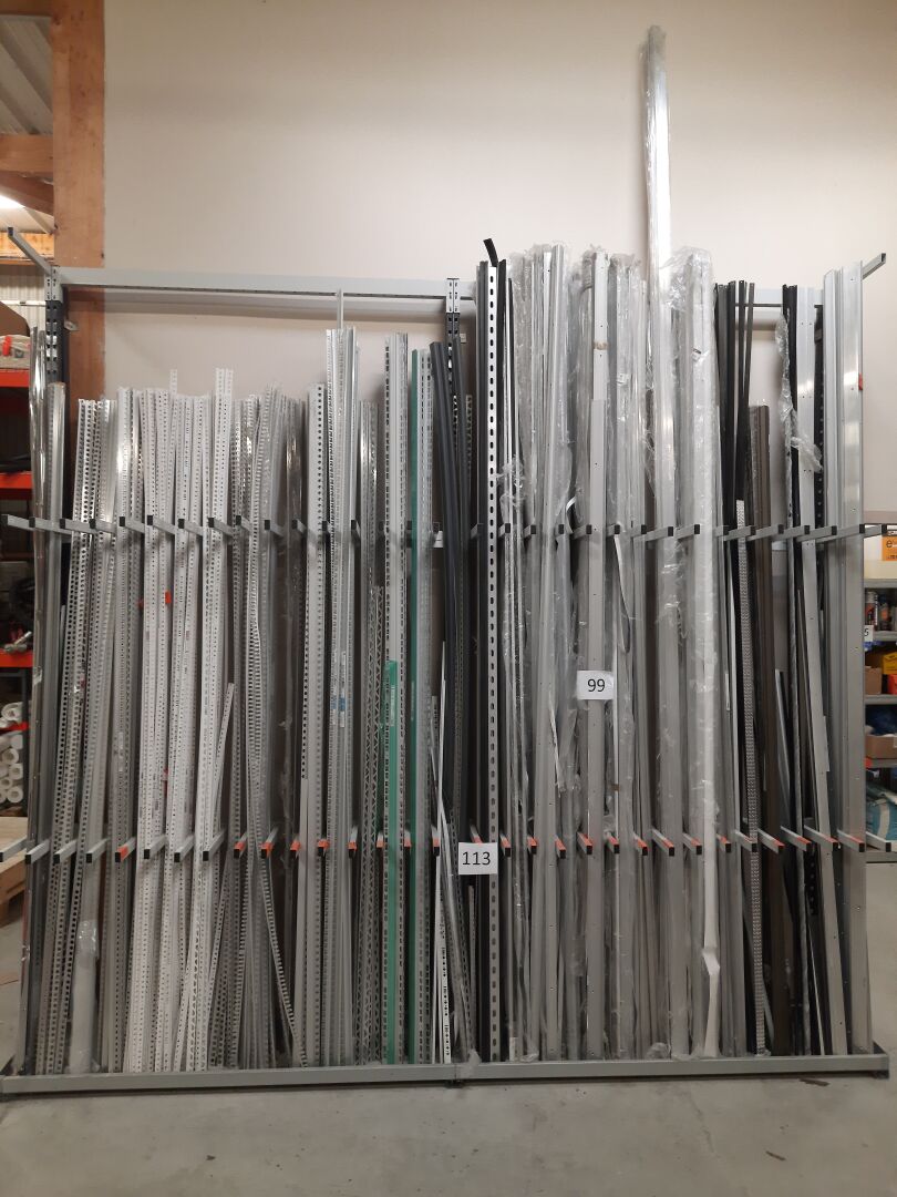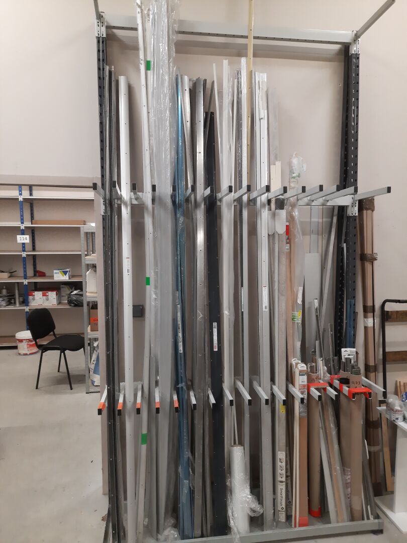 2 racks à baguettes en métal laqué gris, 4.8 m linéaires l'ensemble