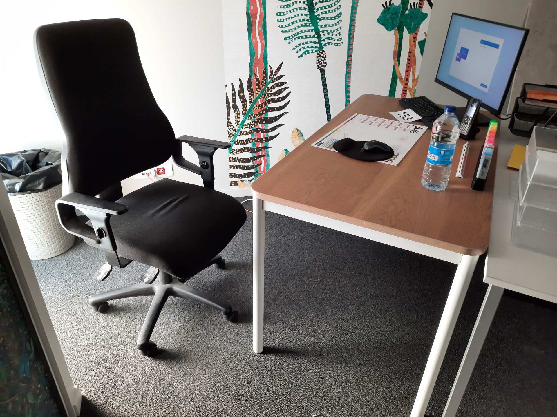 2 tables rectangulaires dépareillées Fauteuil dactylo, assise tissu noir Poubelle en PVC gris