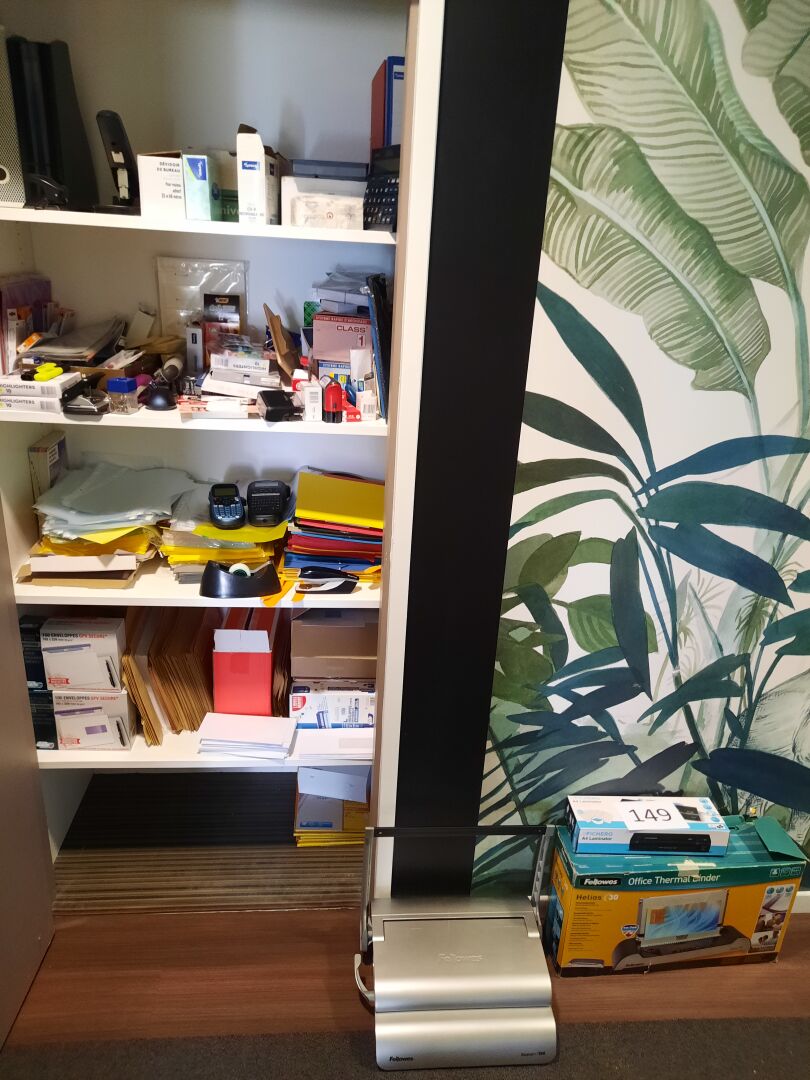 Ensemble de fournitures de bureau dont 2 relieuses plastifieuses, 2 imprimantes à ruban DYMO et BROTHER, papeterie (stylos, feutres, pochettes, enveloppes, agrafes...)