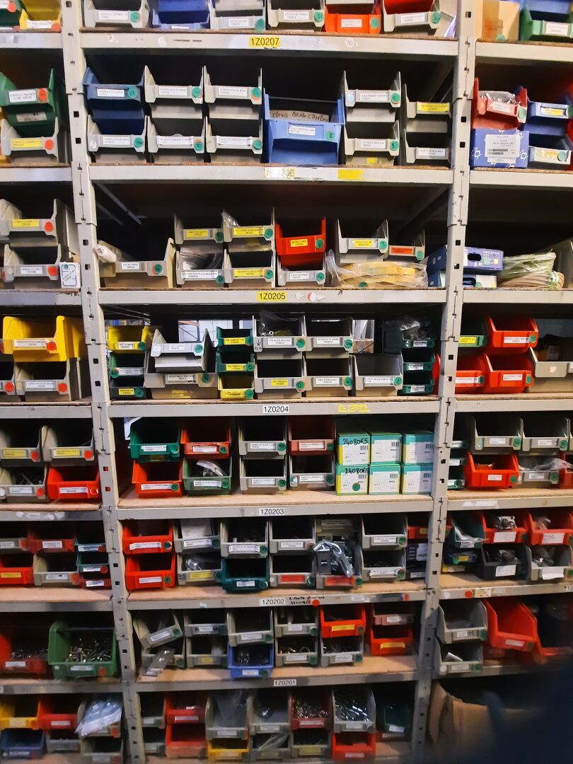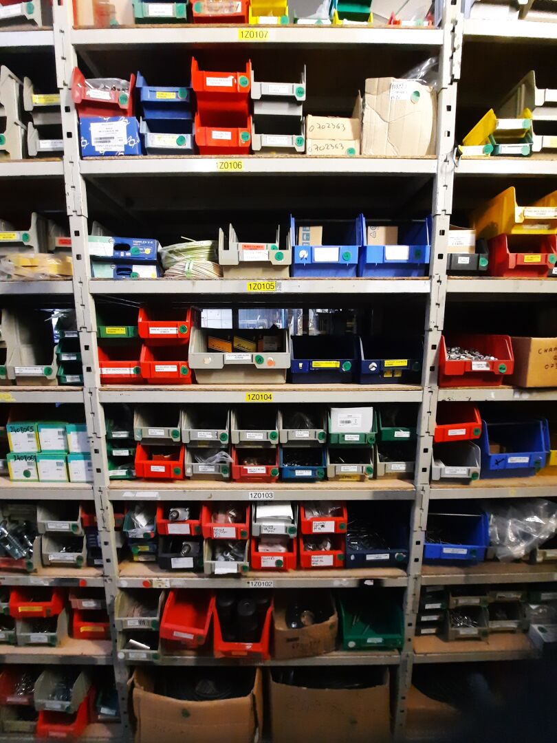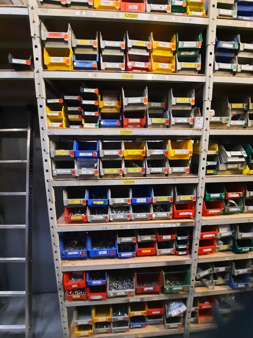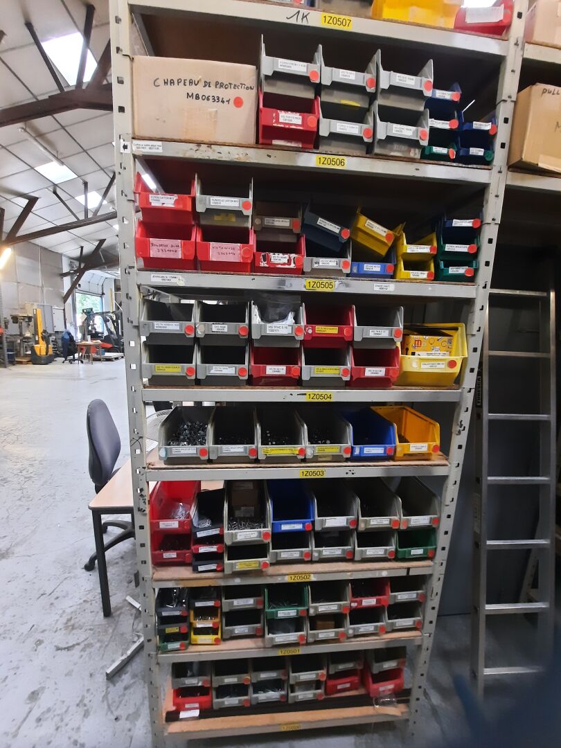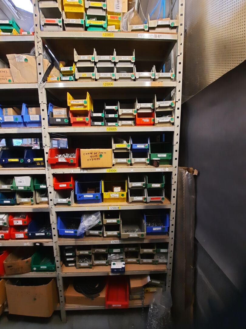 Dans les étagères 1 Z 00 [...] à 1 Z 05 [...] Stock de quincaillerie dont écrous, vis, rondelles, goujons, rivets, fils et câbles électriques....