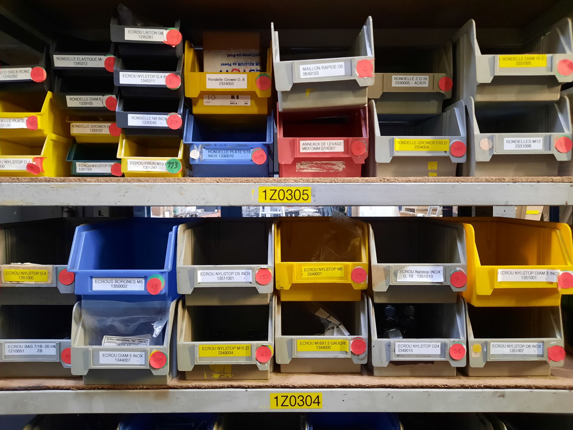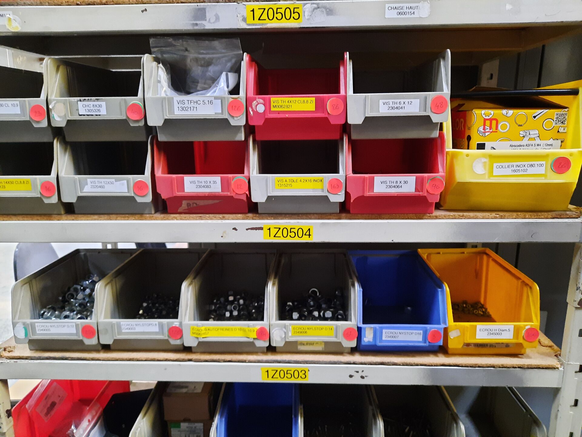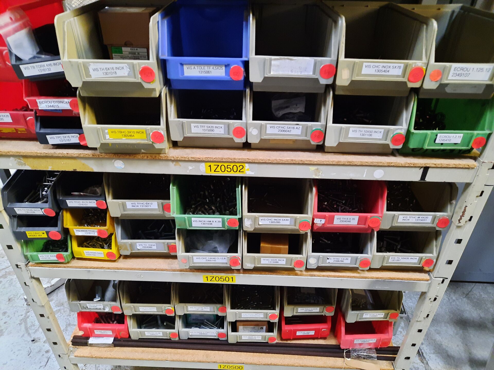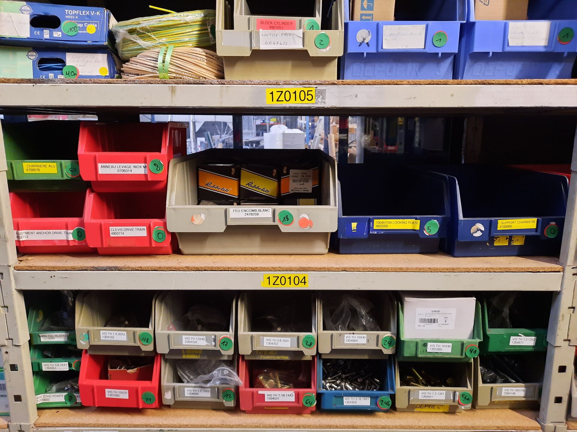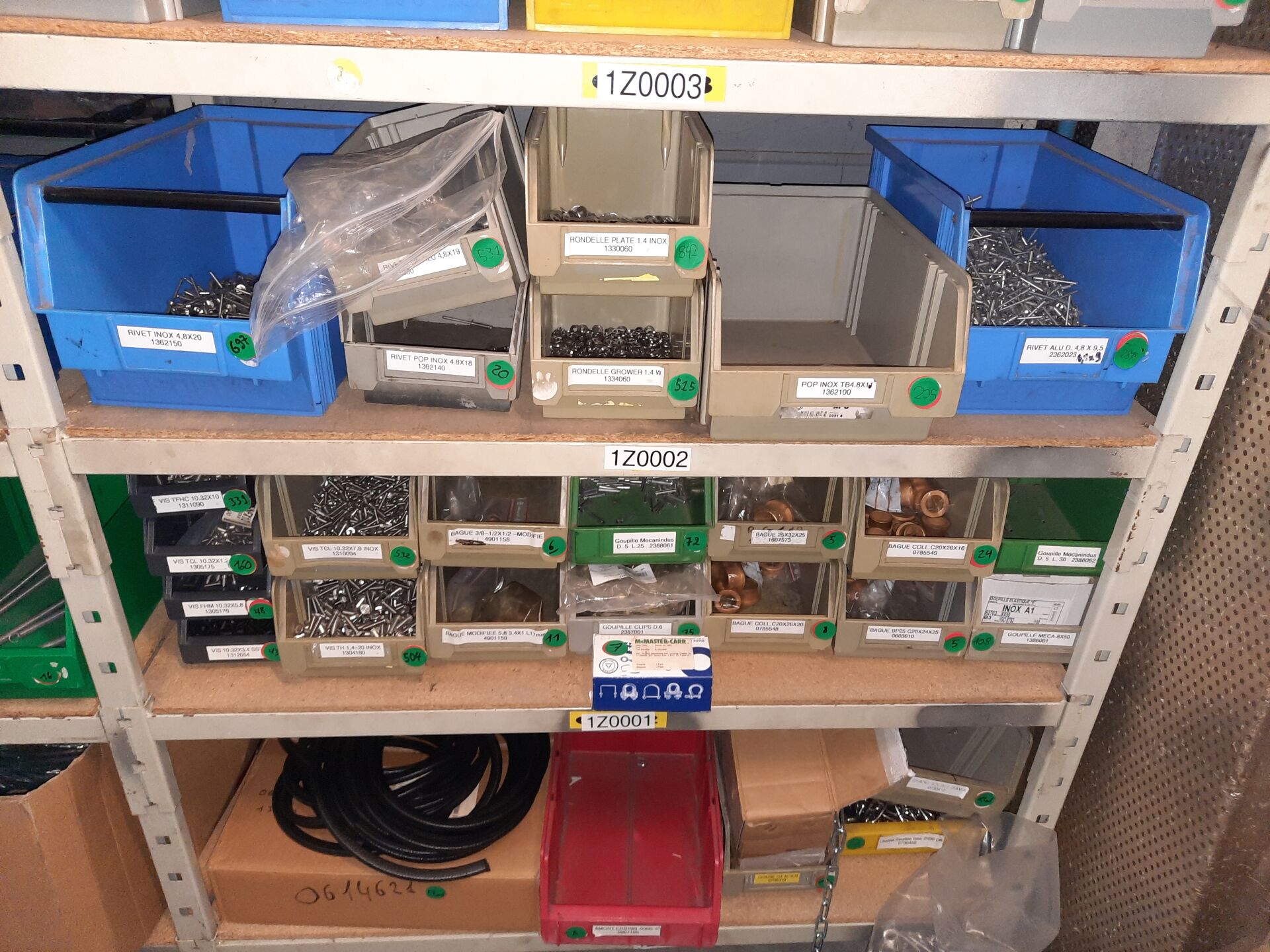 Dans les étagères 1 Z 00 [...] à 1 Z 05 [...] Stock de quincaillerie dont écrous, vis, rondelles, goujons, rivets, fils et câbles électriques....