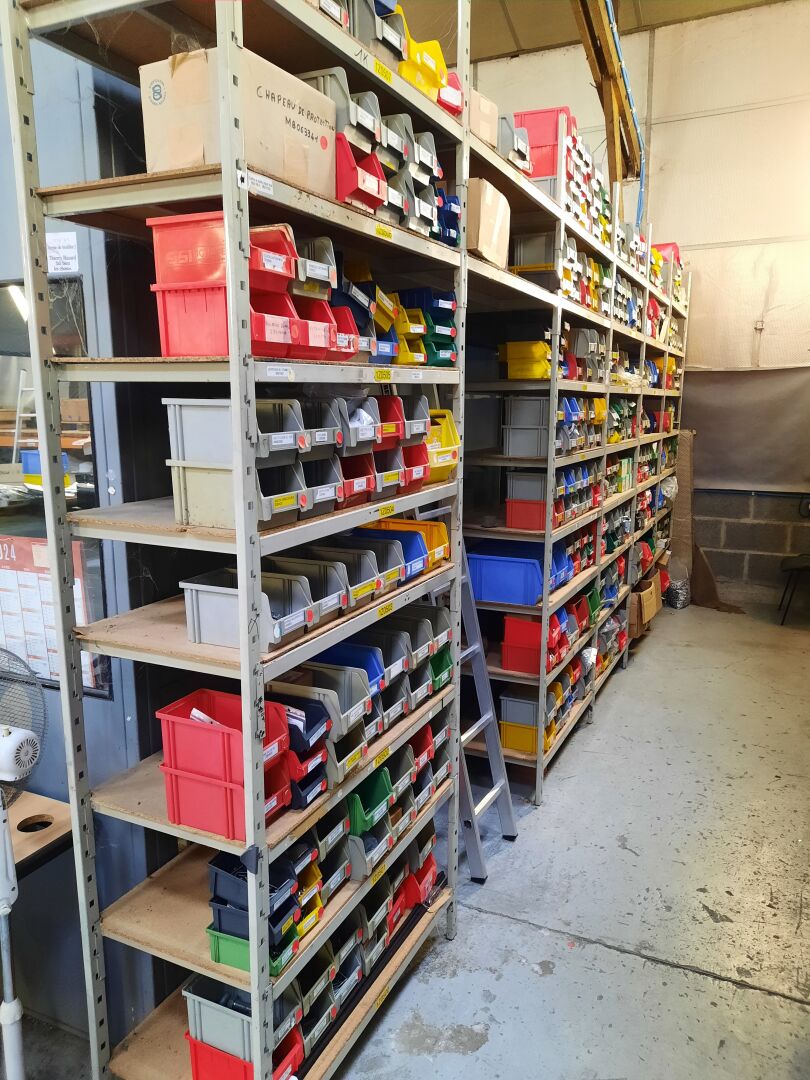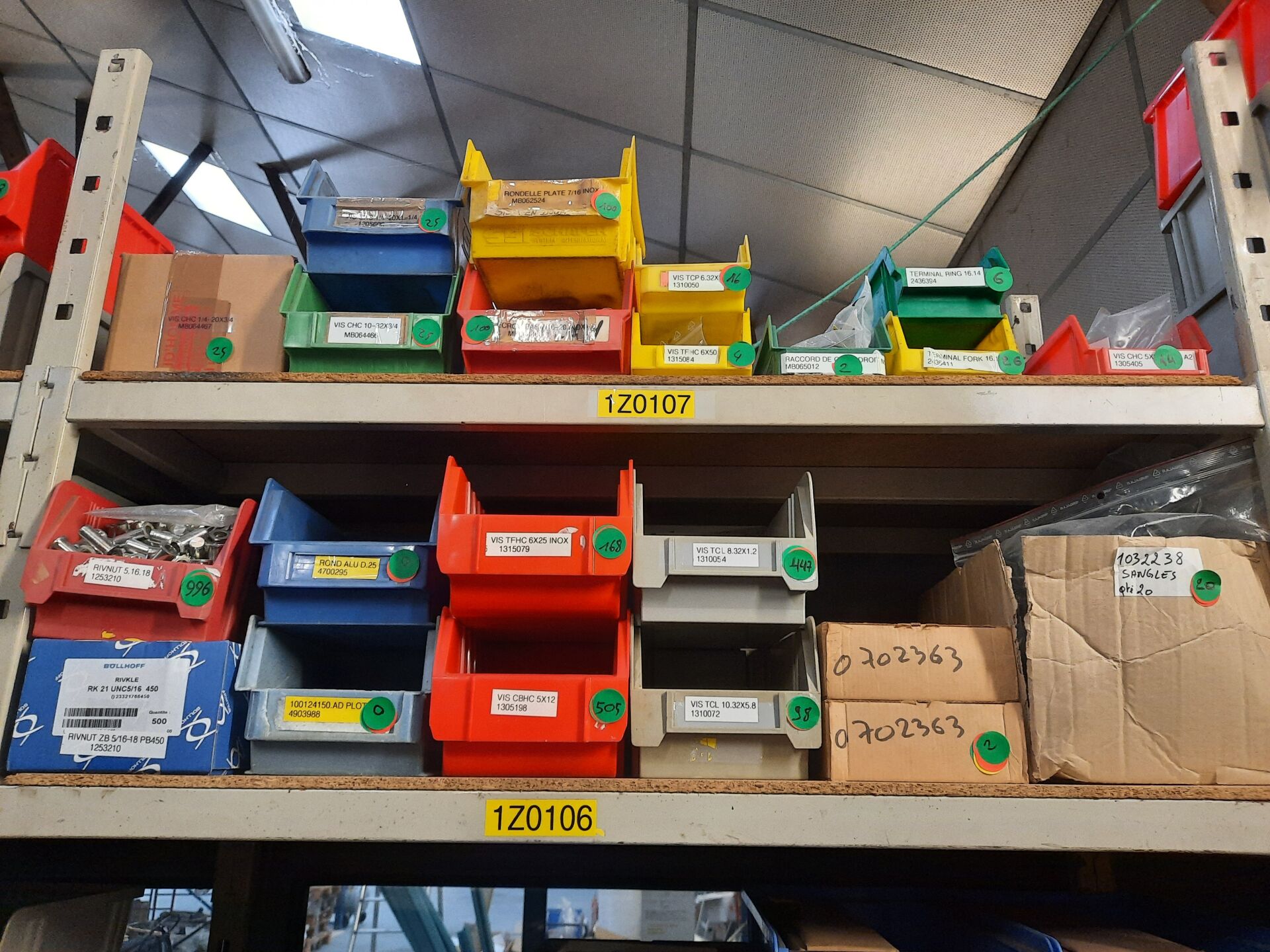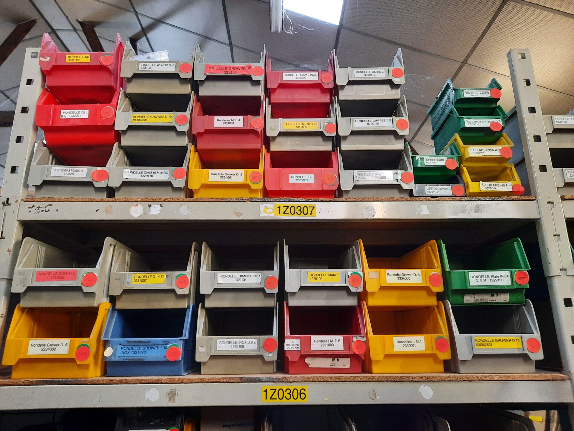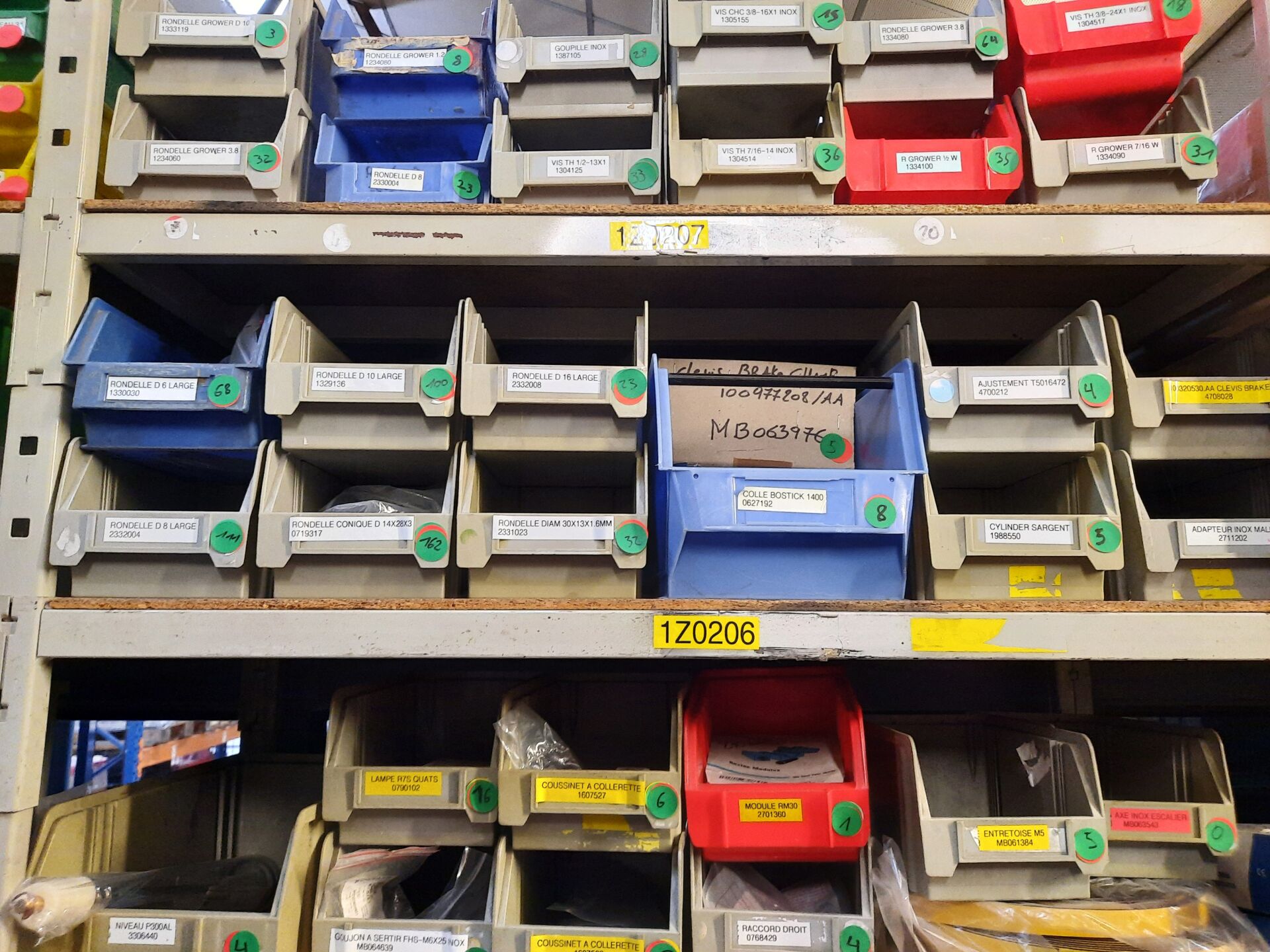 Dans les étagères 1 Z 00 [...] à 1 Z 05 [...] Stock de quincaillerie dont écrous, vis, rondelles, goujons, rivets, fils et câbles électriques....
