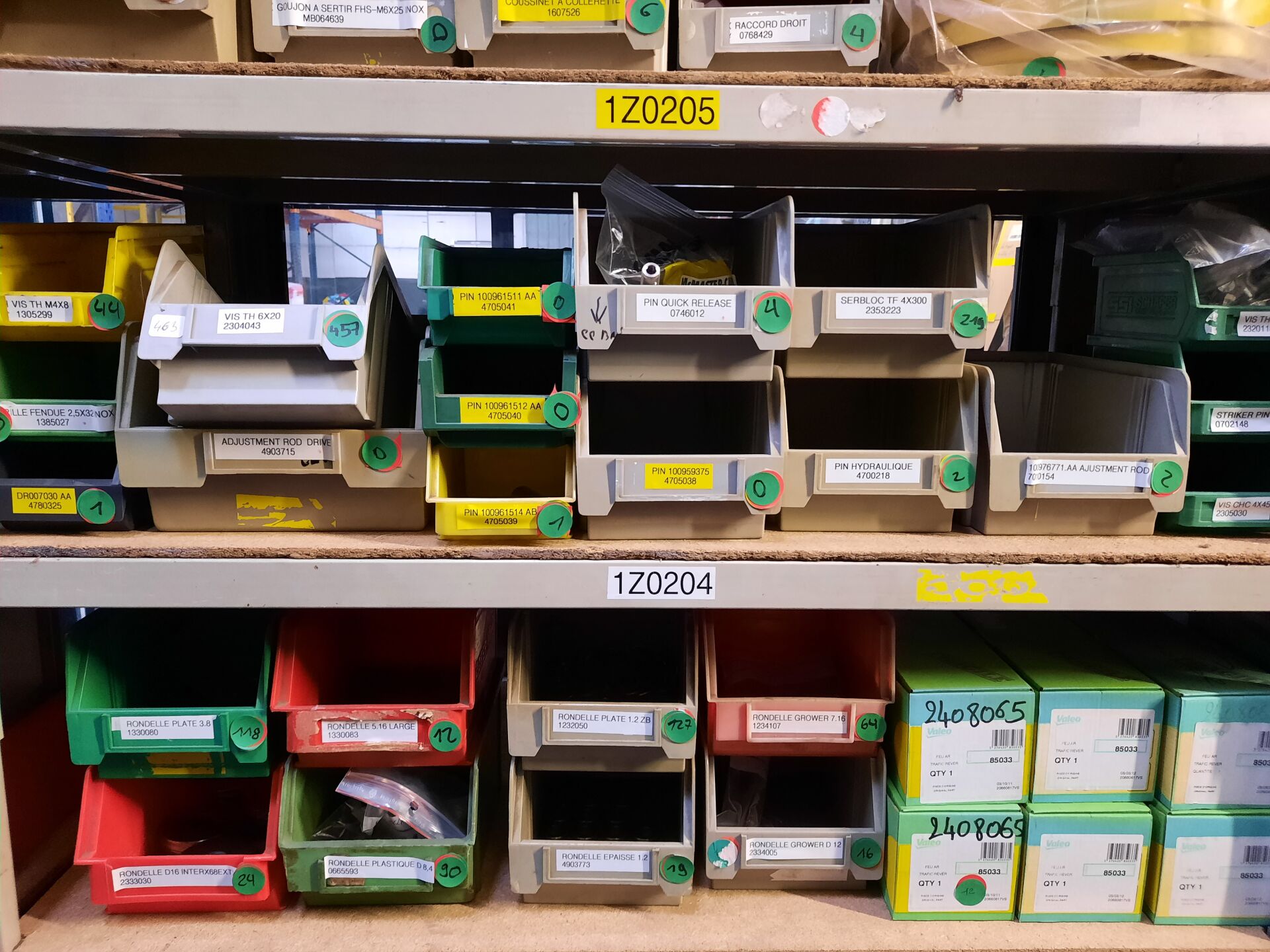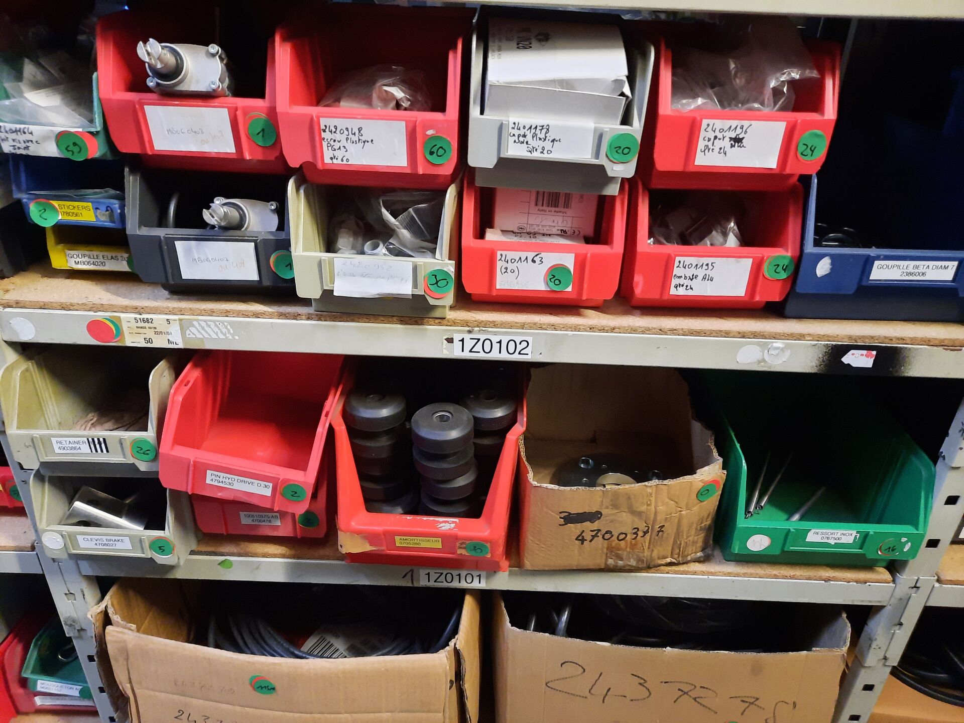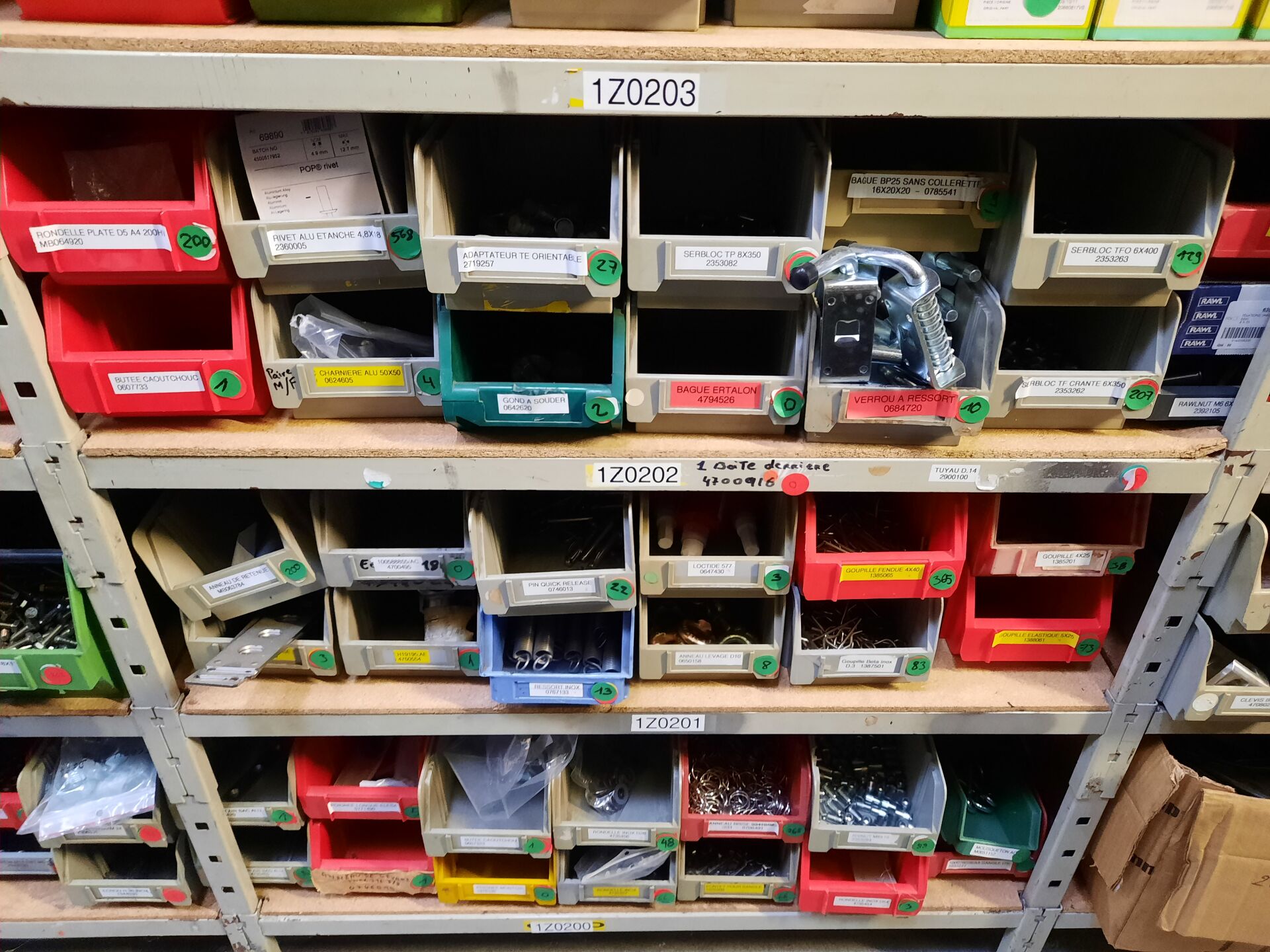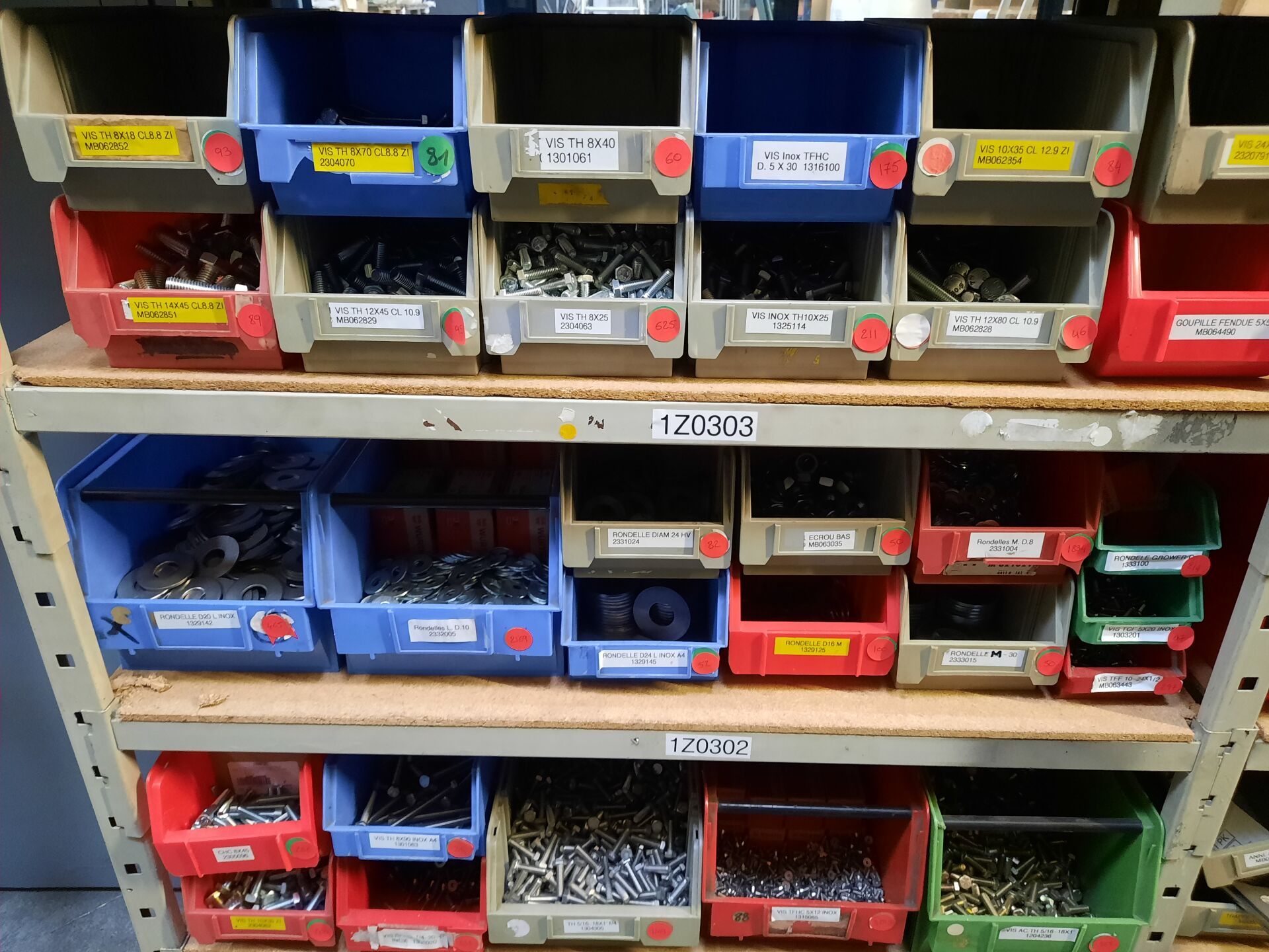 Dans les étagères 1 Z 00 [...] à 1 Z 05 [...] Stock de quincaillerie dont écrous, vis, rondelles, goujons, rivets, fils et câbles électriques....