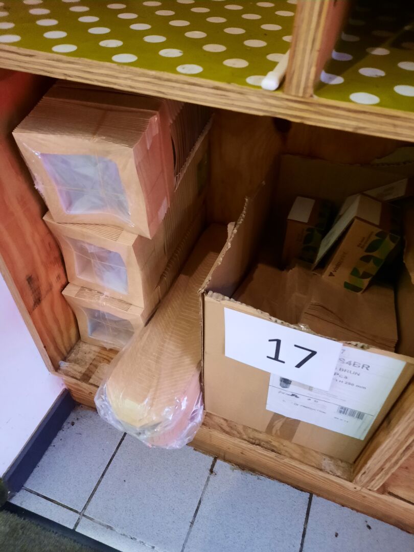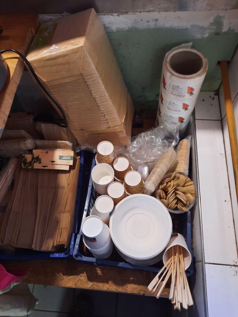 Lot de gobelets, boites en carton, couverts en bois