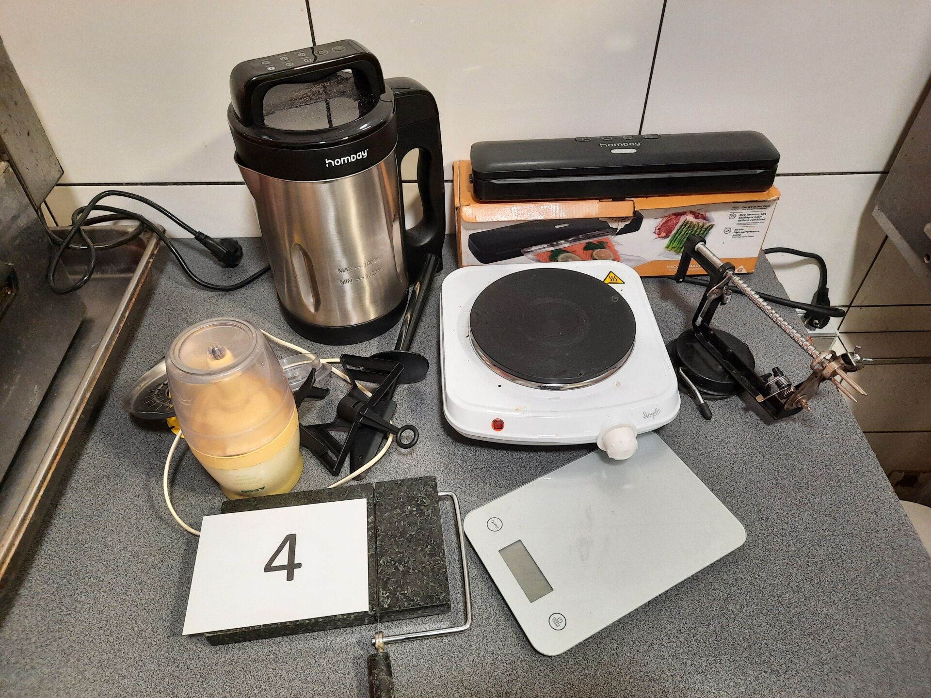 Ensemble d'électroménagers en l'état comprenant : Hachoir SEB Blender chauffant HOMDAY modèle 554854 Machine à soupe Balance ménagère (Max. : 5 kg - Delta : 1g) Coupe fromage Pèle pommes Machine de mise sous vide HONDAY Plaque électrique, 1 feu