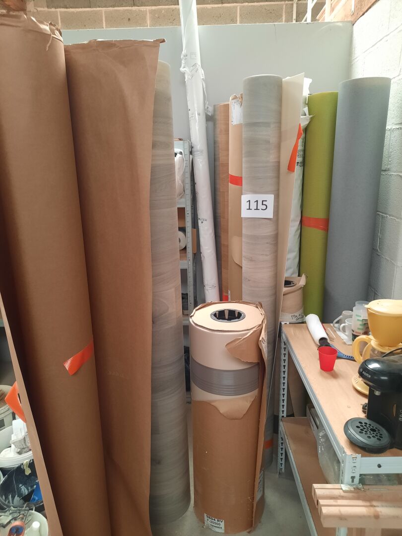 Environ 18 rouleaux de sol PVC (tailles et coloris divers) dont entamés