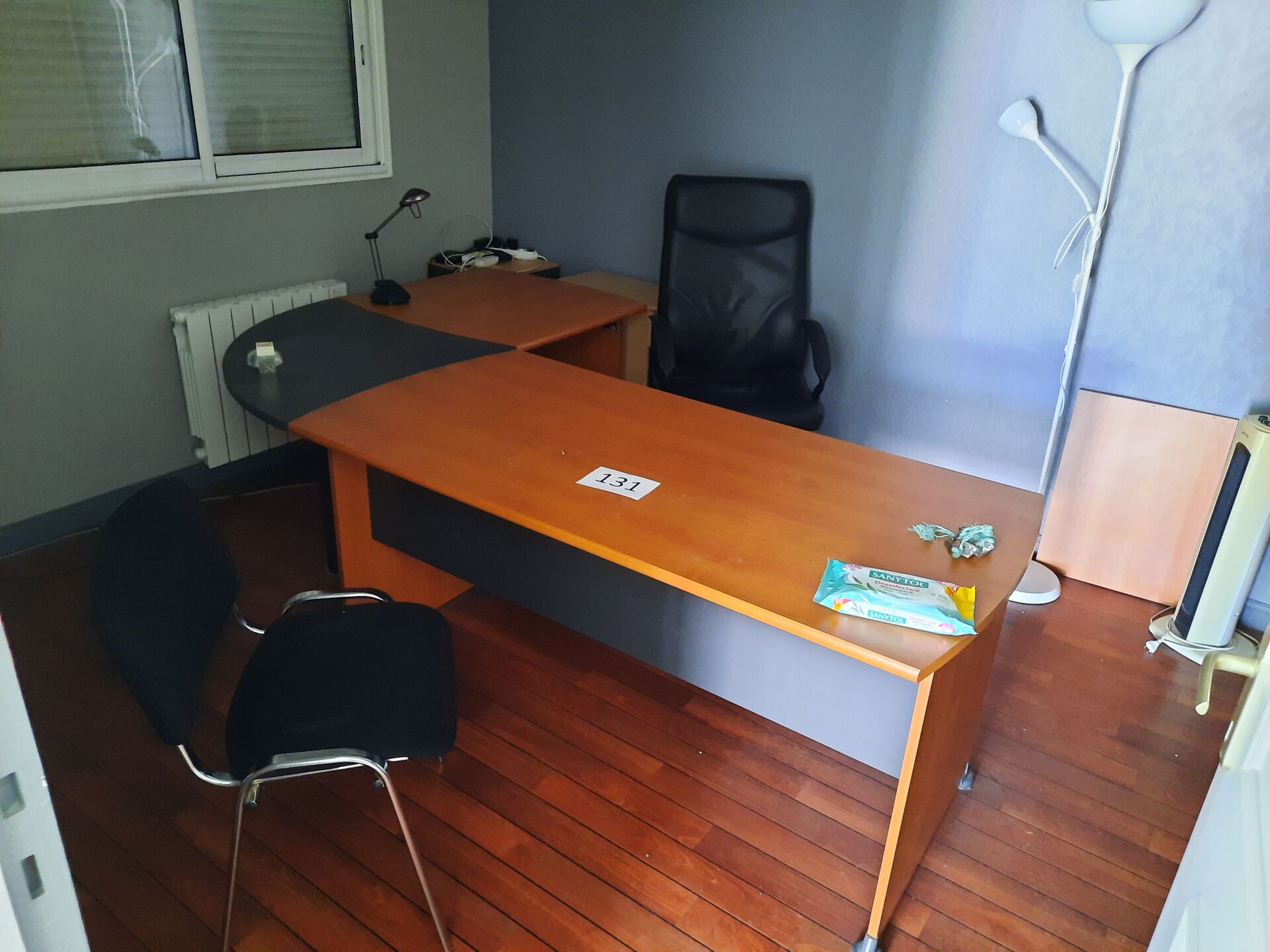 Ensemble de mobilier comprenant : Bureau en mélaminé façon bois Bureau ergonomique en mélaminé façon bois 2 caissons bas dépareillés Fauteuil de direction, assise cuir noir Chaise visiteur, assise tissu noir Lampe de bureau en métal laqué noir Lampadaire à 2 lumières en métal laqué blanc Ventilateur LERVIA