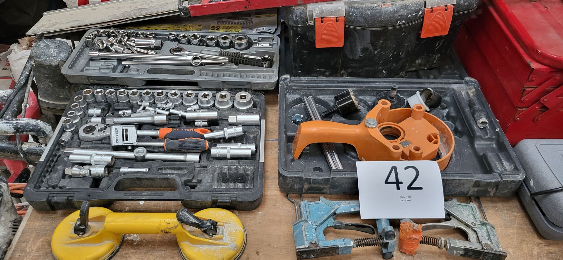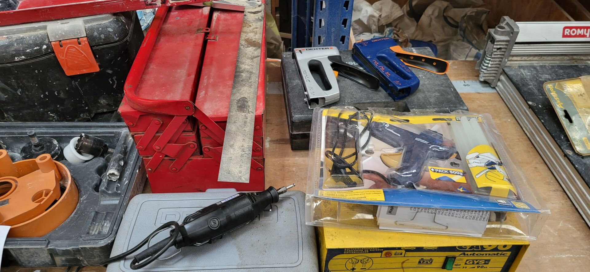 1 coffret à douilles DEXTER incomplet 1 ventouse 2 étais télescopiques WURTH 1 chargeur de batterie GYS CA 90 1 coffret de clés à douilles (incomplet) , 1 caisse à outils métal rouge, 1 caisse à outils PVC, 1 guide de forage RUBI, 1 DREMEL, 2 agrafeuses DEXTER, 1 pistolet à colle RAPID etc