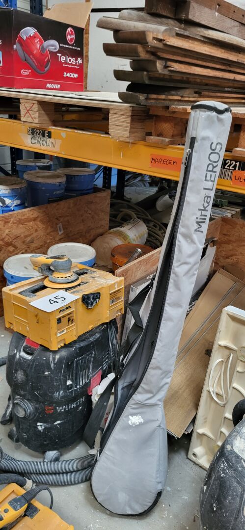 1 ponceuse girafe LEROS MIRKA sans modèle apparente dans sa housse 1 ponceuse MIRKA DEROS 5650CV, en coffret 1 aspirateur eau et poussière WURTH