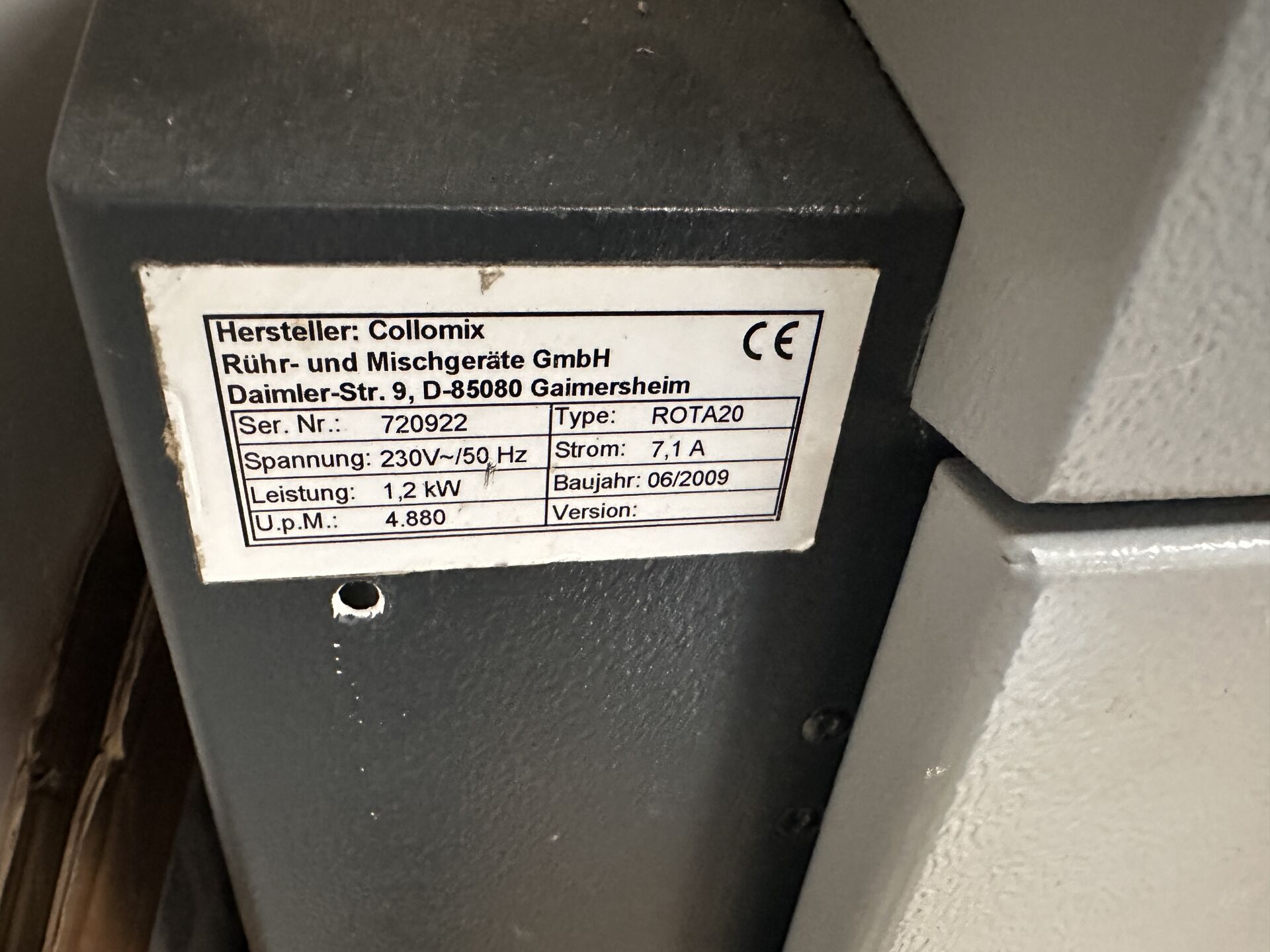 1 mélangeur giroscopique COLLOMIX type ROTA20 n°720922 (73 x 80 x 106 cm) Vendu sur désignation le 29 04 2026 à 14h30 à LA CHAPELLE S ERDRE, visible sur RDV à NANTES (Viarme) le 29/04/26 à 13h , enlèvement le 06/05/26 à 9h, frais de mise à disposition 10 € TTC par lot