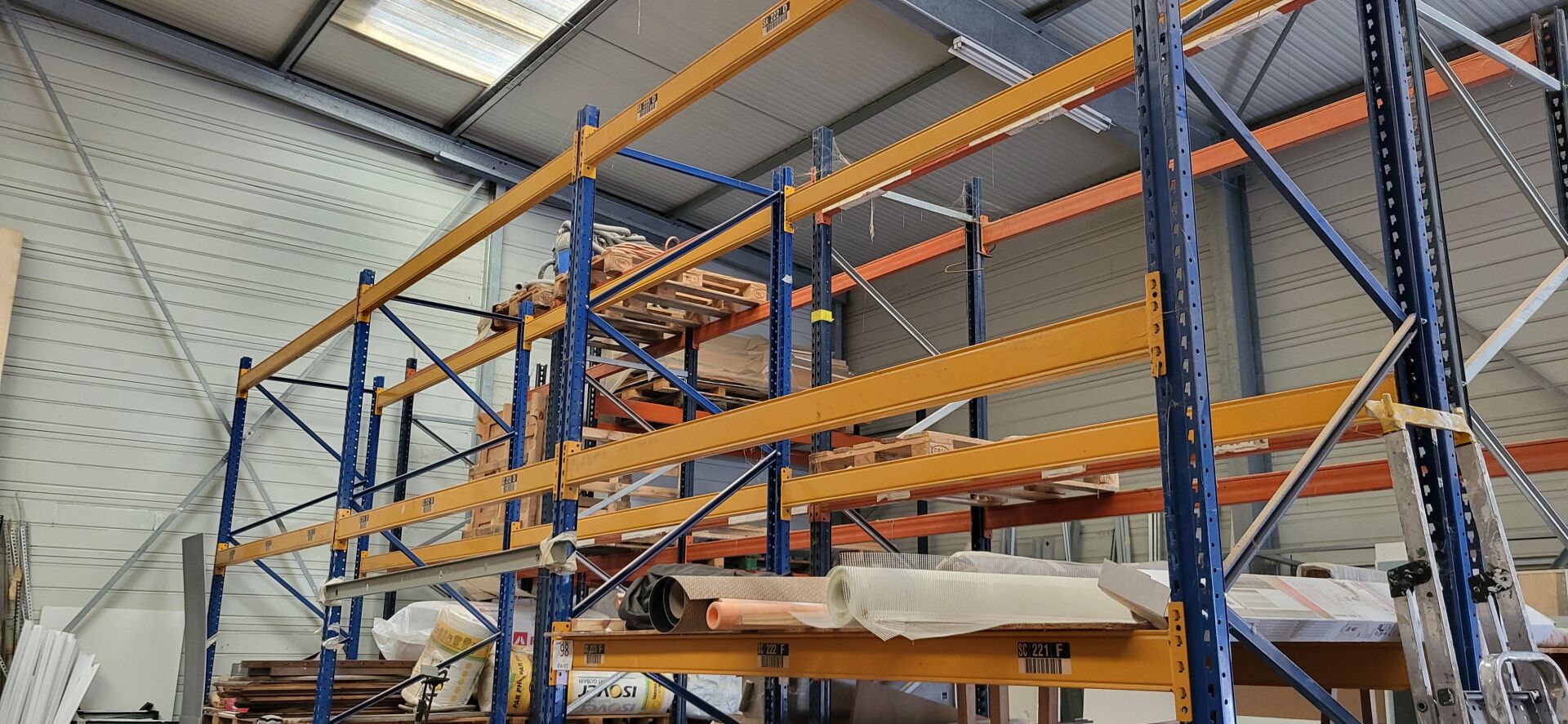 3 modules de racks métal bleu et jaune comprenant 4 échelles 110 x 400 cm et 20 lisses de 270 cm