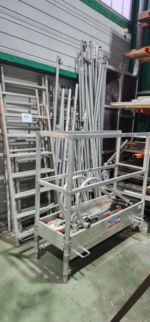 Divers éléments d'échafaudage dépareillés dont DUARIB et ALTRAD comprenant : 2 plateaux à trappe 250 x 57 cm , 9 échelles, environ 10 lisses etc