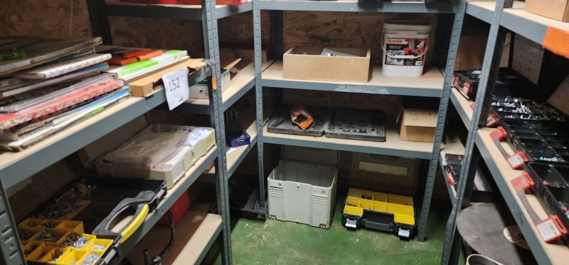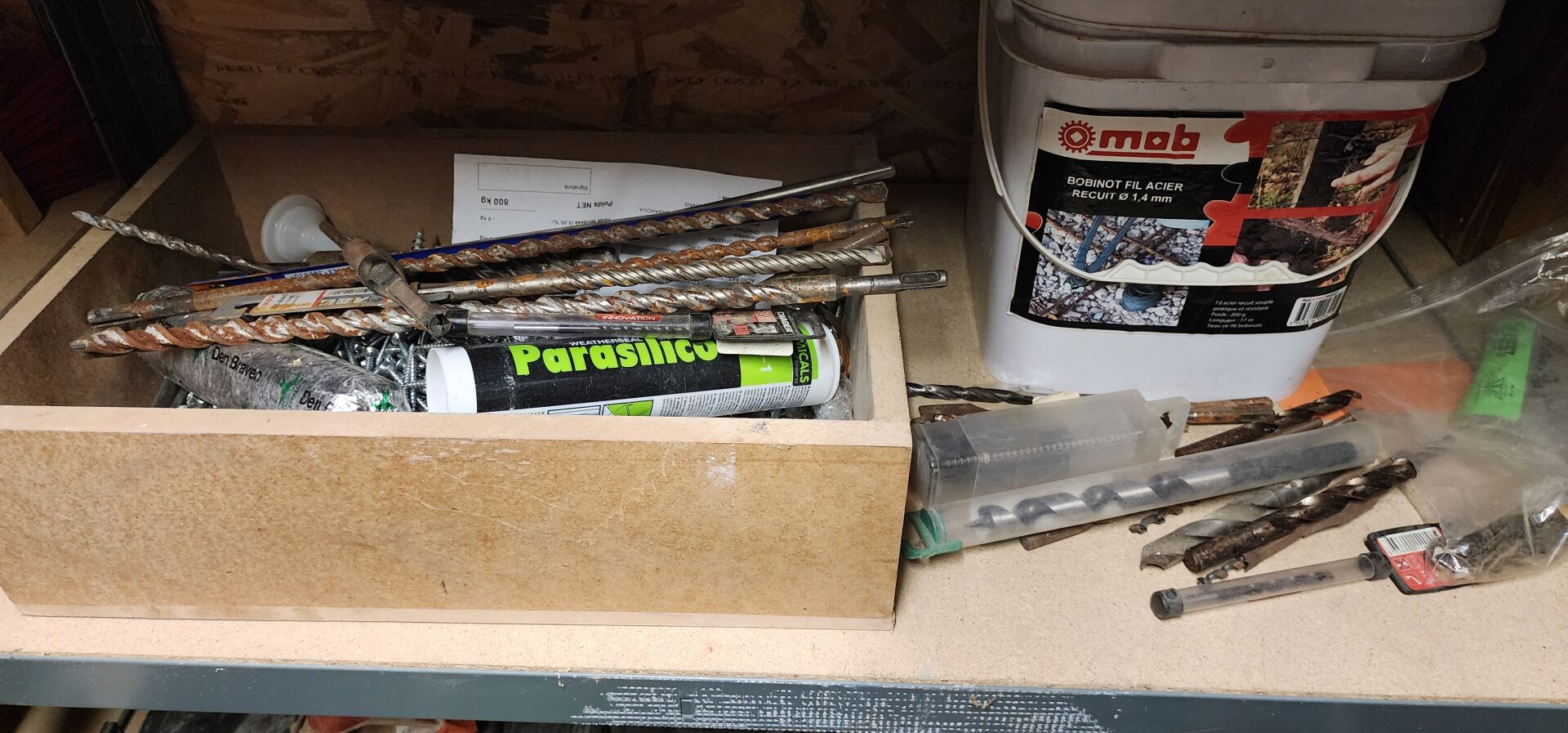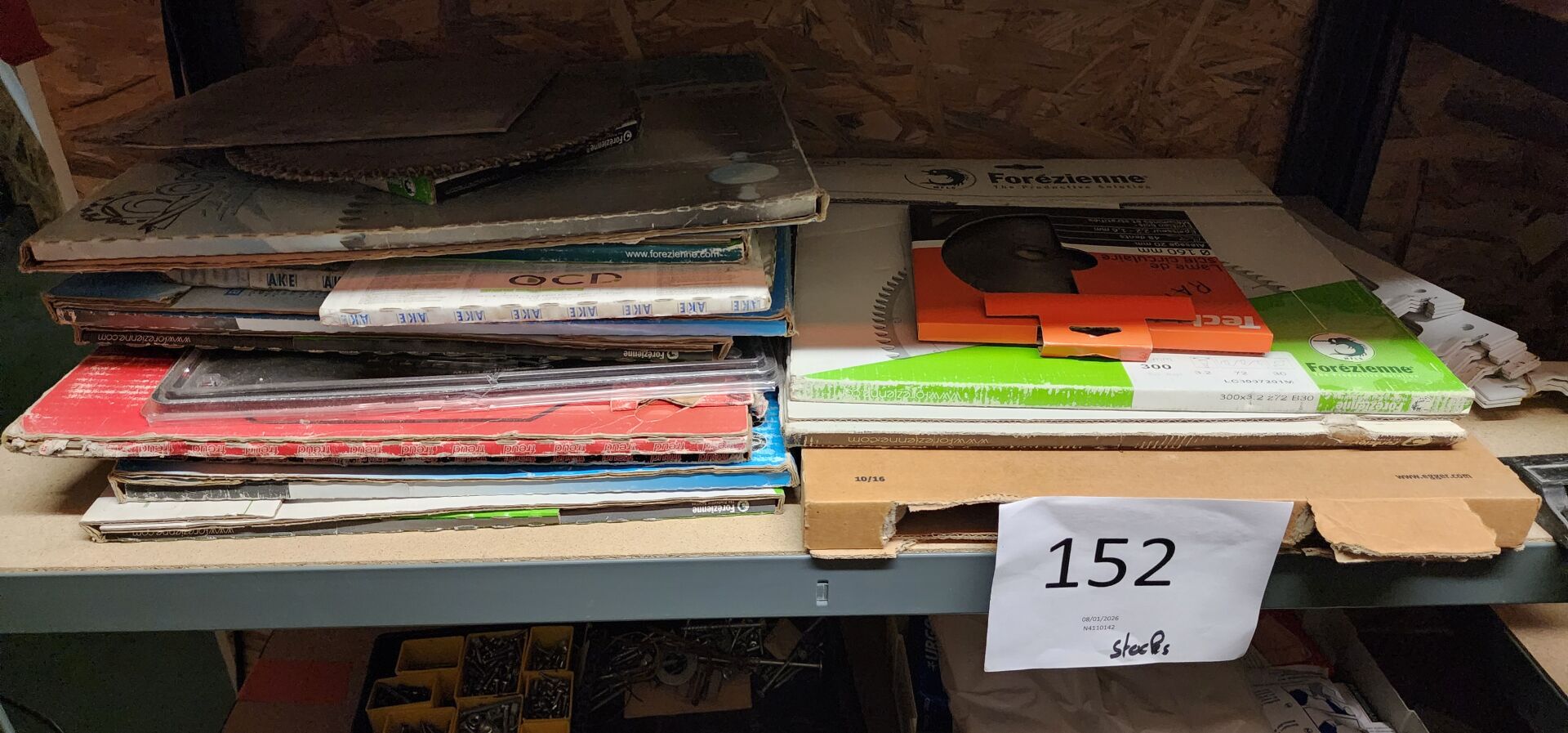 Dans un local : 1 lot de quincaillerie et de consommables divers comprenant : lames de scie, forets, disques, coffrets de visserie etc