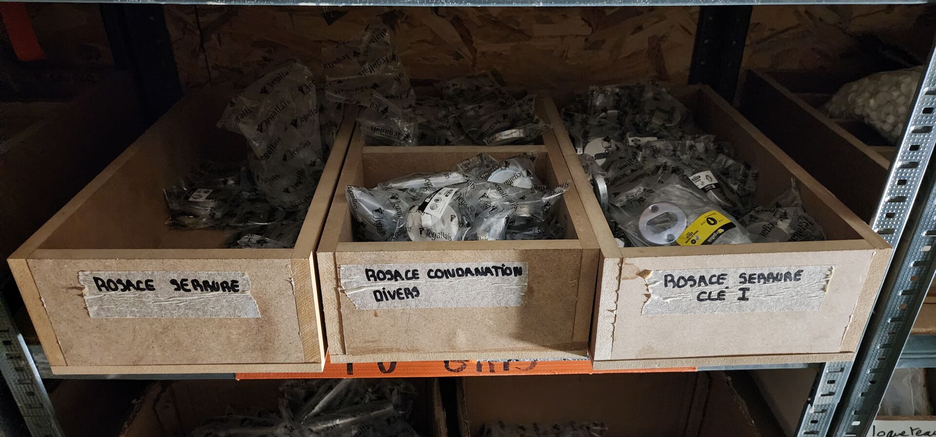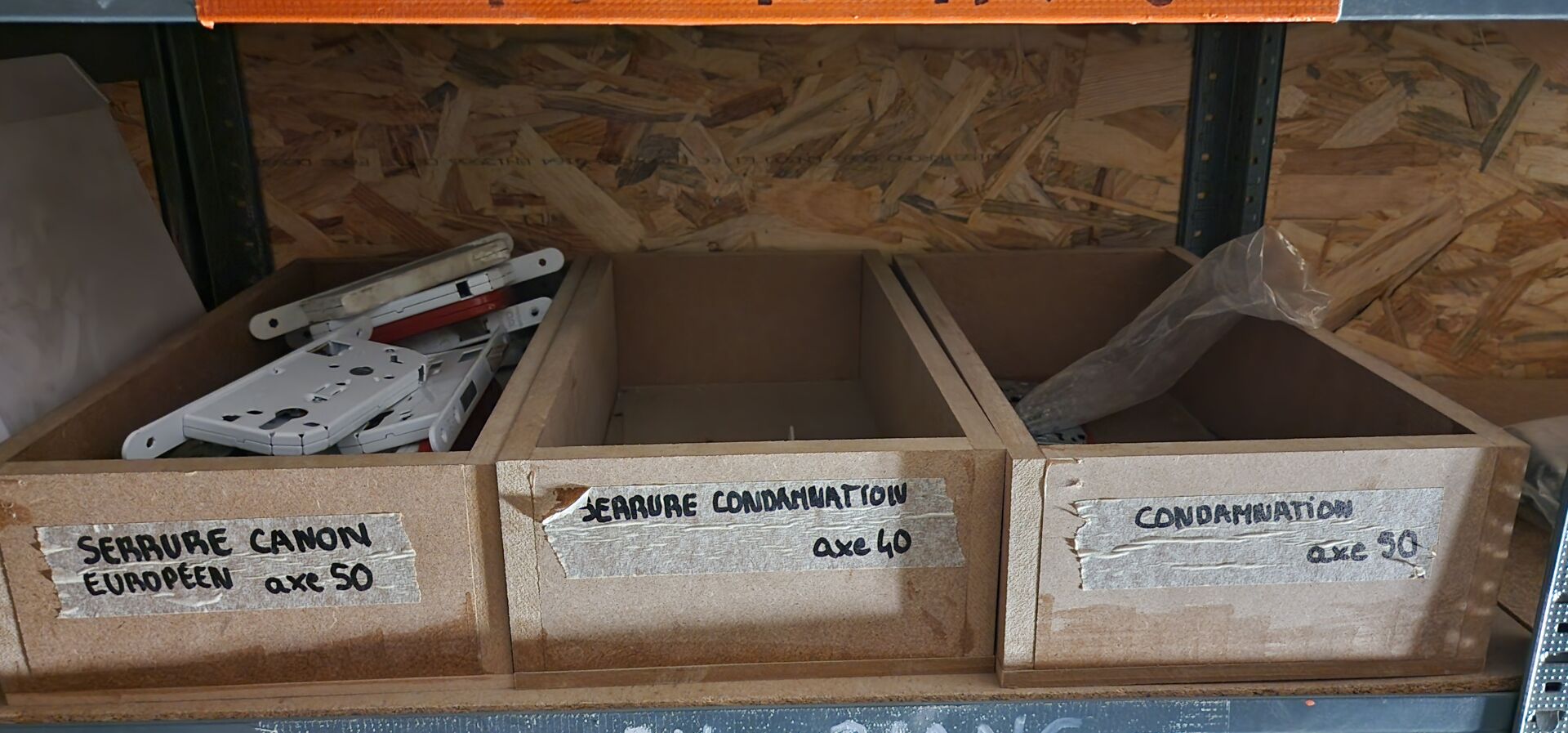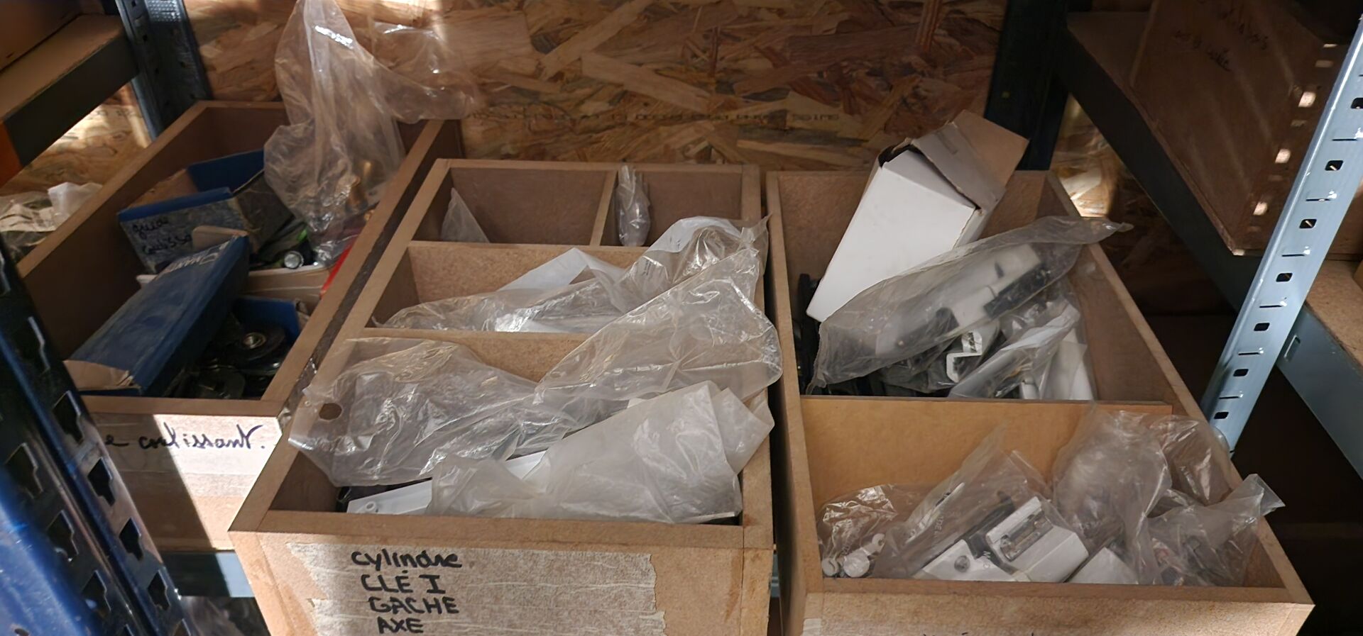 Dans un local : 1 stock de quincaillerie pour la menuiserie comprenant : poignées de porte d'intérieur, serrures, paumelles, quincaillerie volets roulants, grille de ventilation etc