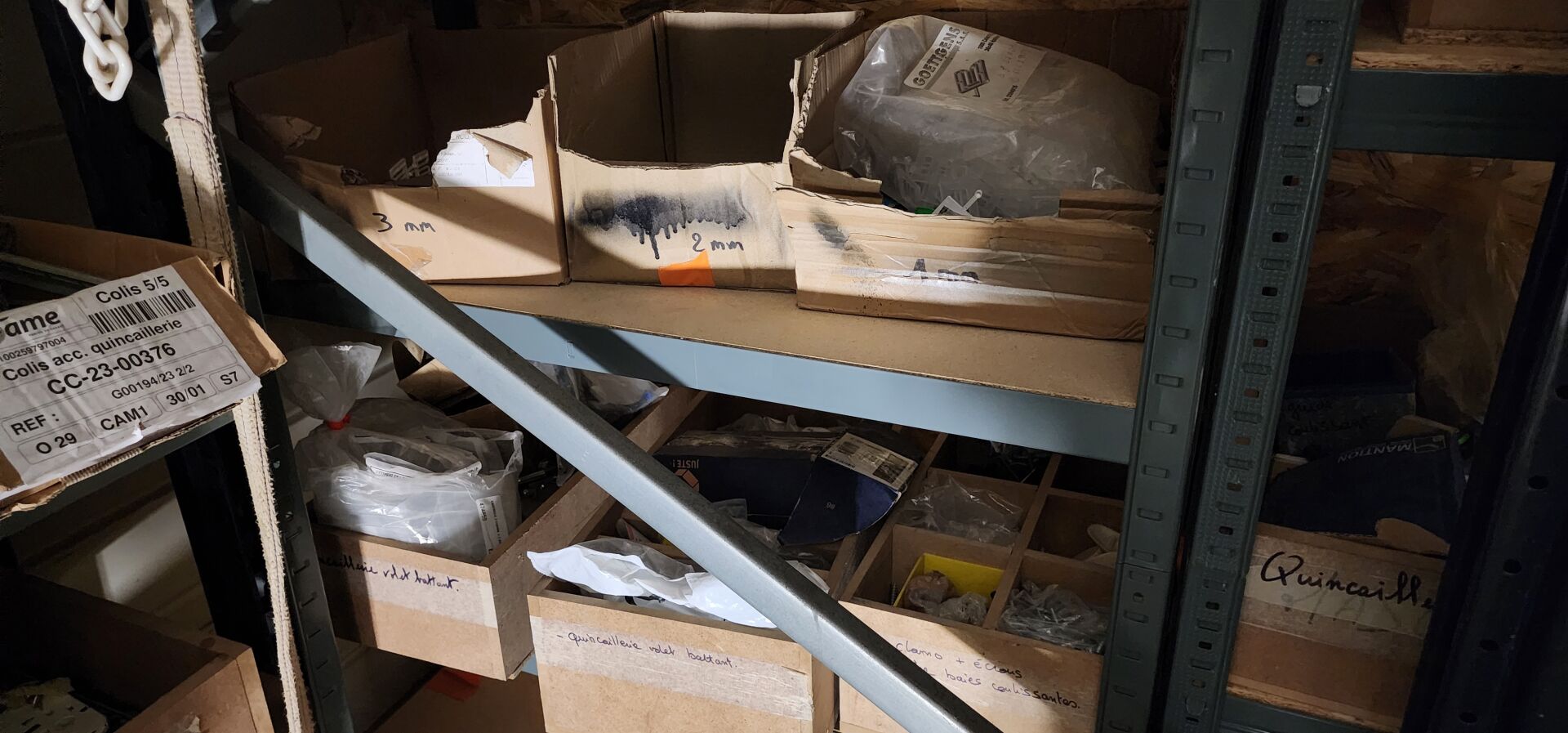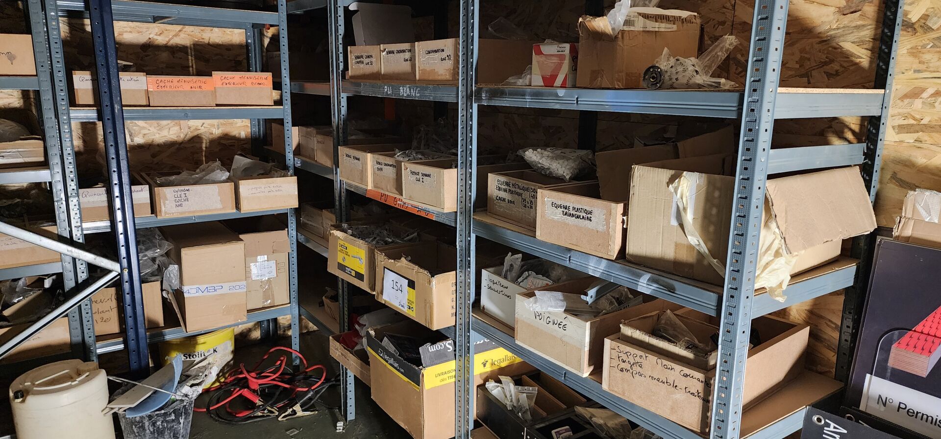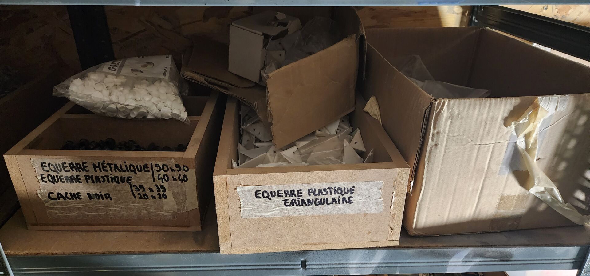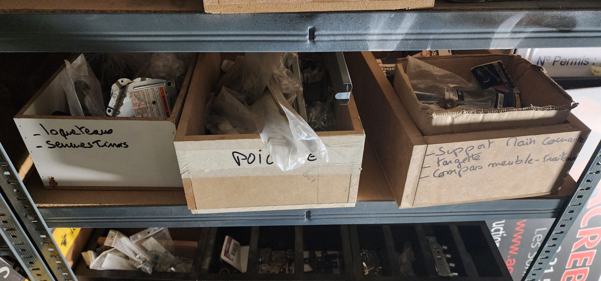 Dans un local : 1 stock de quincaillerie pour la menuiserie comprenant : poignées de porte d'intérieur, serrures, paumelles, quincaillerie volets roulants, grille de ventilation etc