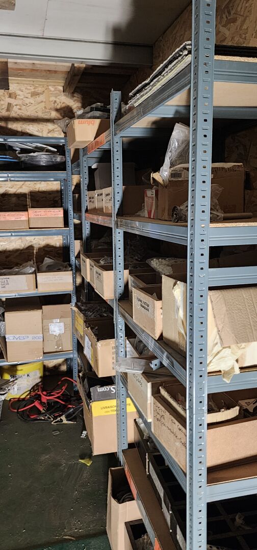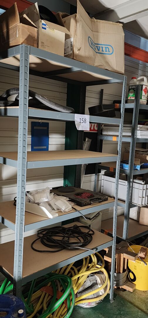 7 modules d'étagères 5 niveaux en acier plateau bois en 100 x 50 x 198 cm ou 90 x 50 x 198 cm + 1 étagère en acier 4 niveaux (vendu sans le contenu)