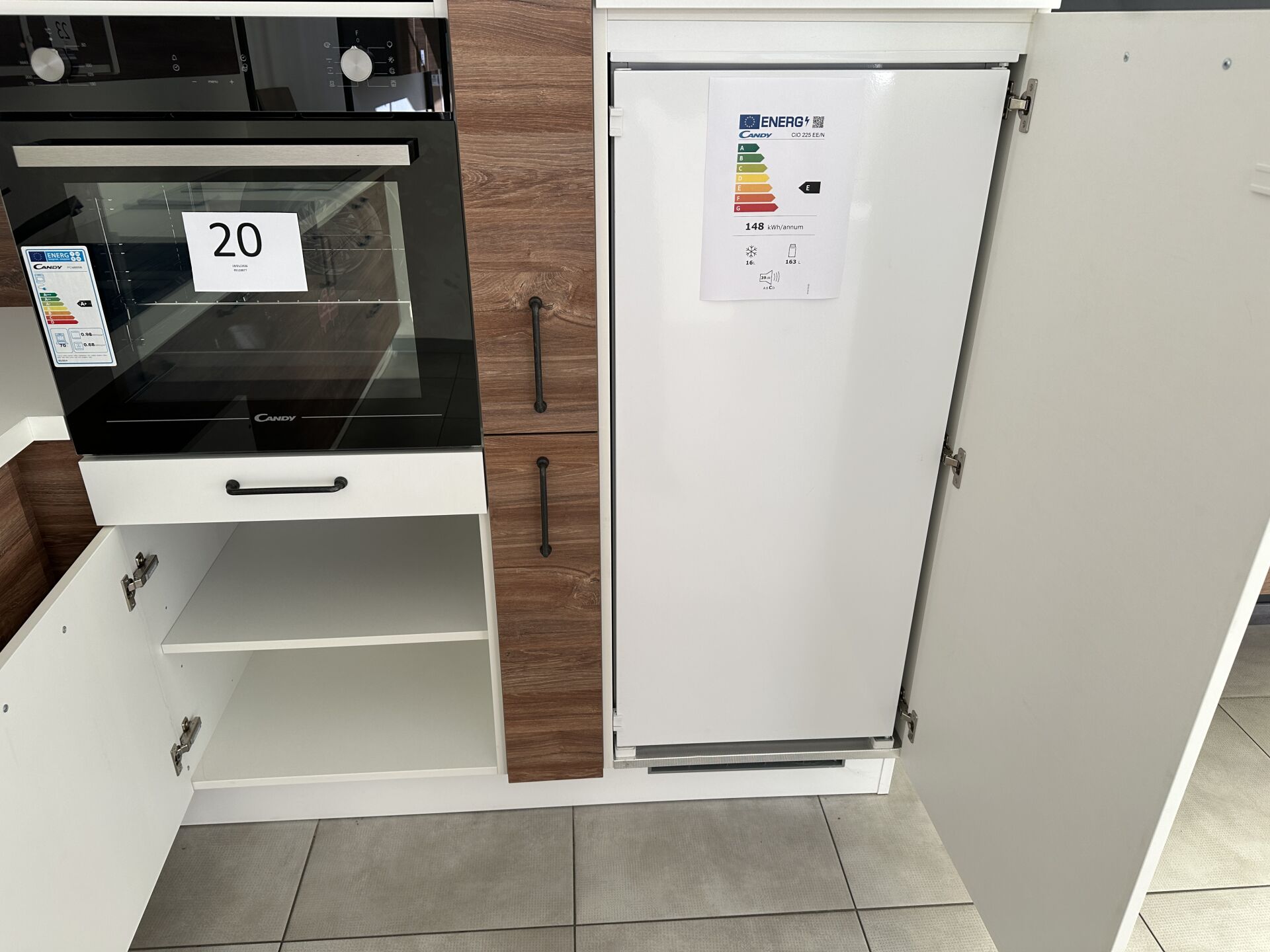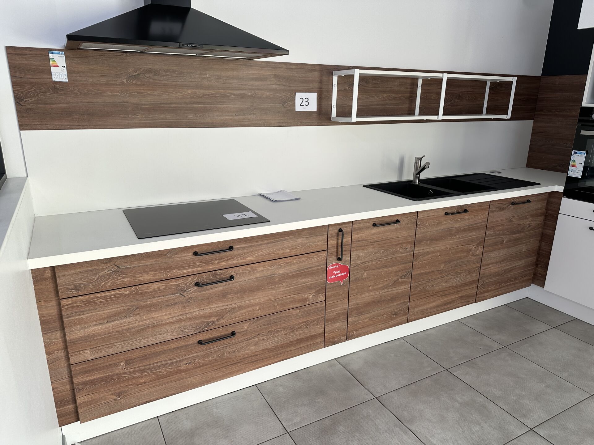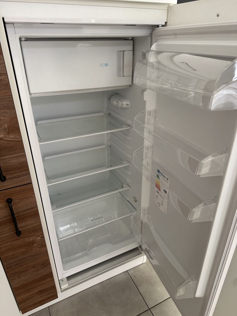 1 cuisine d'exposition TREND OSANI OAK posée en angle mélaminé façade bois/blanc, évier 2 bacs/1 égouttoir composite noir et robinetterie FRANKE avec douchette , 366 x 336 cm, profondeur plan de travail 62 cm , étagère murale métal blanc 140 x 22 x 30 cm , 1 suspension abat-jour PVC blanc Prix de vente affiché TTC (sans électroménager) : 10.517 € QFiche détaillée disponible à l'étude. 1 réfrigérateur encastrable 1 porte CANDY 163 L VIO 225EE/N (dont congélateur de 16L) Prix vente TTC affiché : 515 €