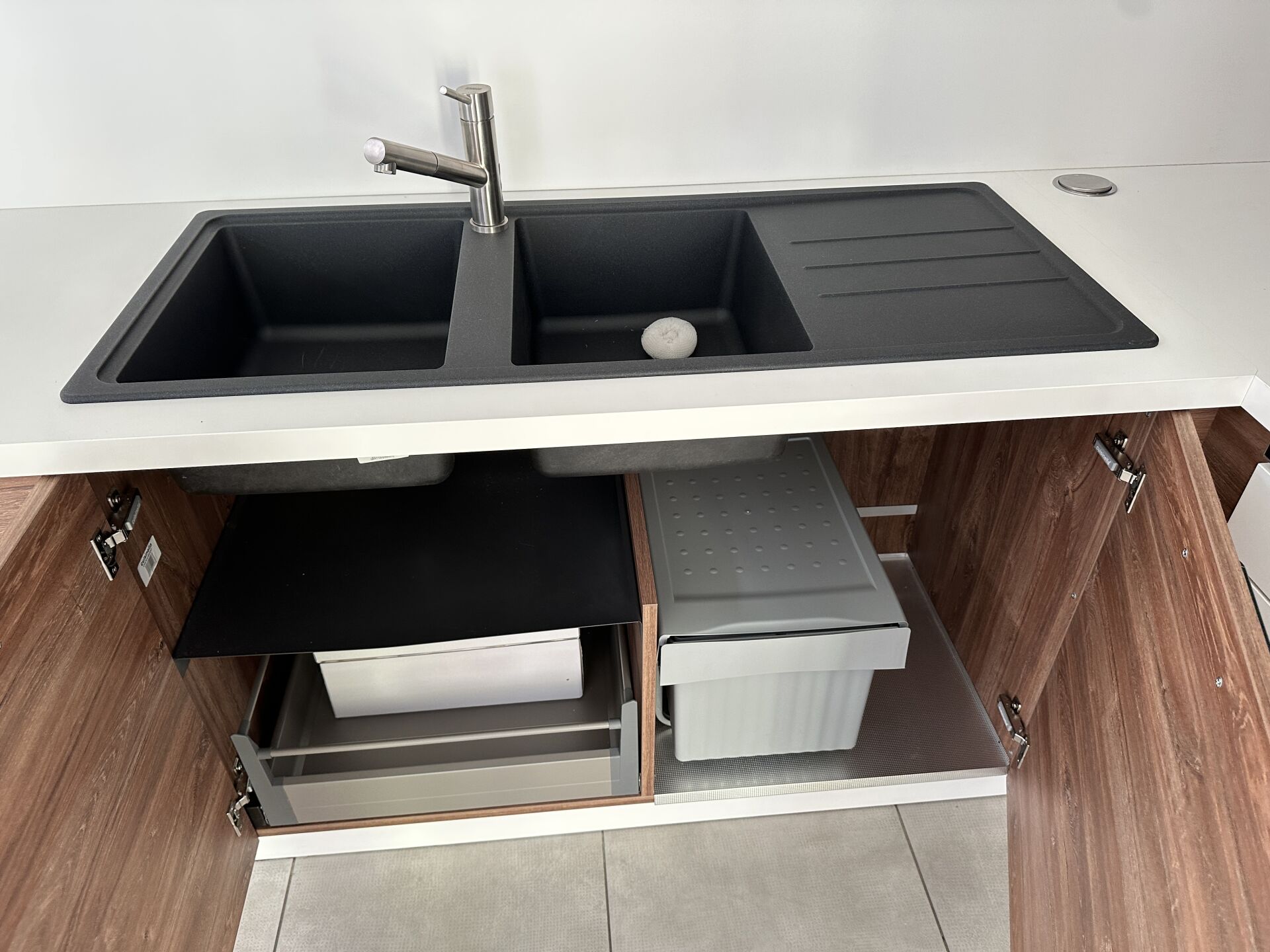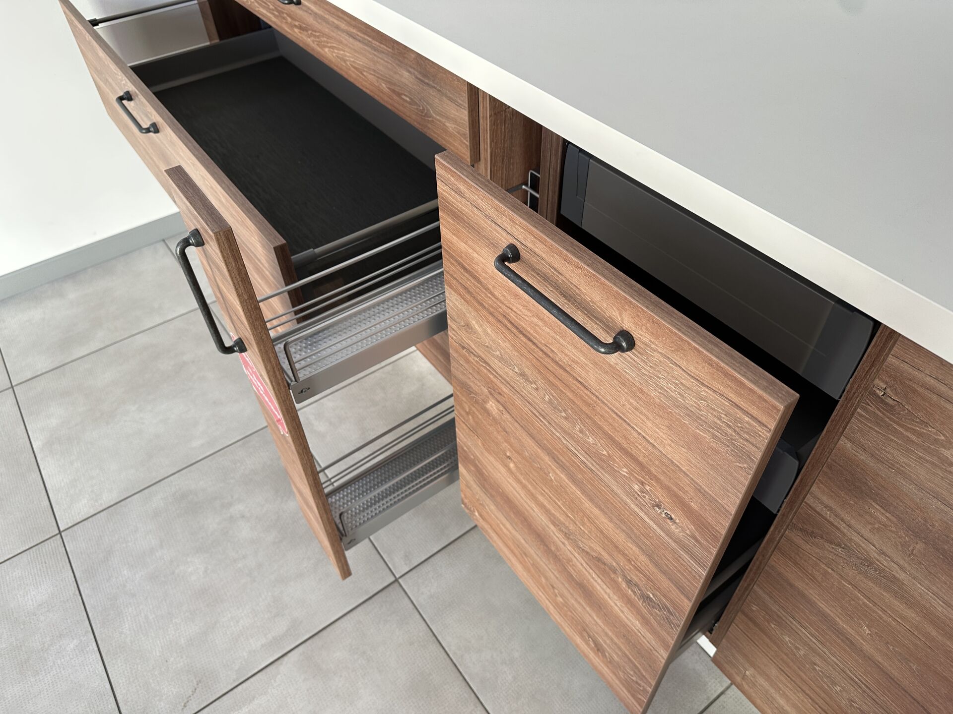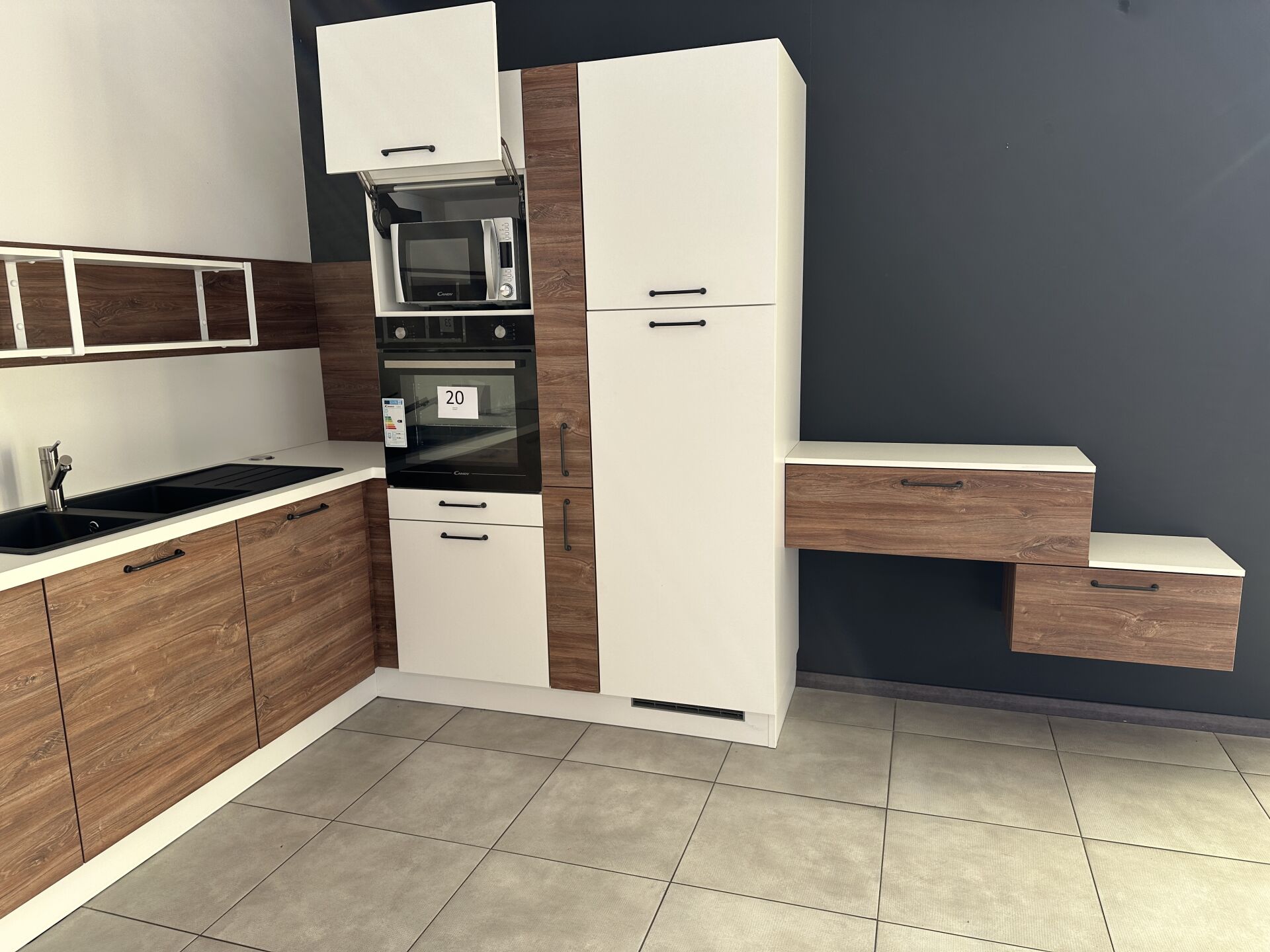 1 cuisine d'exposition TREND OSANI OAK posée en angle mélaminé façade bois/blanc, évier 2 bacs/1 égouttoir composite noir et robinetterie FRANKE avec douchette , 366 x 336 cm, profondeur plan de travail 62 cm , étagère murale métal blanc 140 x 22 x 30 cm , 1 suspension abat-jour PVC blanc Prix de vente affiché TTC (sans électroménager) : 10.517 € QFiche détaillée disponible à l'étude. 1 réfrigérateur encastrable 1 porte CANDY 163 L VIO 225EE/N (dont congélateur de 16L) Prix vente TTC affiché : 515 €