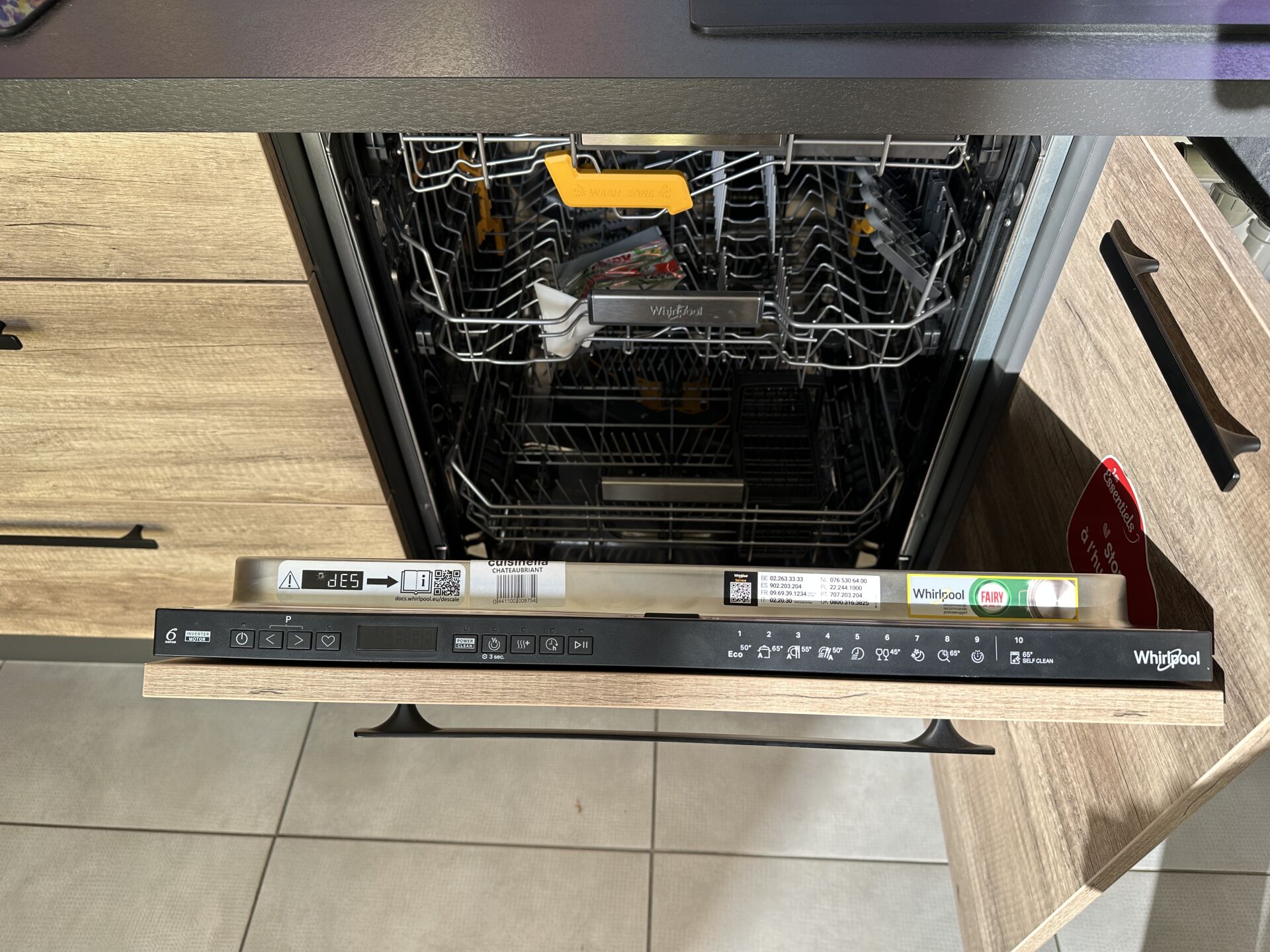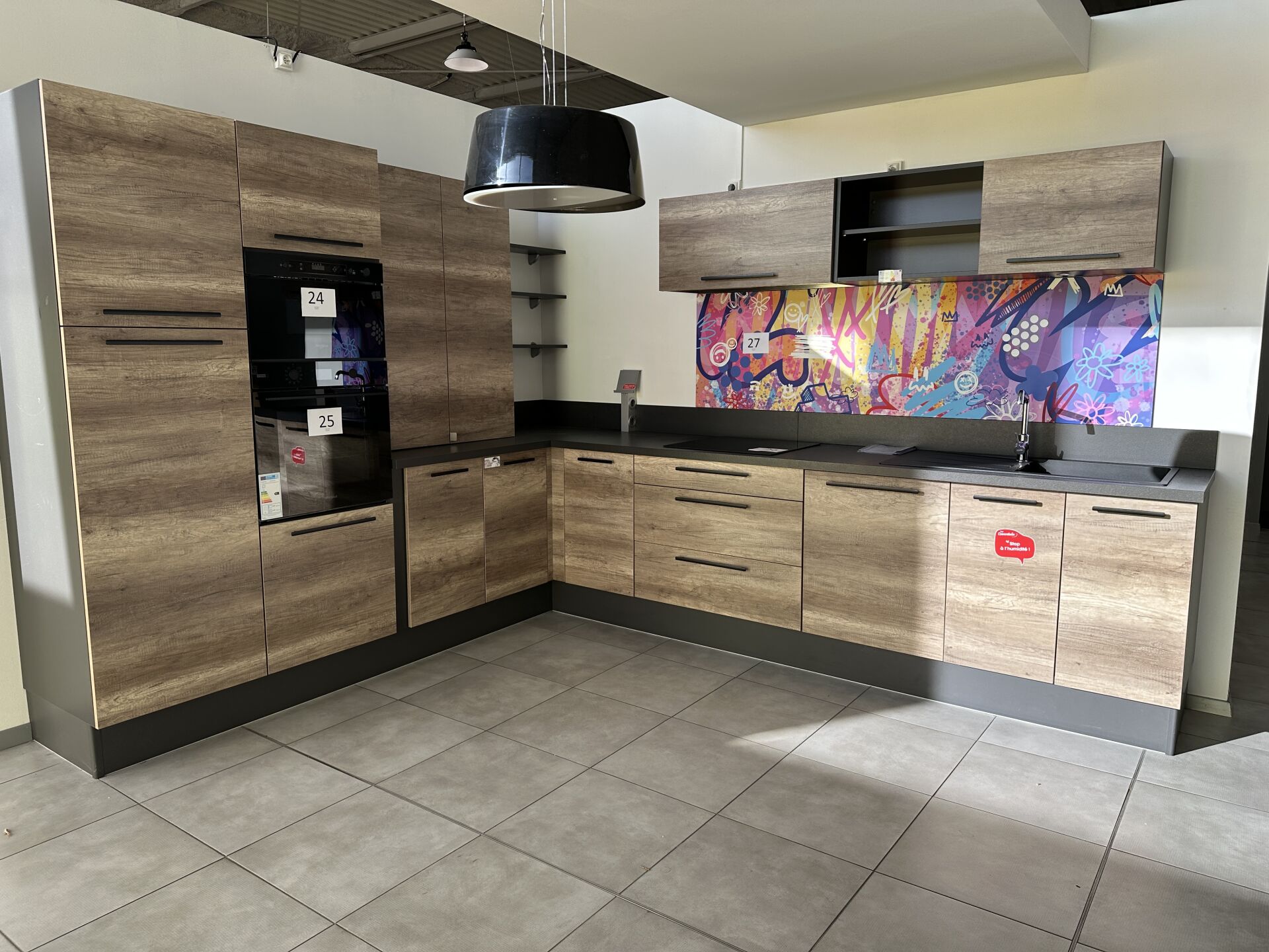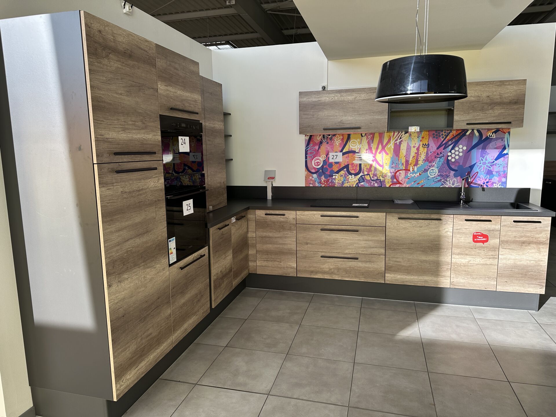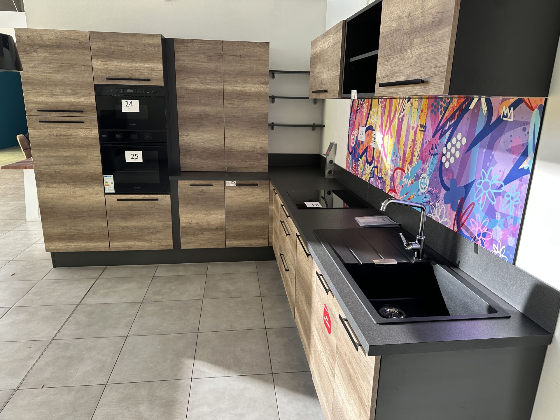 1 cuisine d'exposition TREND + WINOKA posée en angle mélaminé bois/noir avec évier 1 bac/1 égouttoir composite noir FRANKE et robinetterie FRANKE 345 x 282 cm, profondeur plan de travail 63 cm Prix de vente affiché TTC (sans électroménager) : 10.436 € Fiche détaillée disponible à l'étude. 1 suspension abat jour tôle noire laquée 1 hotte murale intégrée 90cm AIRFORCE M4056 INBOX inox 650 m3/h, Prix vente TTC affiché : 328 € 1 lave-vaisselle tout intégrable WHIRLPOOL W81HP42LSC 14 couverts, 42 dB, Prix vente TTC affiché : 839 € 1 réfrigérateur intégrable HOT¨POINT 210L S12A1D/HA1 Prix vente TTC affiché : 450 €