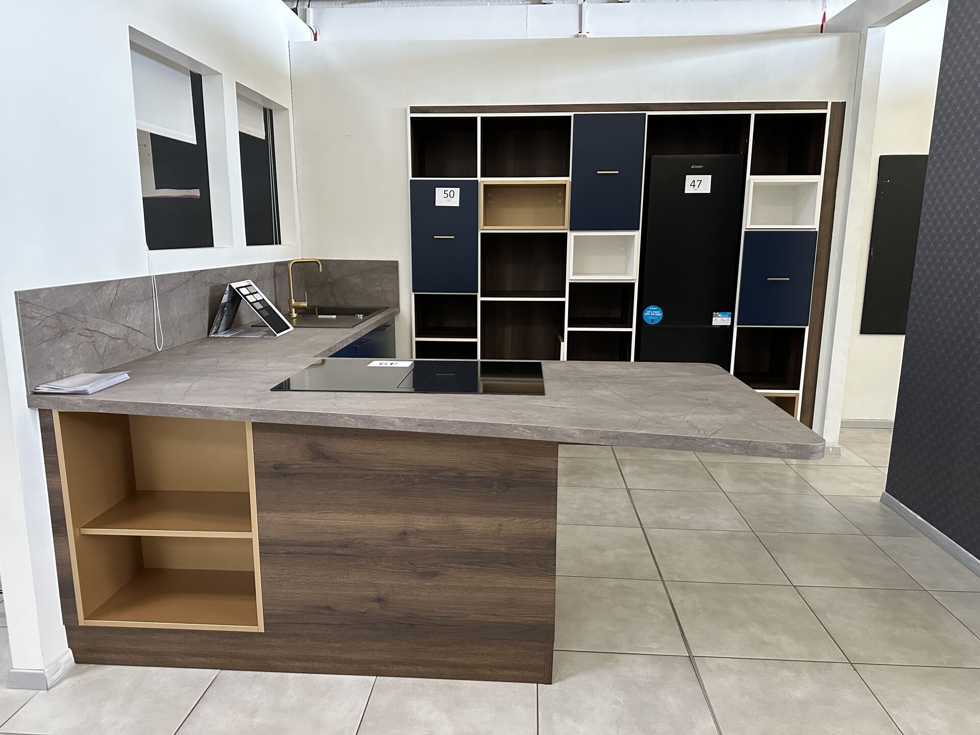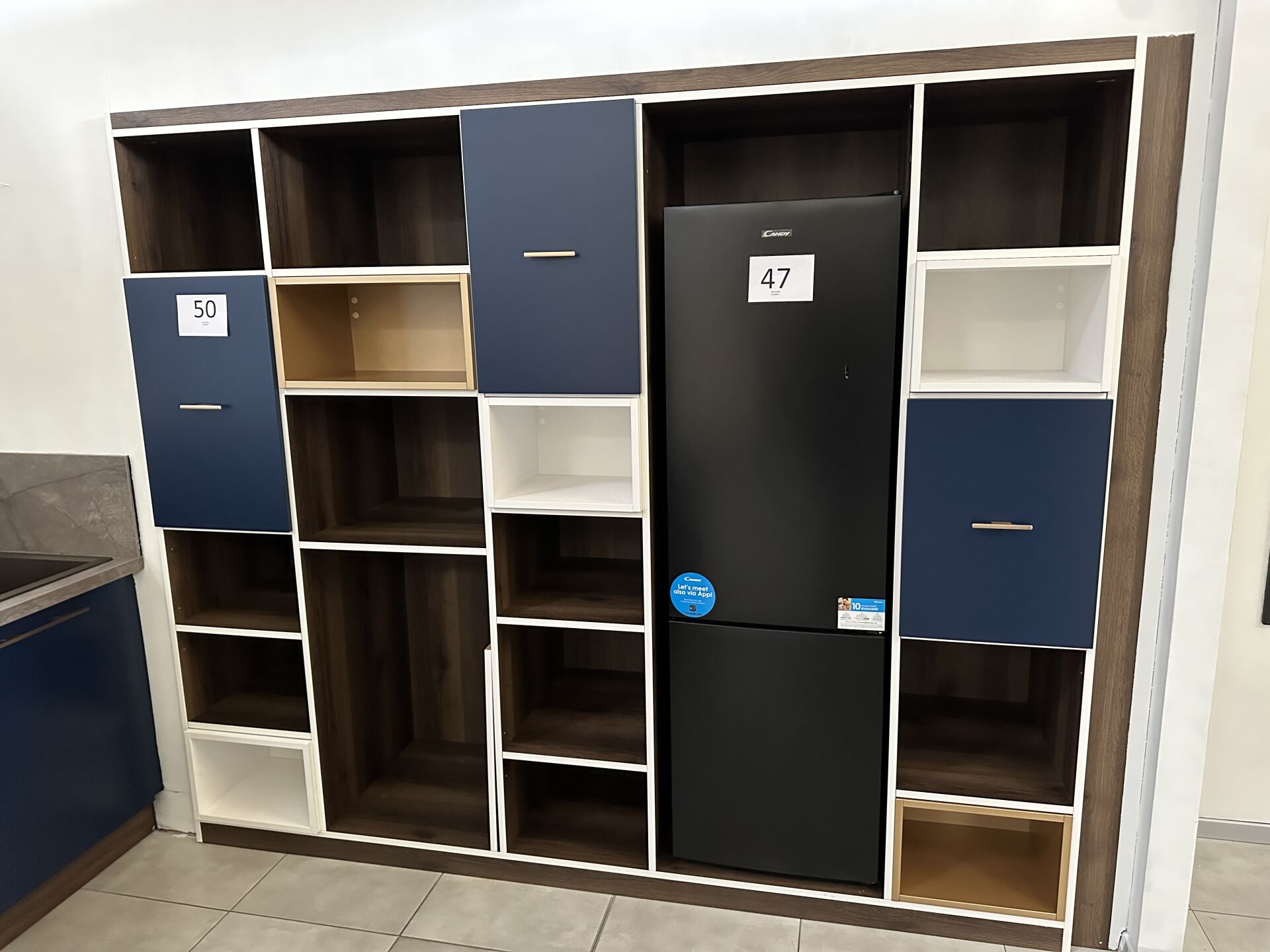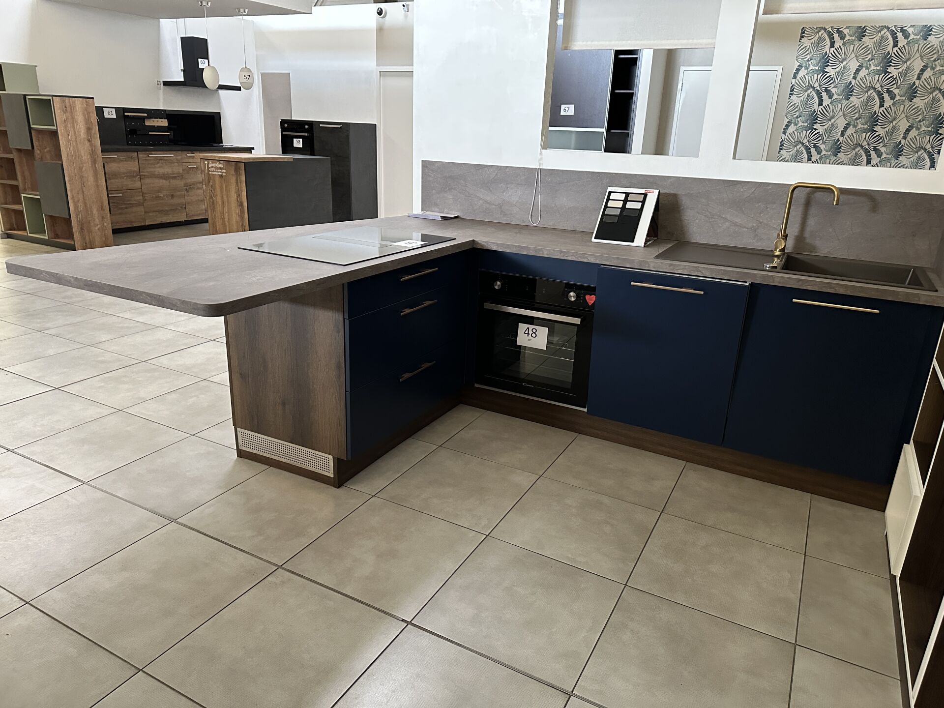 1 cuisine d'exposition TREND CHENE MOCA COLOR STORM, 280 X 215 cm, prof 62 et 100 cm, posée en "U" mélaminé, avec évier 1 bac/1 égouttoir composite brun SCHOCK et robinetterie dorée ARGO, meuble encastré 16 cases et 3 portes 250 x 213 cm Prix de vente affiché TTC (sans électroménager) : 11.623 € Fiche détaillée disponible à l'étude. 1 lave-vaisselle intégrable CANDY Rapido 13 couverts, connecté Wifi, 46dB, Prix vente TTC affiché : 636 €