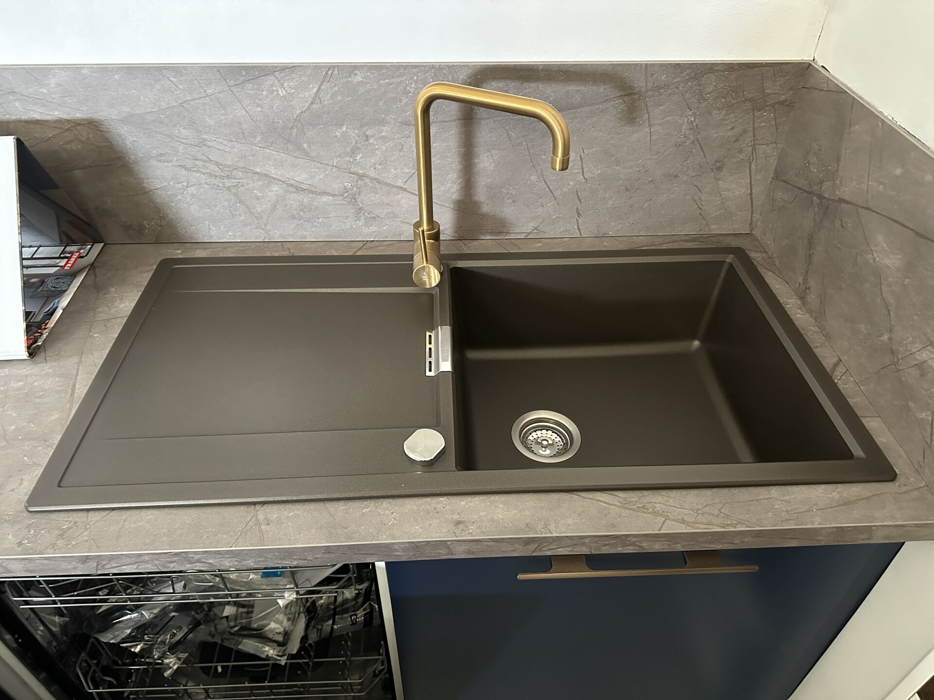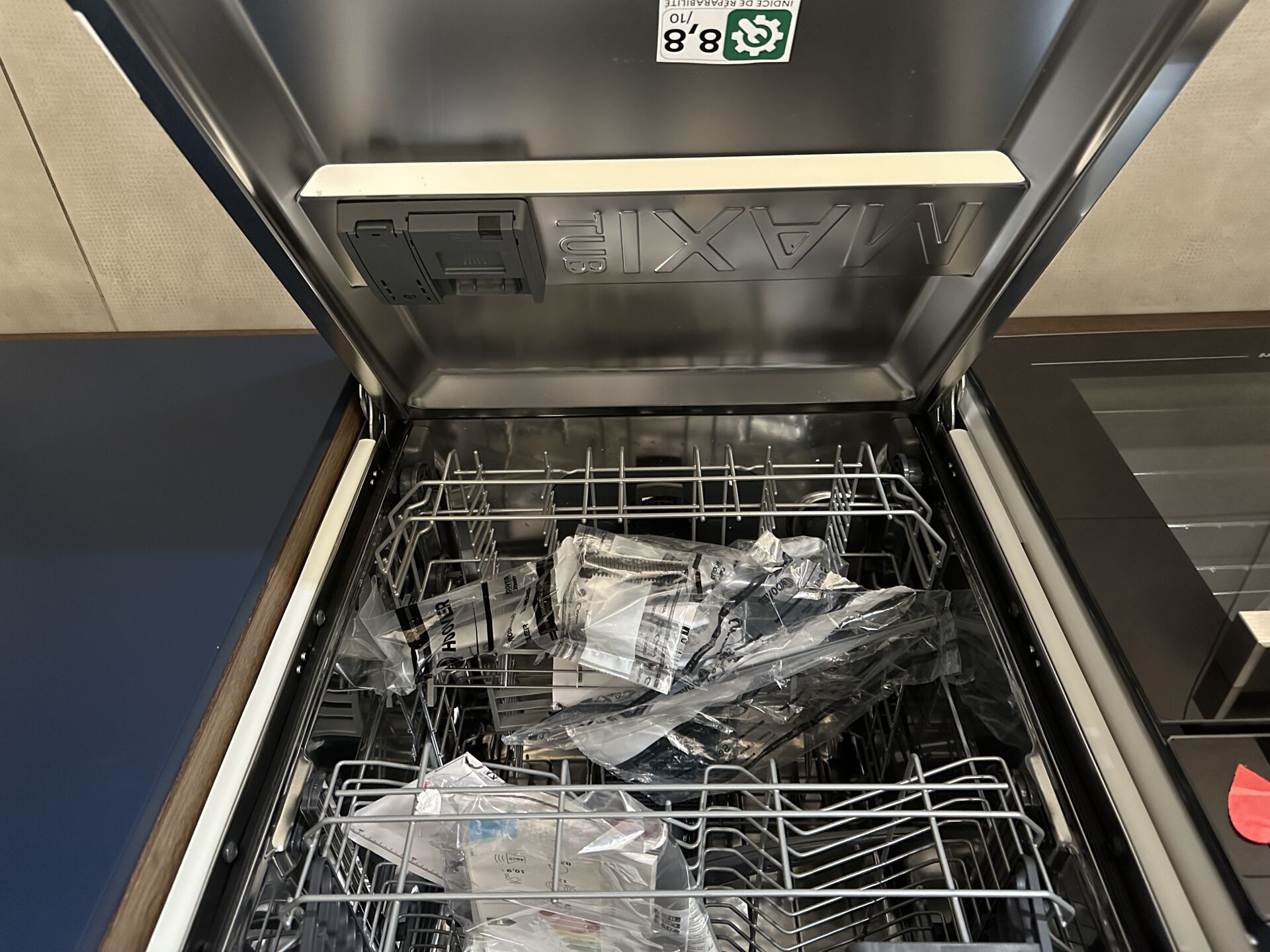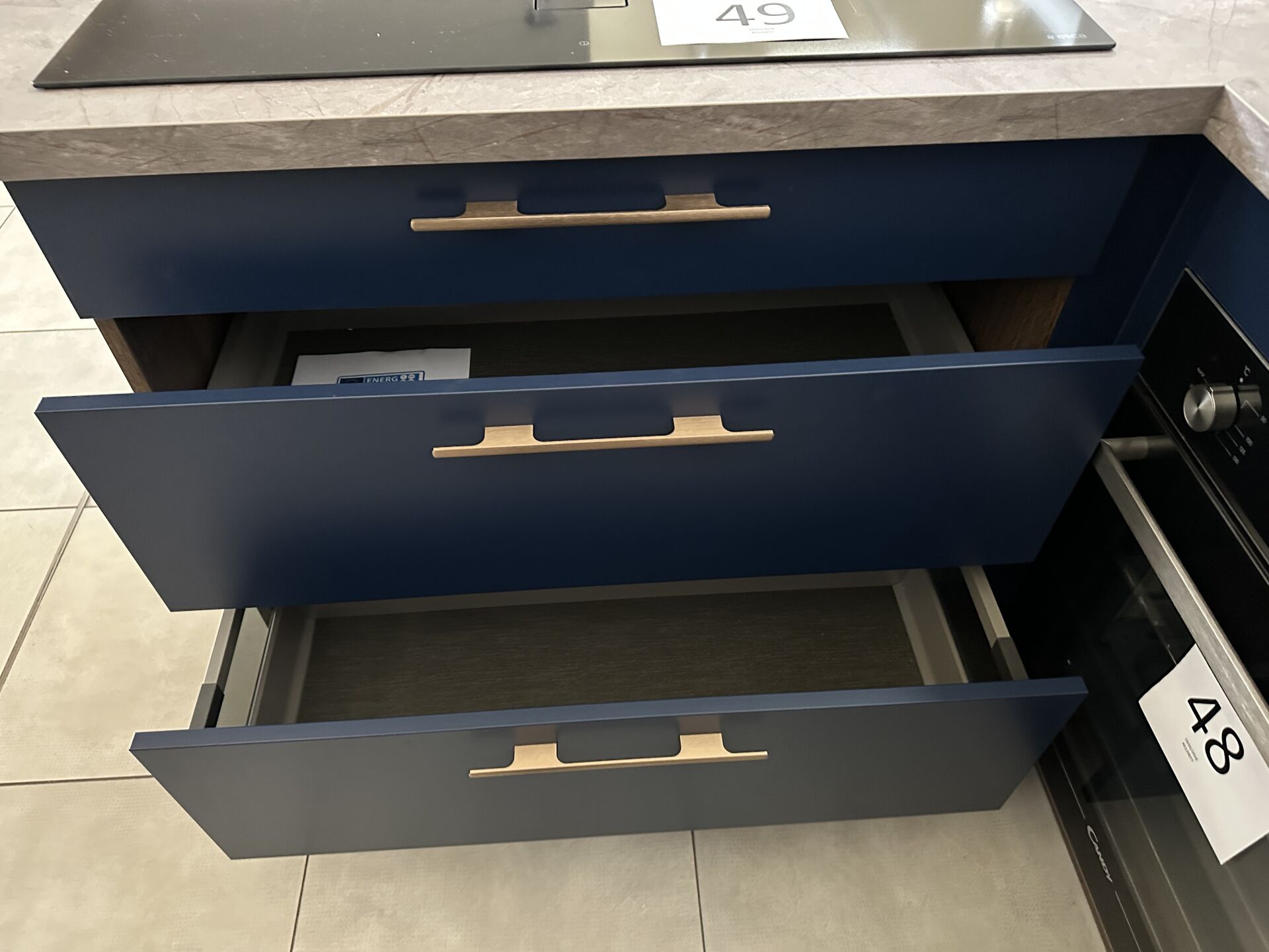 1 cuisine d'exposition TREND CHENE MOCA COLOR STORM, 280 X 215 cm, prof 62 et 100 cm, posée en "U" mélaminé, avec évier 1 bac/1 égouttoir composite brun SCHOCK et robinetterie dorée ARGO, meuble encastré 16 cases et 3 portes 250 x 213 cm Prix de vente affiché TTC (sans électroménager) : 11.623 € Fiche détaillée disponible à l'étude. 1 lave-vaisselle intégrable CANDY Rapido 13 couverts, connecté Wifi, 46dB, Prix vente TTC affiché : 636 €
