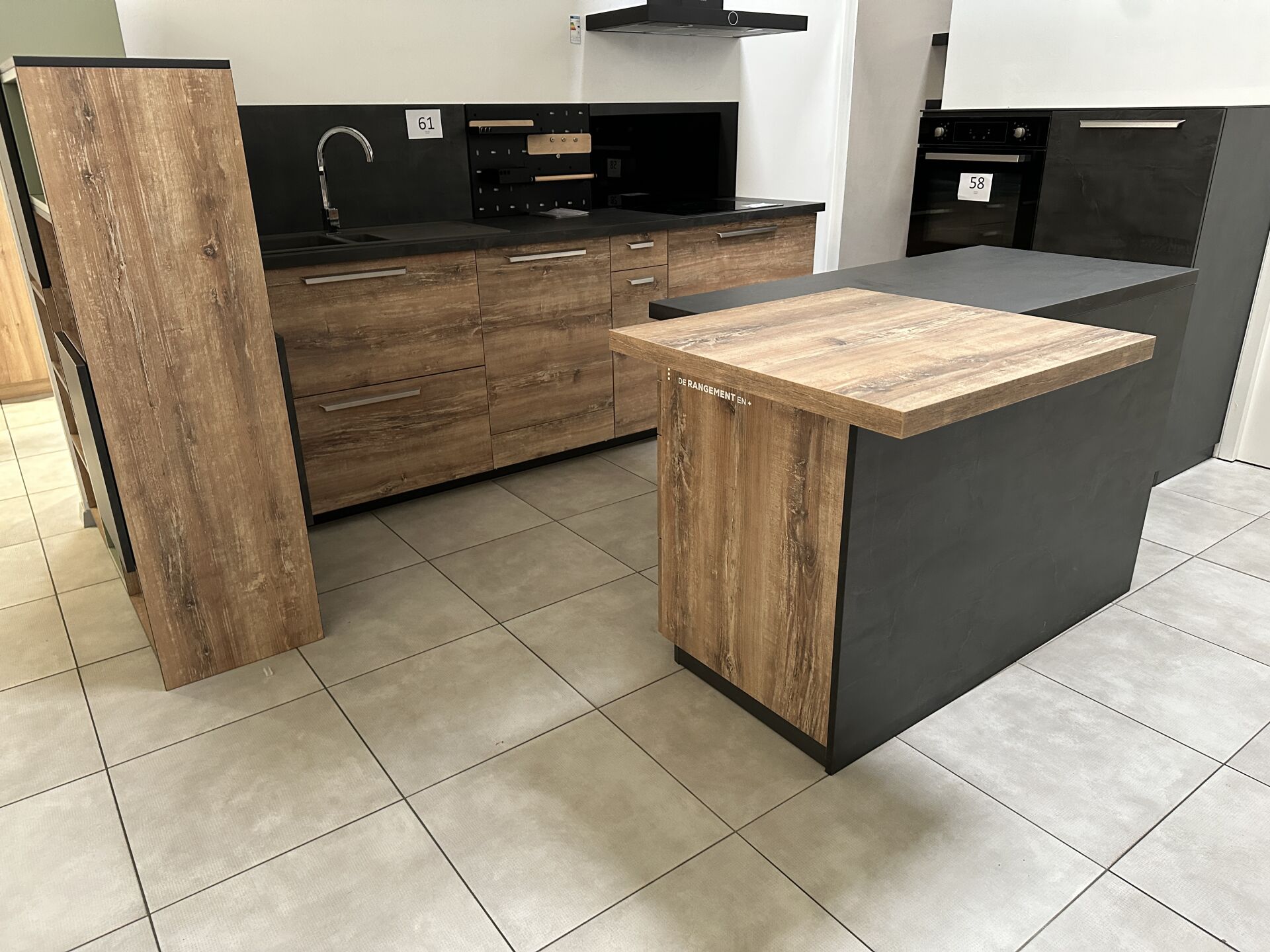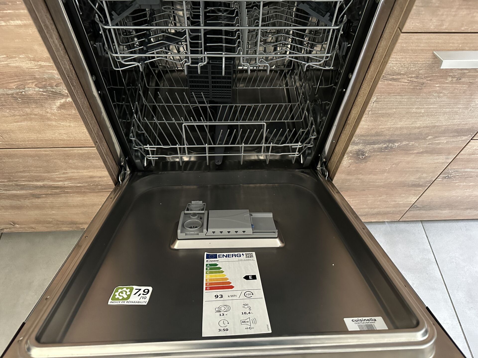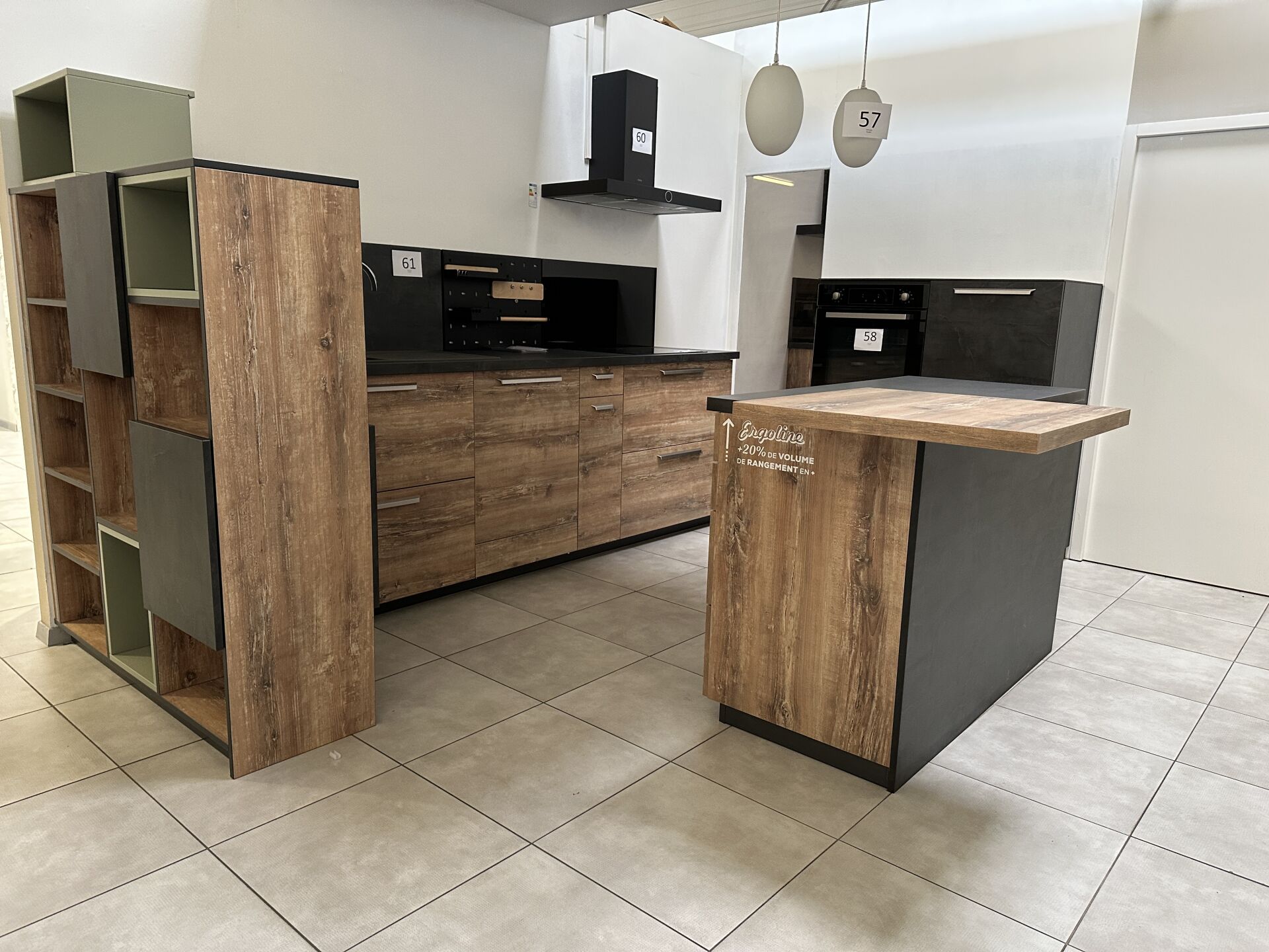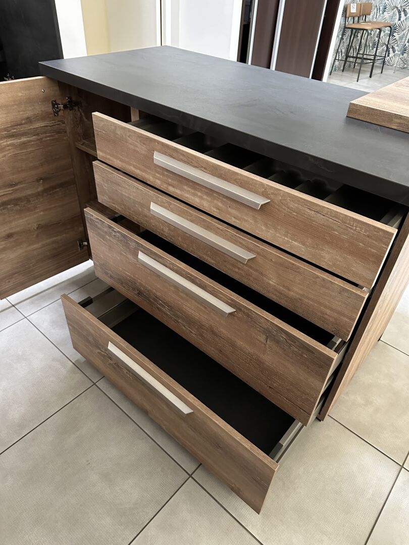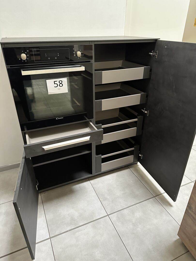 1 cuisine d'exposition R TREND +/ERGOLINE 2019, posée en angle 274 x 62 cm , retour 10 cases 2 portes 130 x 45 x 151 cm, mélaminé façade bois gris, avec évier 1 bac composite noir SCHOCK et robinetterie chromée ARGO, avec îlot central, 135 x 65 cm Prix de vente affiché TTC (sans électroménager) : 12.558€ Fiche détaillée disponible à l'étude. 1 lave-vaisselle tout intégrable CANDY Brava CDIN 2L350PB-47 13 couverts, connecté Wifi, 46 dB Prix vente TTC affiché : 448 €
