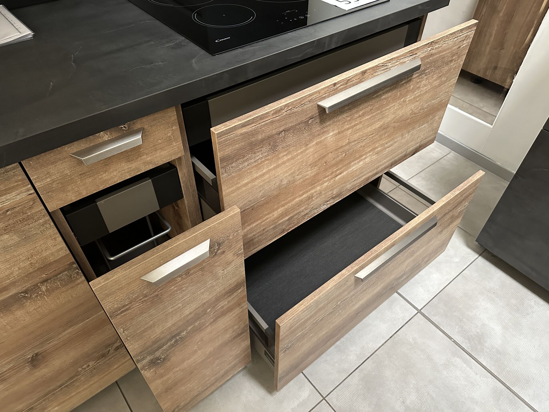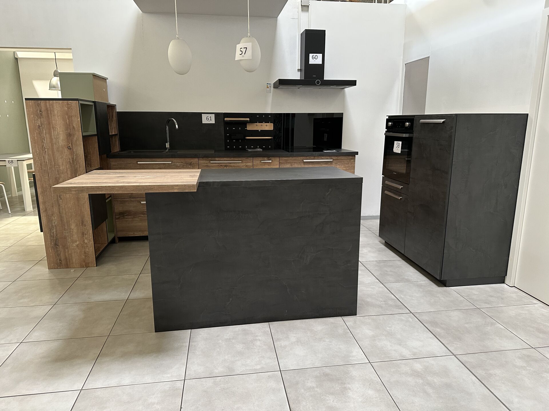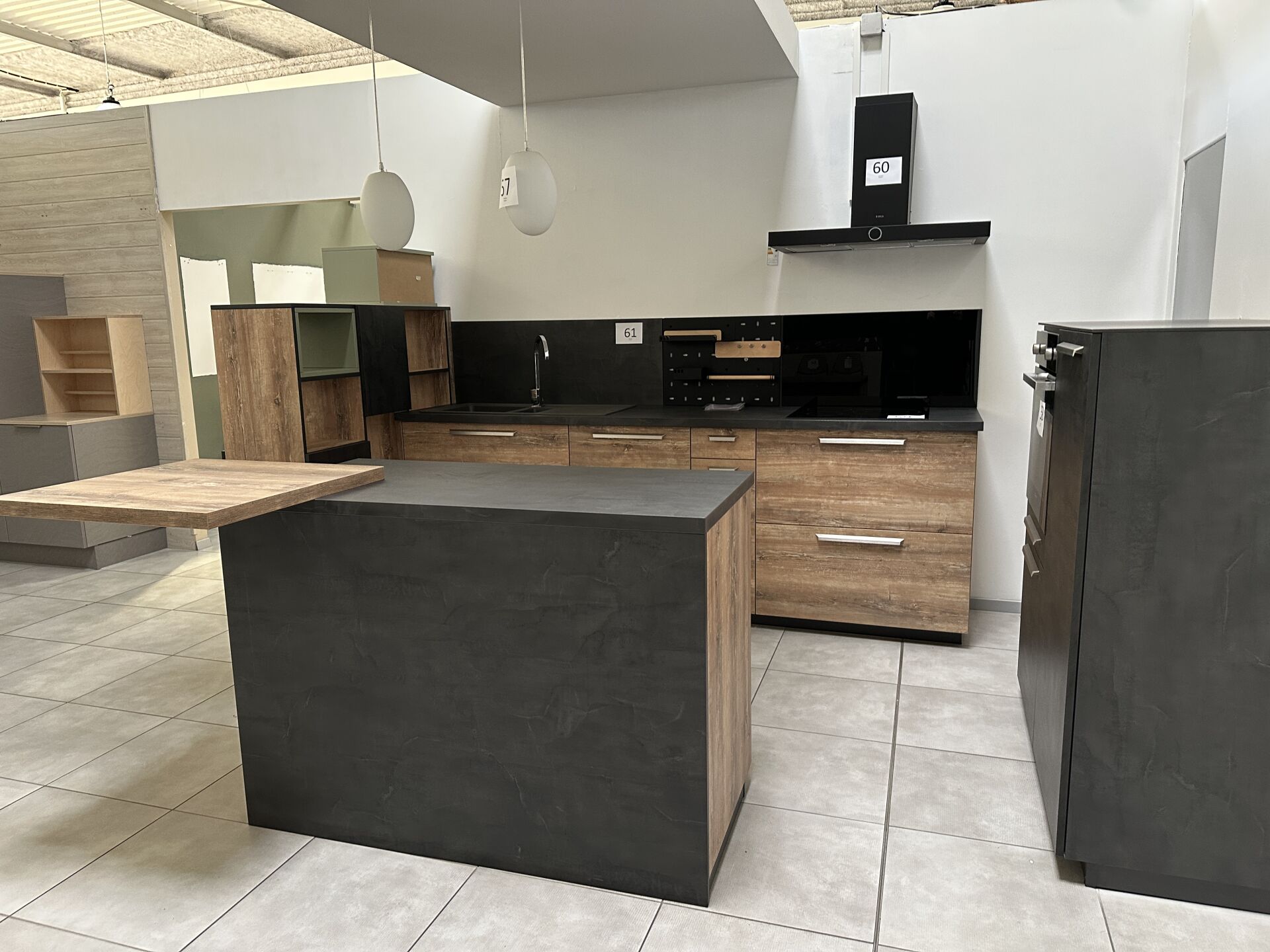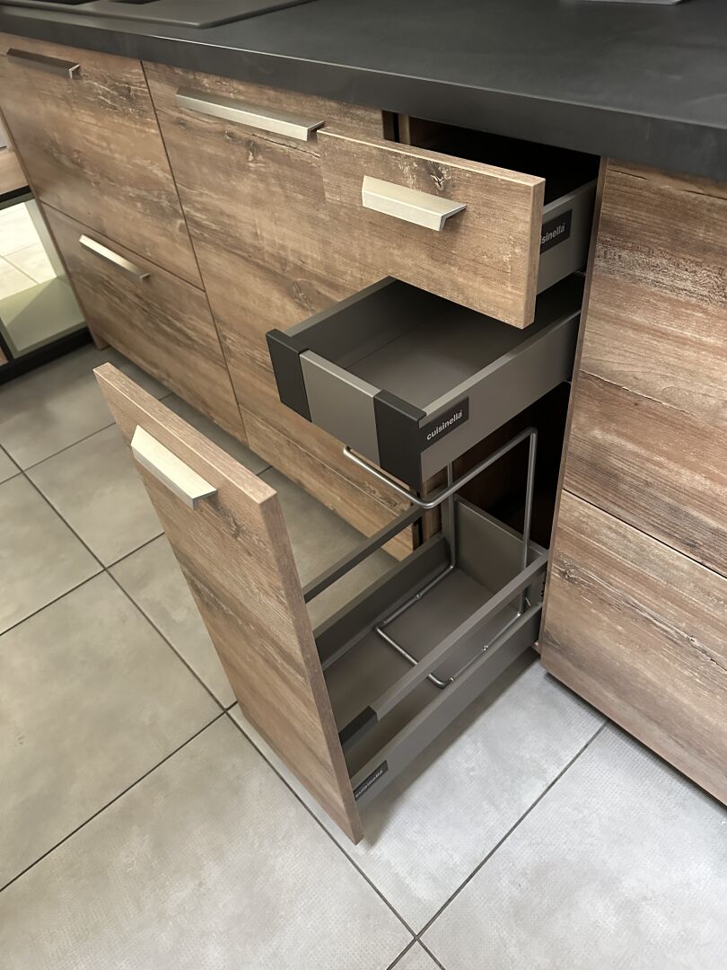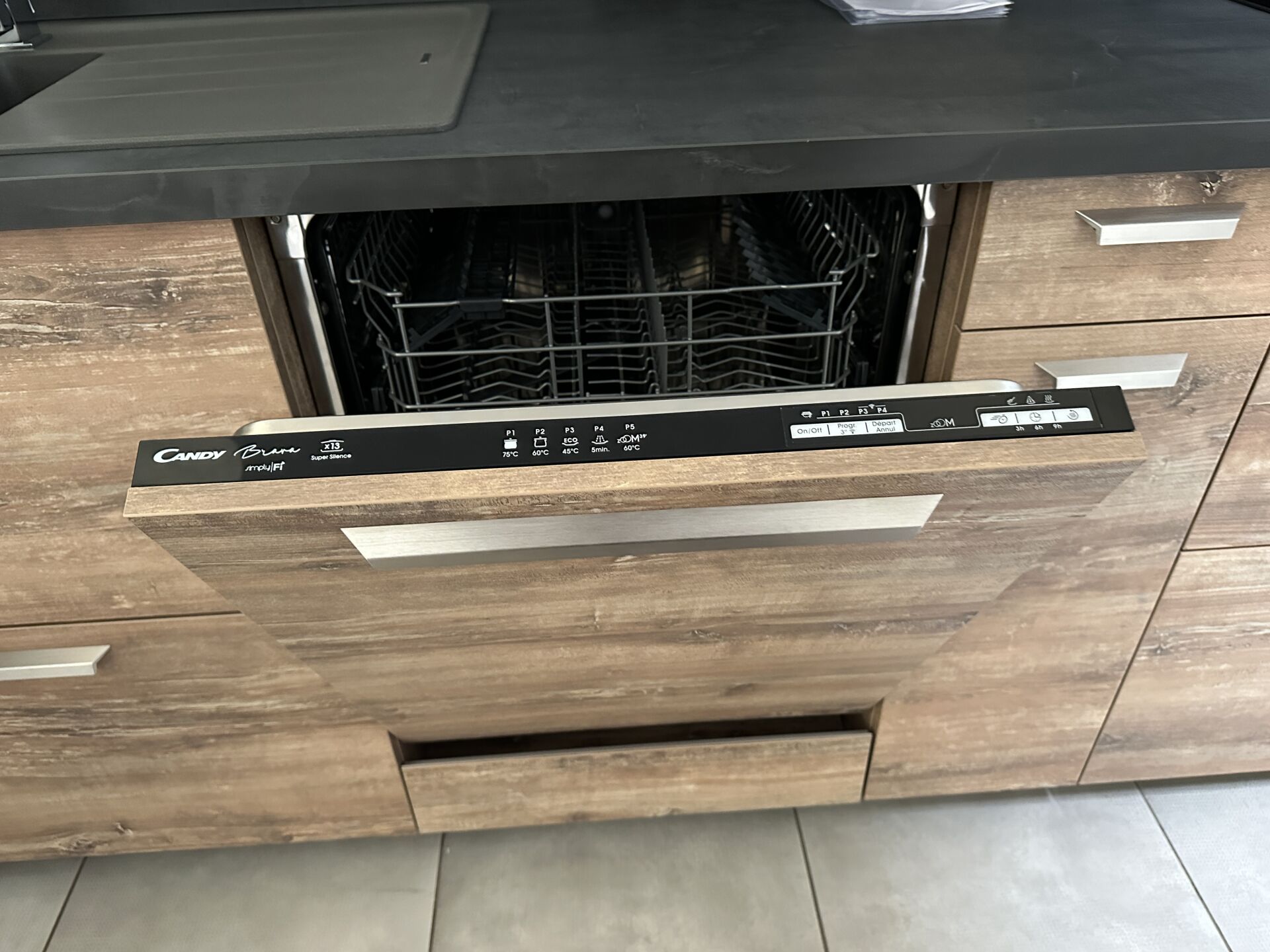 1 cuisine d'exposition R TREND +/ERGOLINE 2019, posée en angle 274 x 62 cm , retour 10 cases 2 portes 130 x 45 x 151 cm, mélaminé façade bois gris, avec évier 1 bac composite noir SCHOCK et robinetterie chromée ARGO, avec îlot central, 135 x 65 cm Prix de vente affiché TTC (sans électroménager) : 12.558€ Fiche détaillée disponible à l'étude. 1 lave-vaisselle tout intégrable CANDY Brava CDIN 2L350PB-47 13 couverts, connecté Wifi, 46 dB Prix vente TTC affiché : 448 €