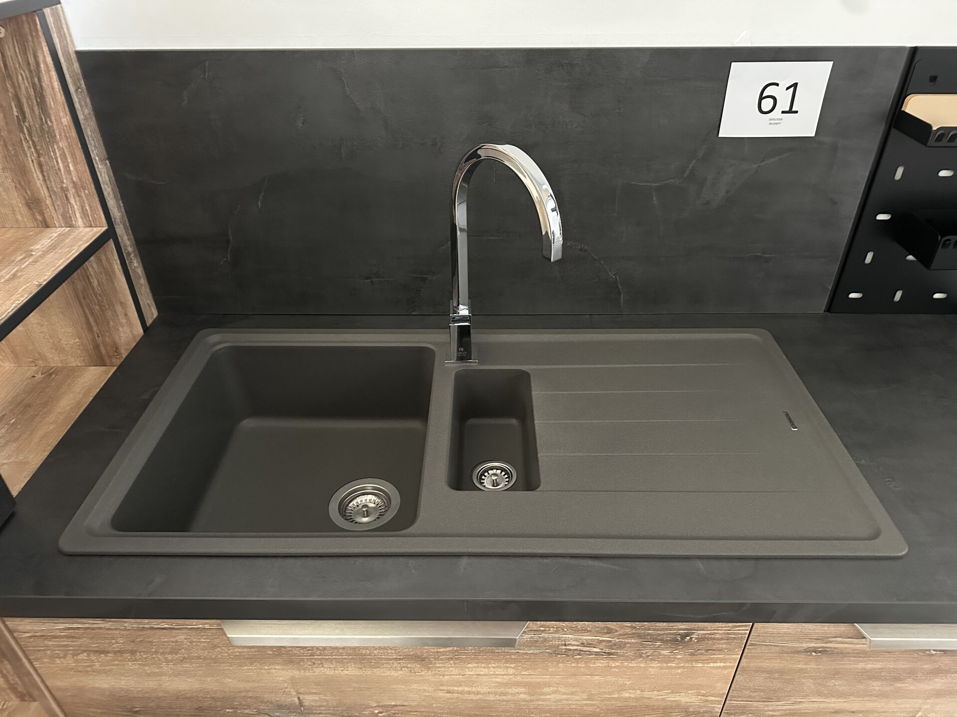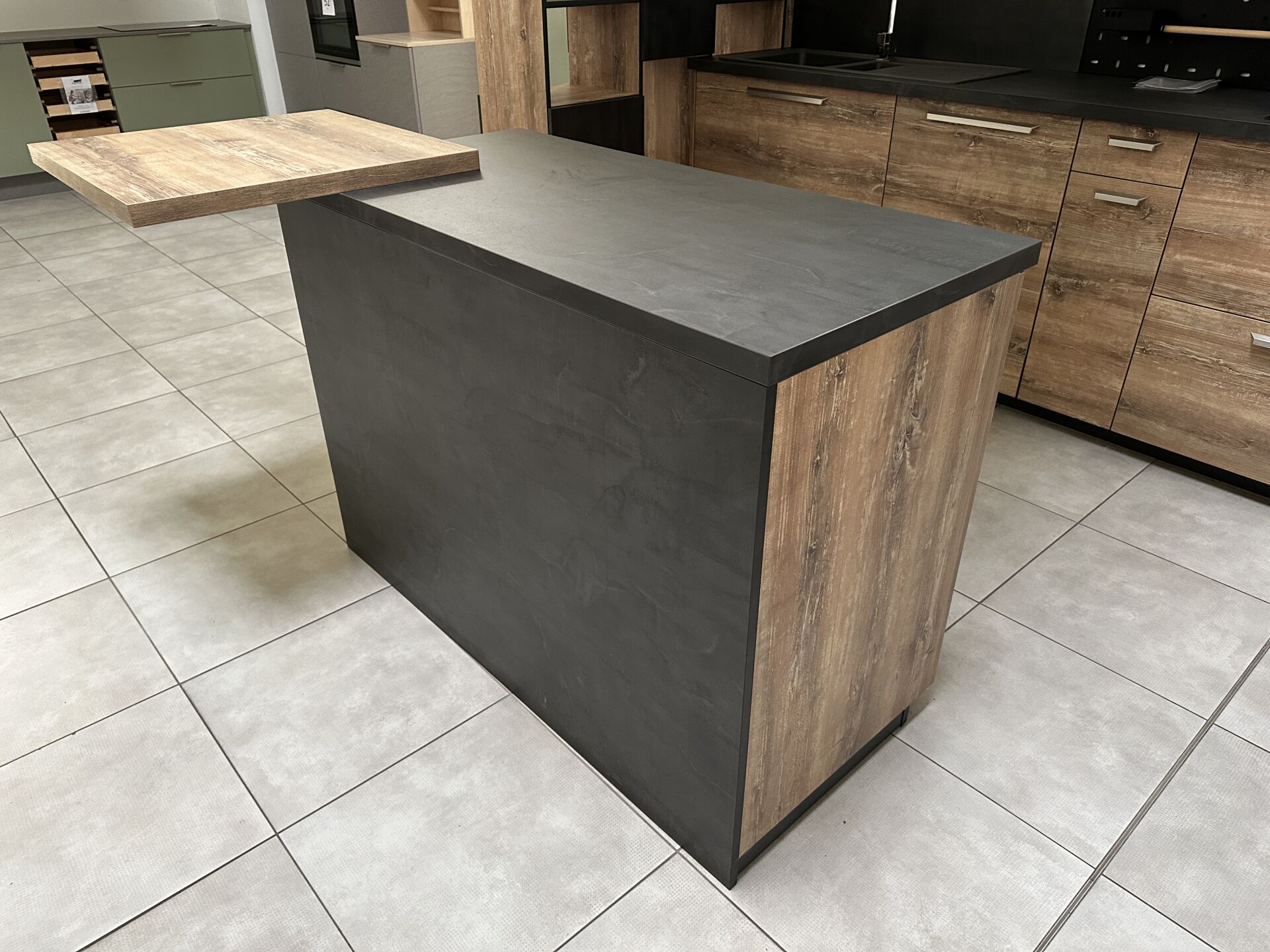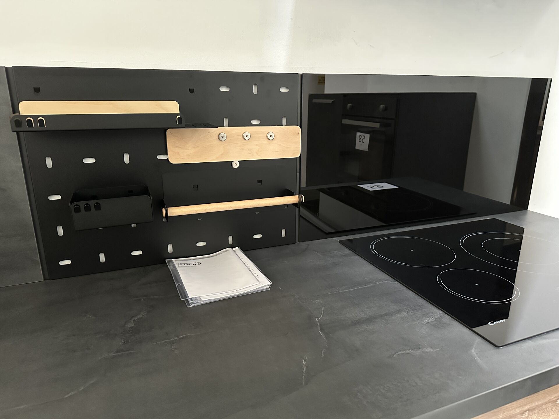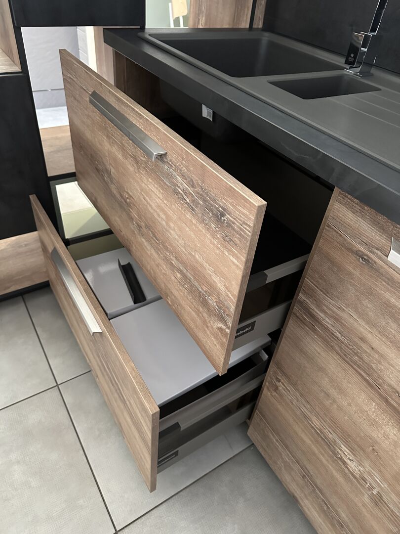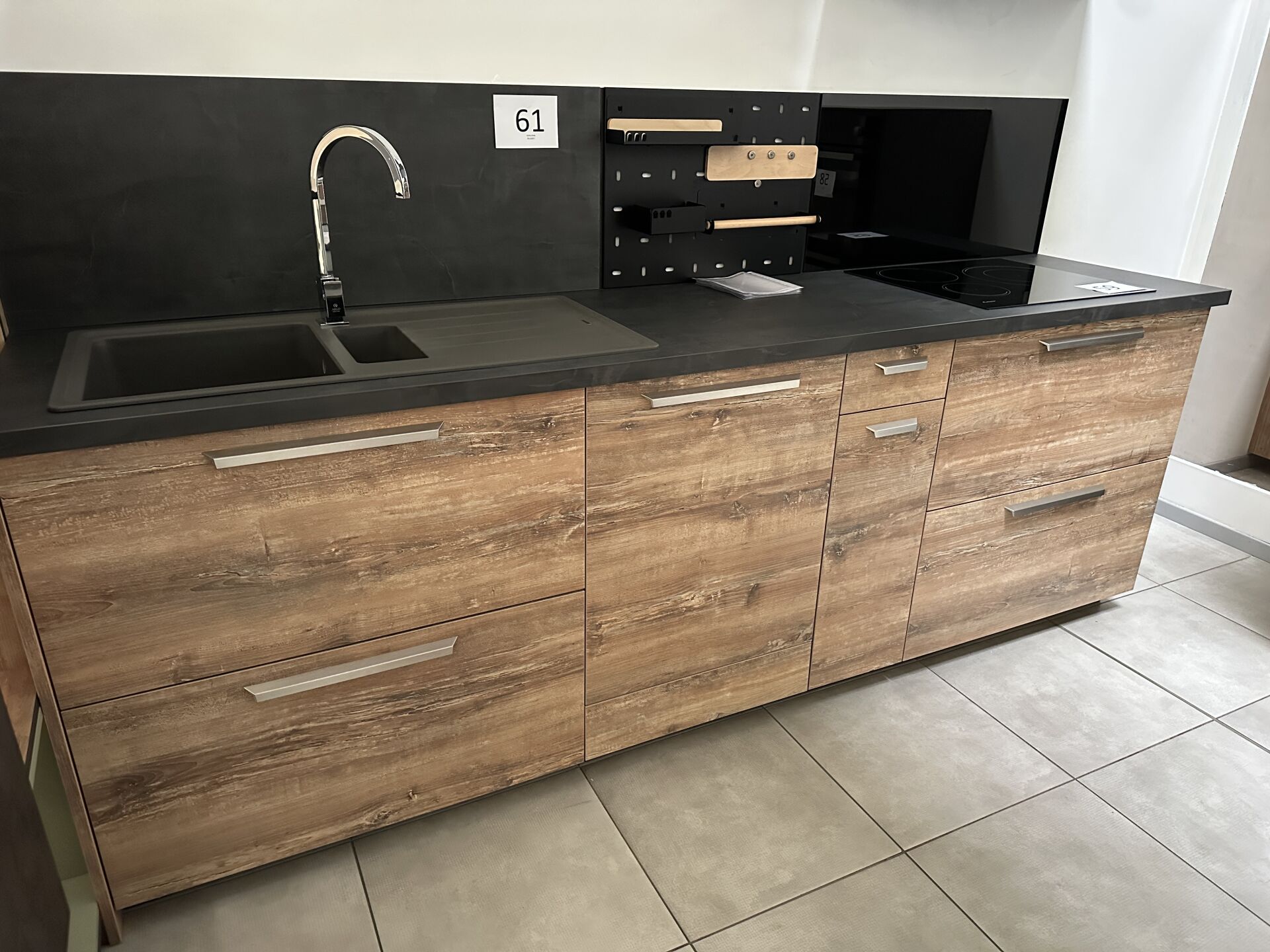 1 cuisine d'exposition R TREND +/ERGOLINE 2019, posée en angle 274 x 62 cm , retour 10 cases 2 portes 130 x 45 x 151 cm, mélaminé façade bois gris, avec évier 1 bac composite noir SCHOCK et robinetterie chromée ARGO, avec îlot central, 135 x 65 cm Prix de vente affiché TTC (sans électroménager) : 12.558€ Fiche détaillée disponible à l'étude. 1 lave-vaisselle tout intégrable CANDY Brava CDIN 2L350PB-47 13 couverts, connecté Wifi, 46 dB Prix vente TTC affiché : 448 €