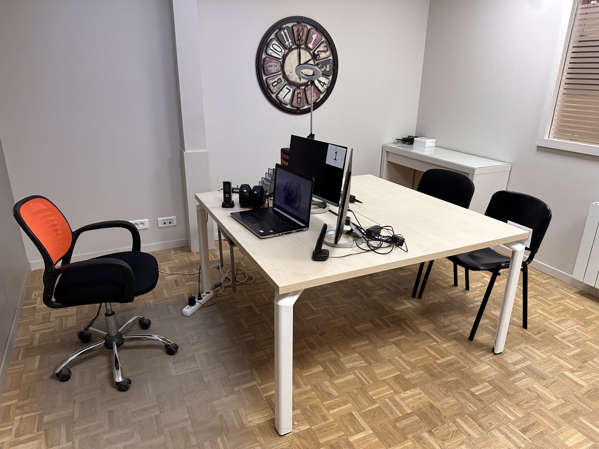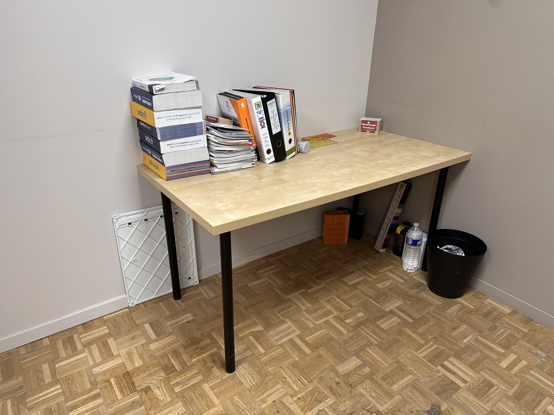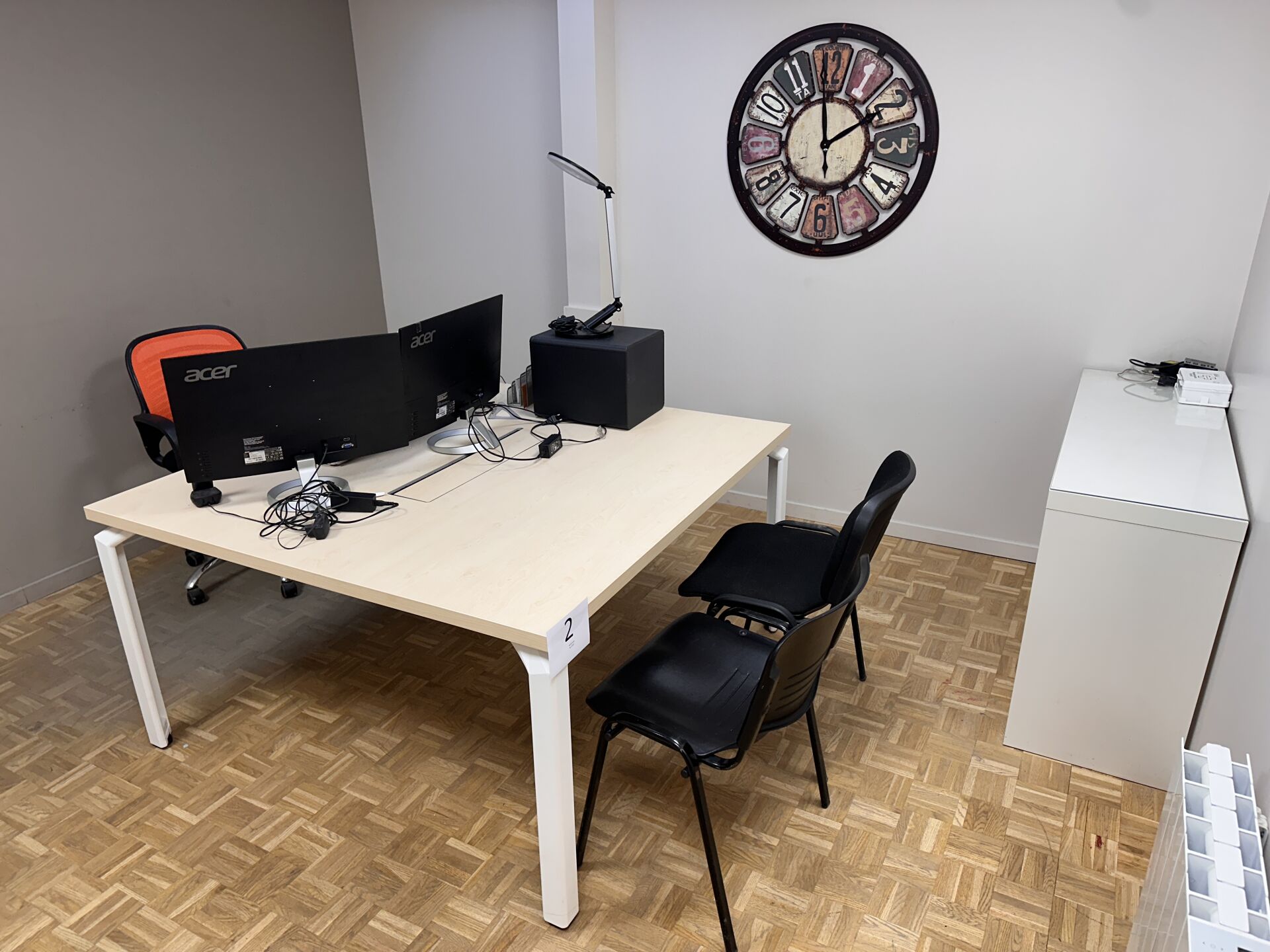 1 bureau mélaminé, piètement métal blanc 140 x 140 cm 1 fauteuil tournant/roulant, 2 chaises visiteurs noires 1 console mélaminé, blanche plateau verre 120 x40 cm 1 horloge murale, 1 lampe de bureau, 1 module 5 tiroirs plastique, 1 table mélaminé façon bois 150 x 75 cm