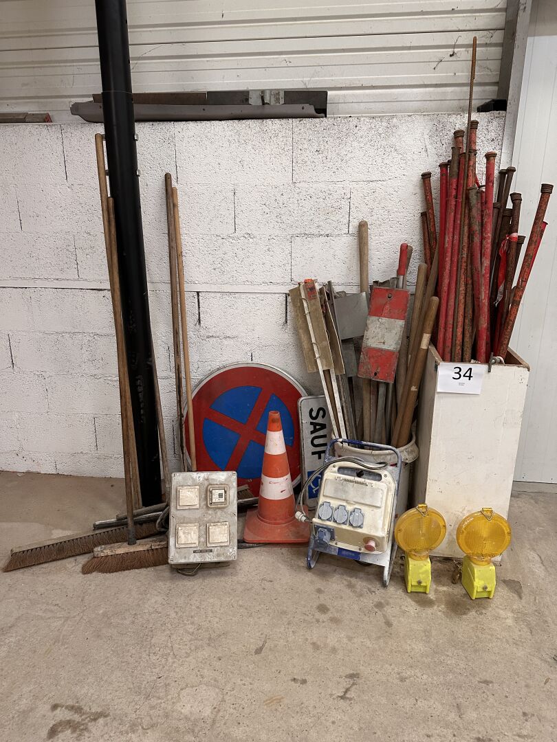 2 coffrets électriques pour chantier, environ 25 piquets de chantier, piquets de balisage, 1 panneau "arrêt interdit" , 1 plot, 2 lampes de chantier clignotantes, 1 lot de balais et raclette