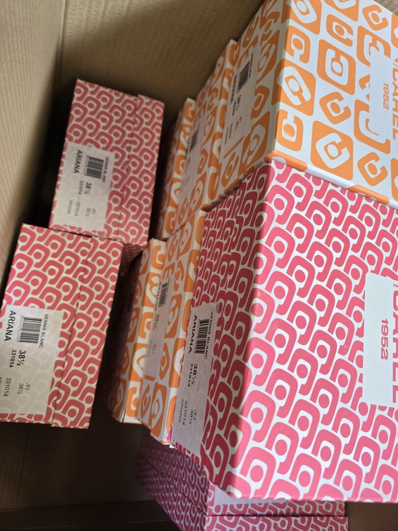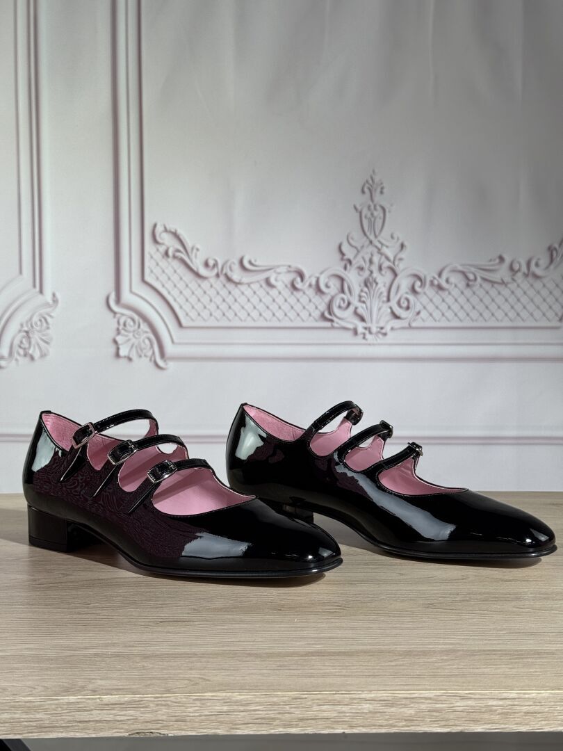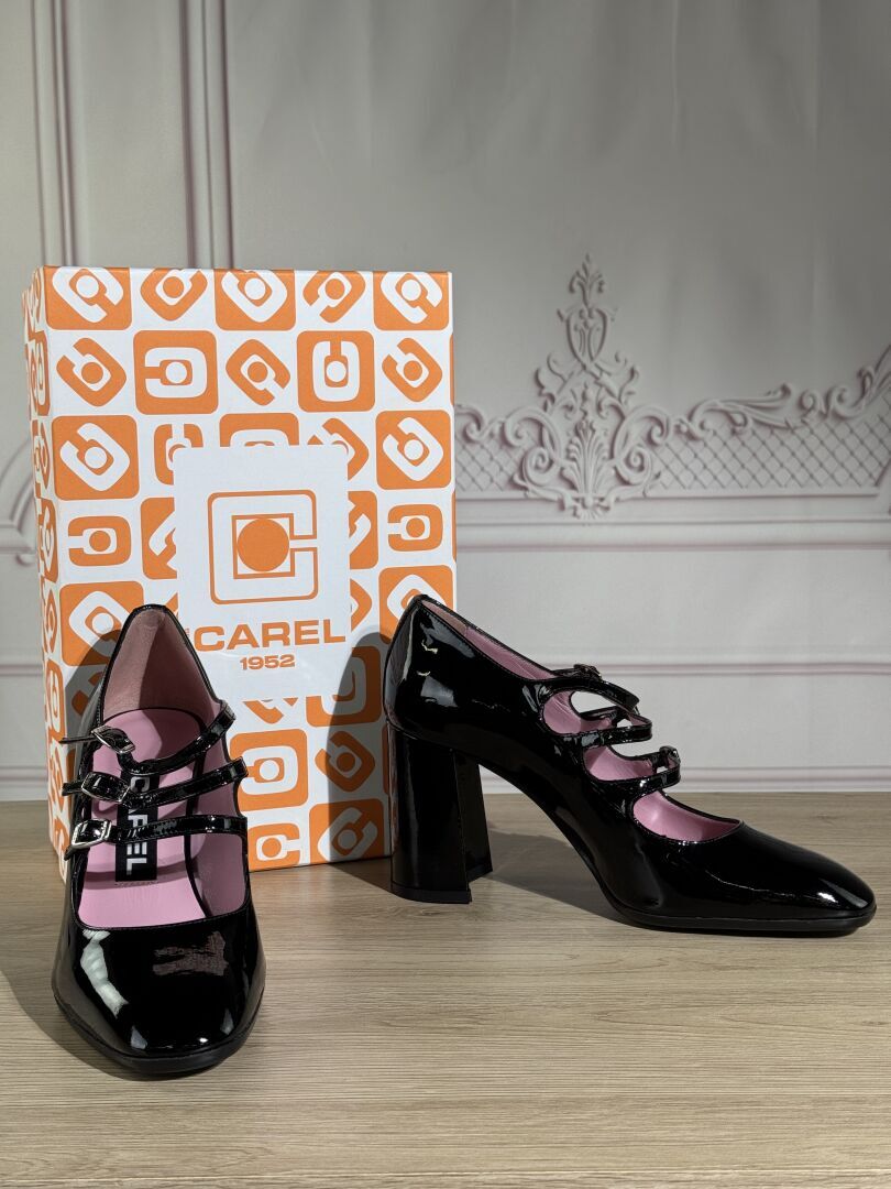 CAREL - Lot comprenant 13 paires de souliers, Pointure 38,5 dont : - 1 modèle "Banana" cuir noir, - 3 modèles "Keel" cuir vernis noir, - 2 modèles "Ariana" cuir vernis noir, - 4 modèles "Ariana" cuir vernis blanc, - 3 modèles "Banana" cuir vernis noir, Etat magasin (certaines boites abimées)