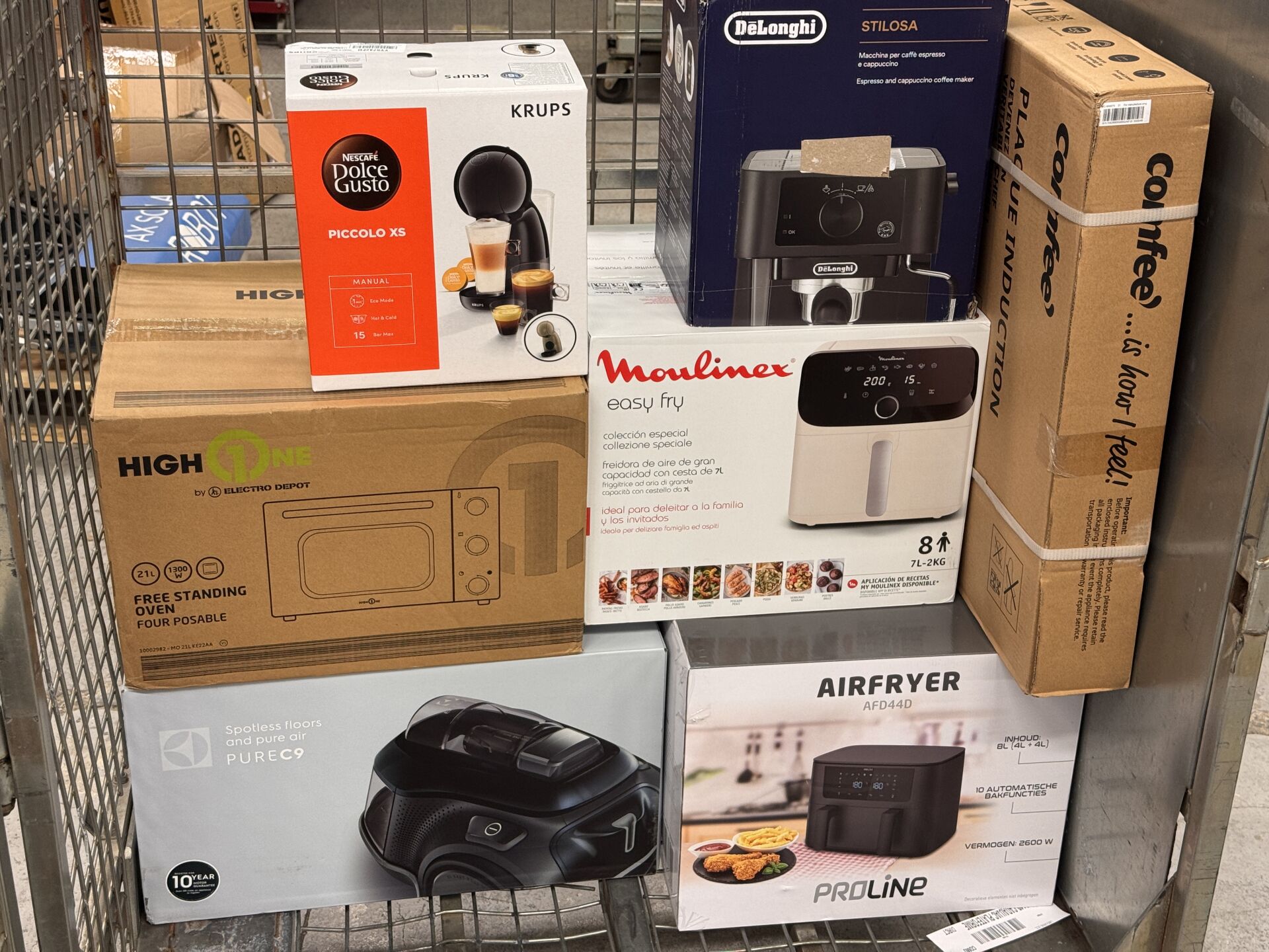 LOT DE PETITS ELECTROMENAGERS DONT TABLE DE CUISSON, MACHINE A CAFE, AIRFRYER, FOUR / DELONGHI, MULINEX, KRUPS (expédition sur devis) Lot issu de colis non réclamés : état de fonctionnement non garanti.