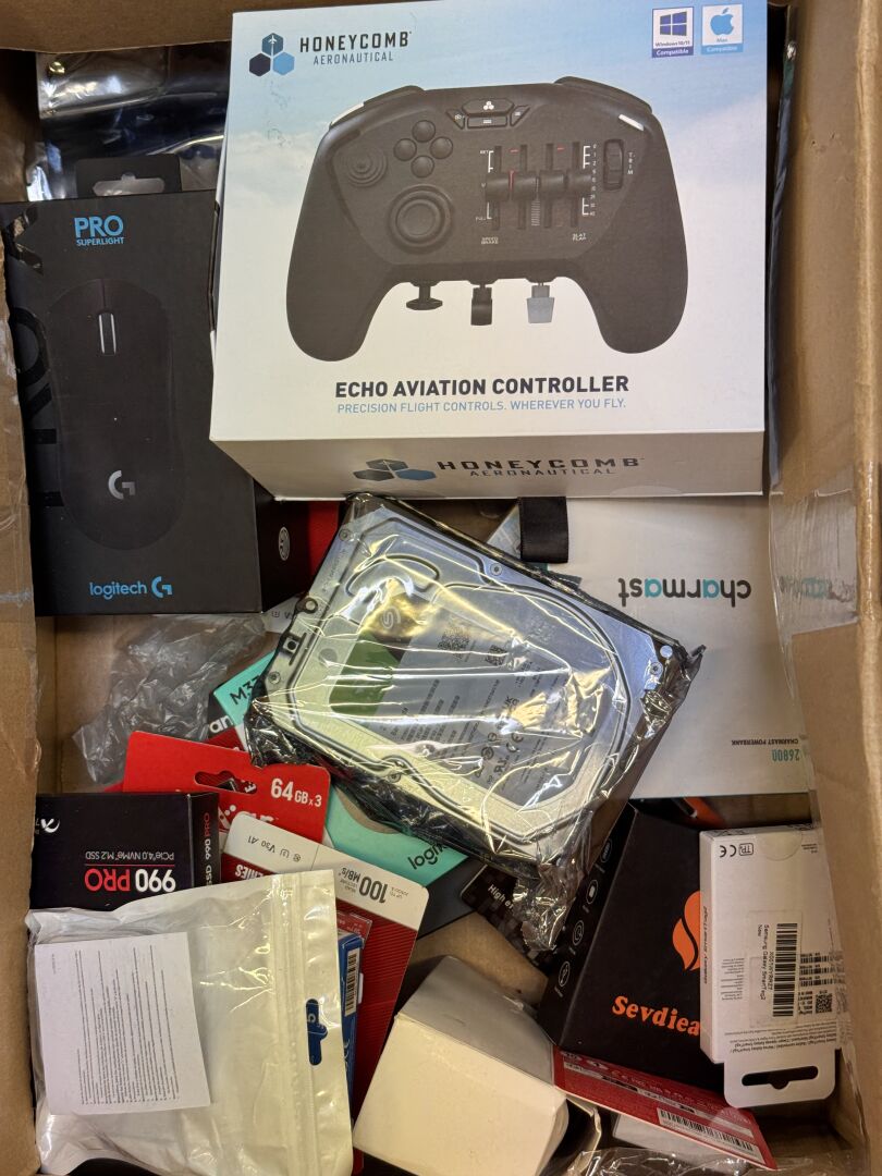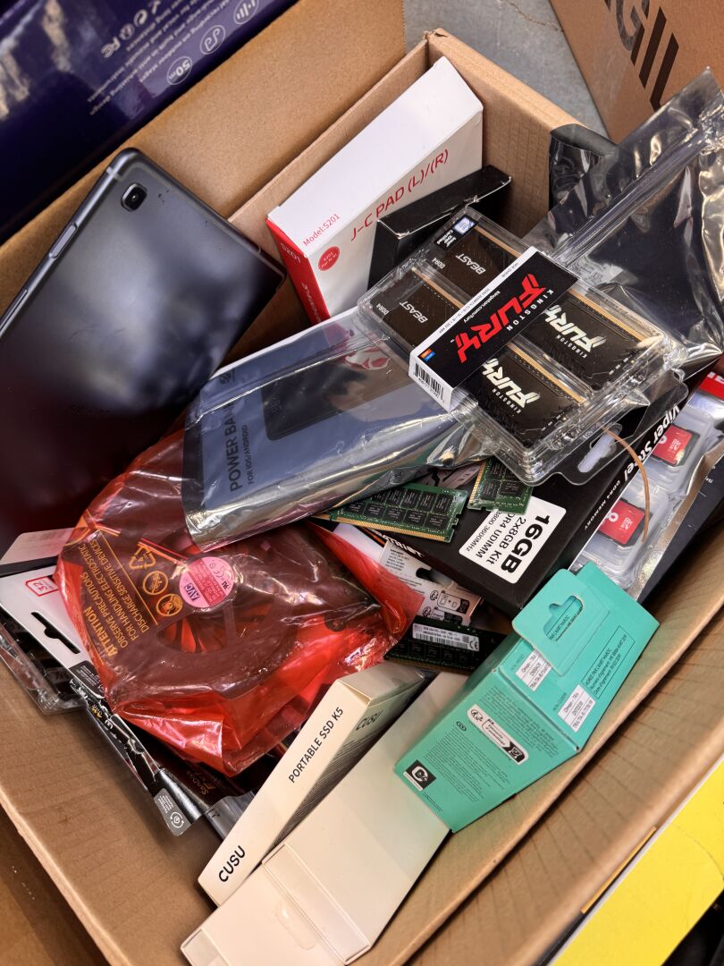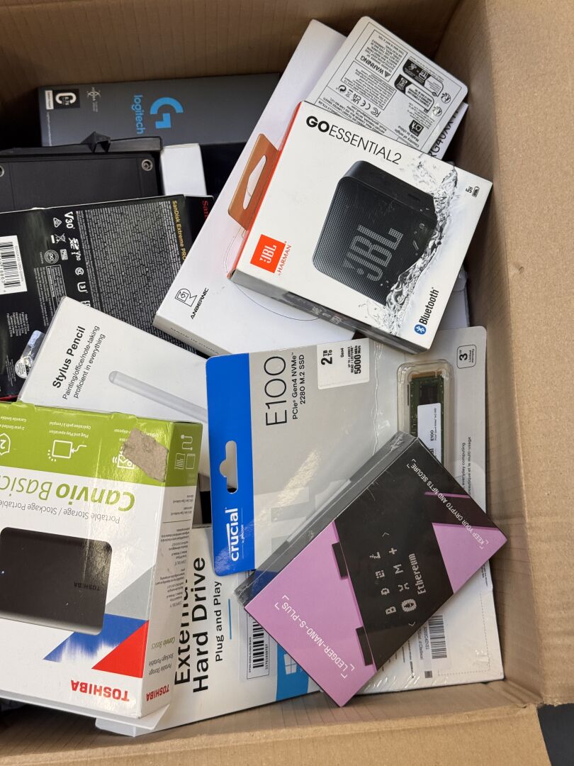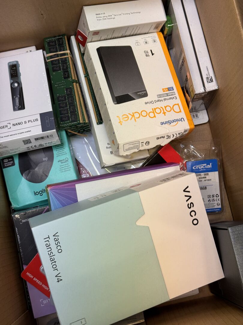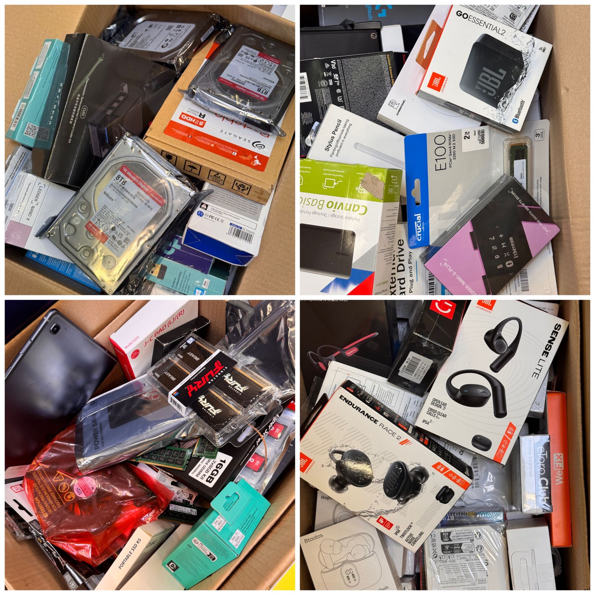 FORT ENSEMBLE DE MATERIEL INFORMATIQUE & MULTIMEDIA PETITS MATERIELS ELECTRONIQUES DONT ECOUTEURS, SSD, MEMOIRES, DISQUES, MANETTES, ACCESSOIRES CONSOLES, DVD (expédition sur devis) (dont produits avec traces d'usage) Lot issu de colis non réclamés : état de fonctionnement non garanti