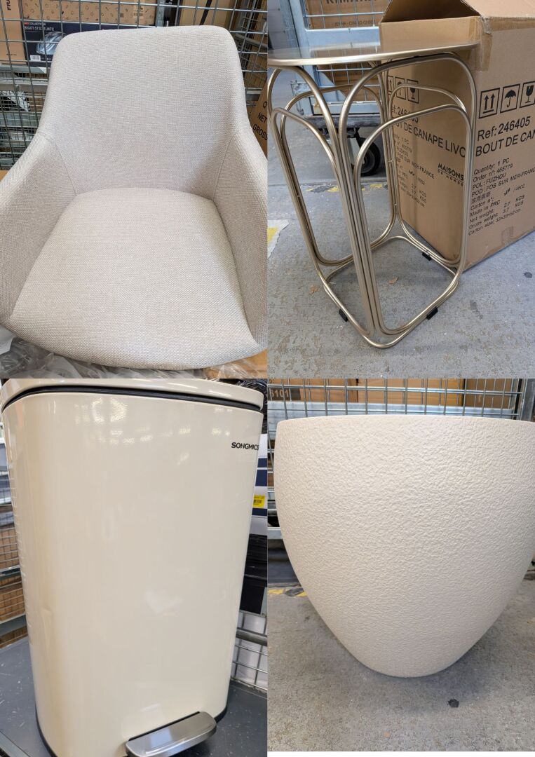 FORT ENSEMBLE DE PETITS MOBILIERS ET DECORATIONS (environ 1m3) DONT CHAISE, GARDE CORPS, RANGEMENT METALLIQUE, POT, POUBELLE, ARMOIR DE NICHE, BOUT DE CANAPE, LAMPADAIRE / NIMARA, DOREL FRANCE, LA REDOUTE, LUMISKY, SONGMICS, VASAGLE, IKEA, FURNESTORICA, MAISONS DU MONDE (expédition sur devis) Lot issu de colis non réclamés : état de fonctionnement non garanti.