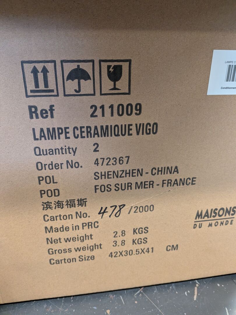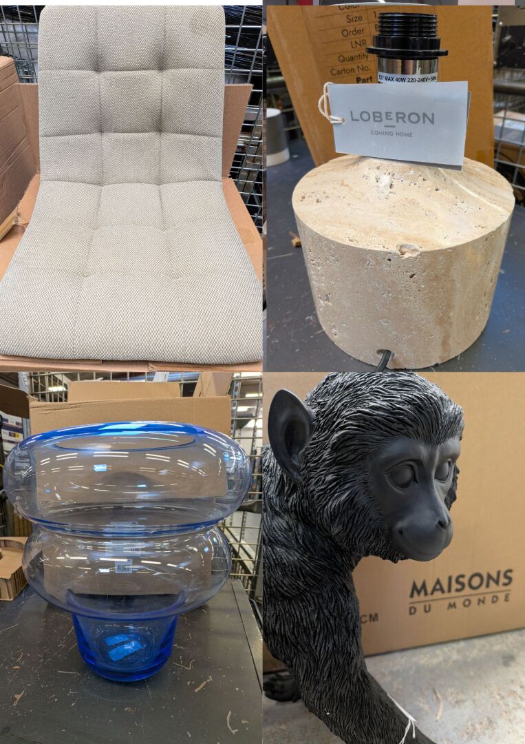 FORT ENSEMBLE DE PETITS MOBILIERS ET DECORATIONS (environ 1m3) DONT LAMPE, CHAISE, LUMINAIRE, VASE, MEUBLE DE RANGEMENT, BOUT DE CANAPE / LOBERON, MAISONS DU MONDE, IKEA, MICADONI, WENKO, H&M HOME (expédition sur devis) Lot issu de colis non réclamés : état de fonctionnement non garanti.