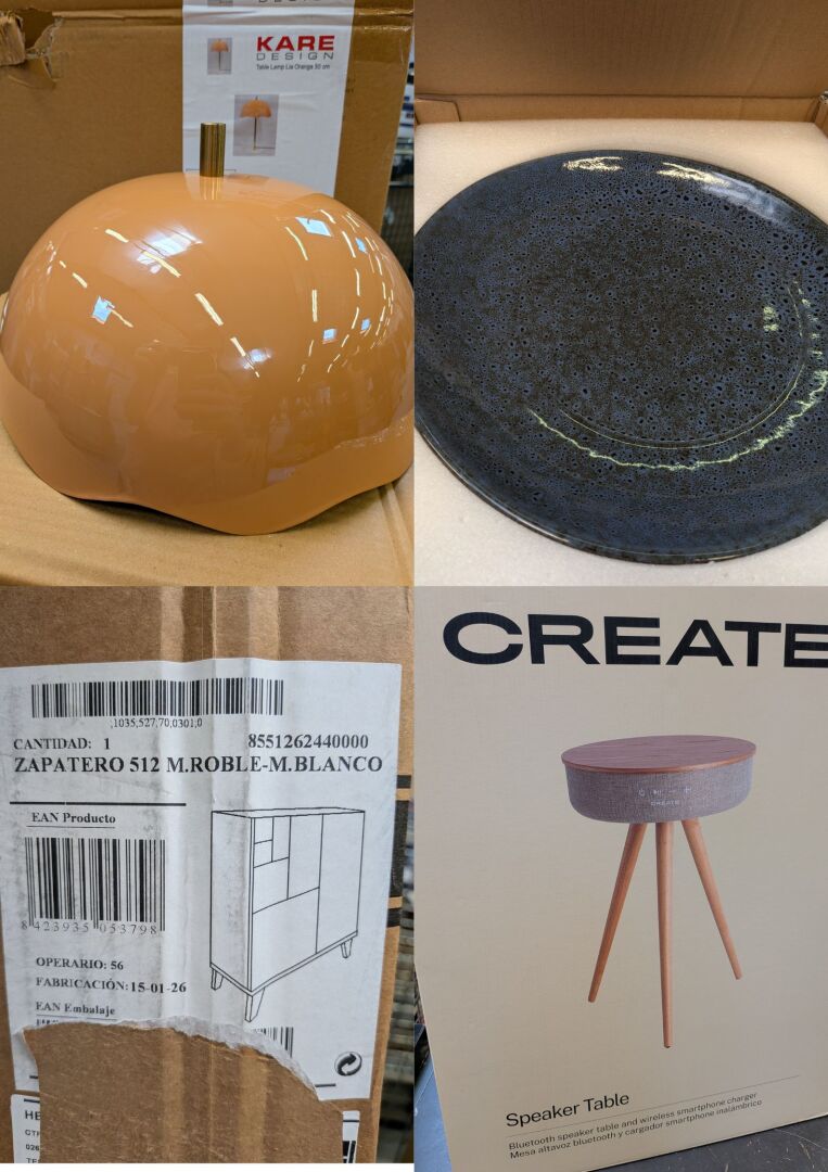 FORT ENSEMBLE DE PETITS MOBILIERS ET DECORATIONS (environ 1m3) DONT GUERIDON, LAMPE, LAMPADAIRE, POT, ETAGERE, CAISSE A PAIN, MEUBLE DE RANGEMENT, TABLE HAUT PARLEUR / KARE DESIGN, CREATE, MAISONS DU MONDE, SONGMICS, YOUDENOVA, EDISHINE, PREMAMAN, HERDASA, IKEA (expédition sur devis) Lot issu de colis non réclamés : état de fonctionnement non garanti.