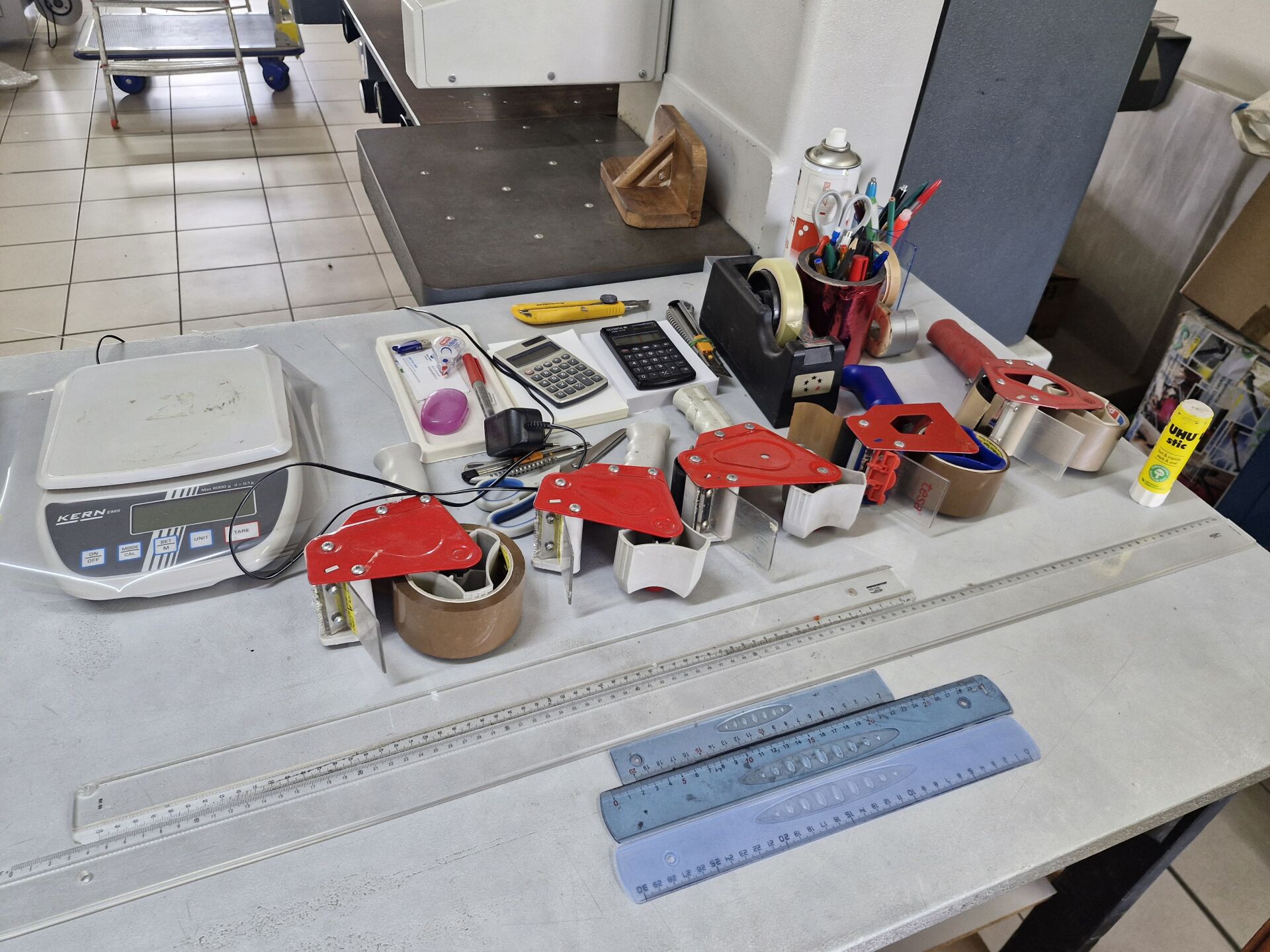2 agrafeuses professionnelles ENAK-50-200 1 massicot 1 balance électronique KERN ENS 6 kg d : 0.1 g, 1 ensemble de scotcheuses , règles, cutters etc