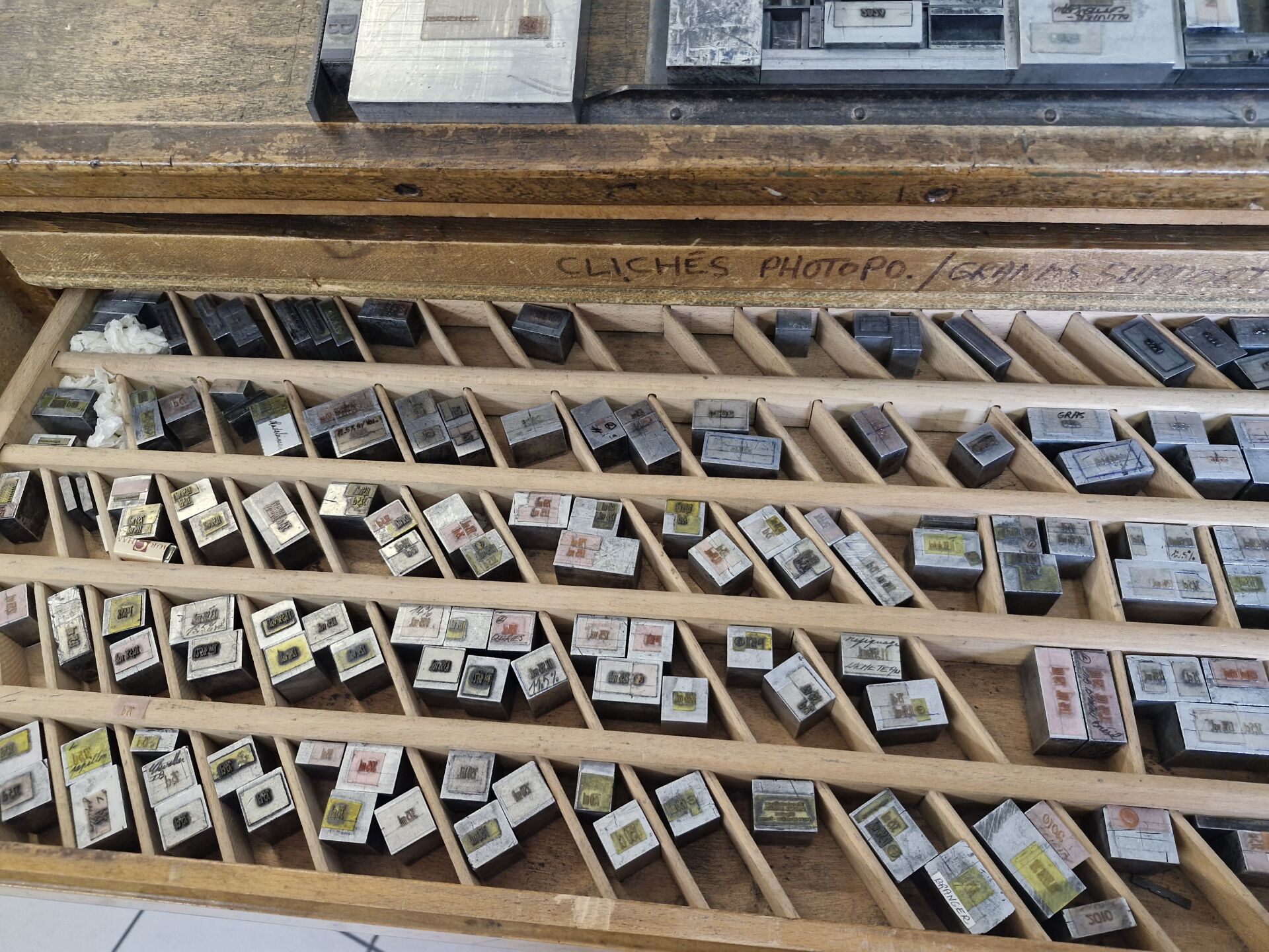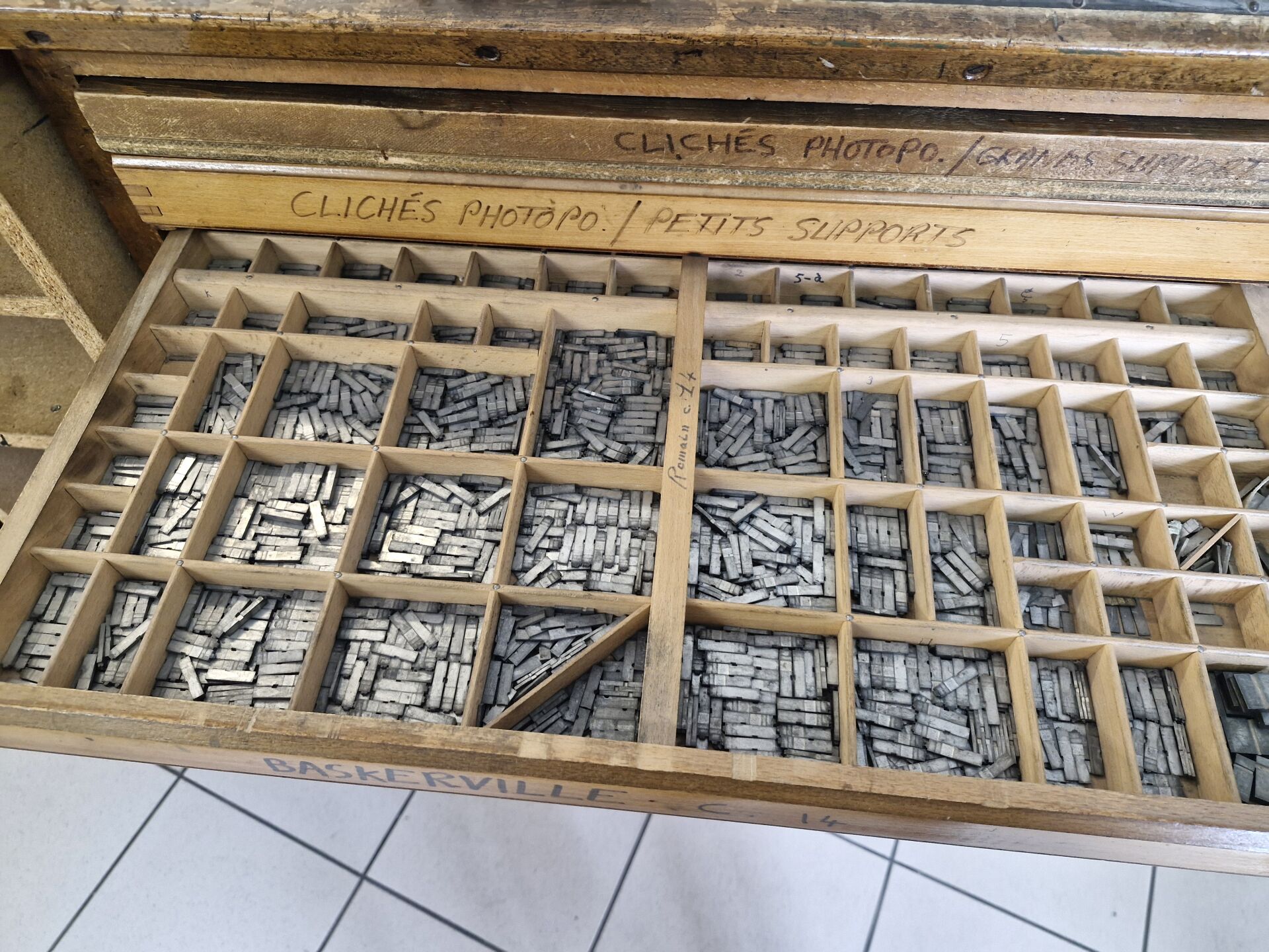 1 lot de caractères pour presses typo dans 1 module de meubles bois à tiroirs 140 x 50 x 120 cm