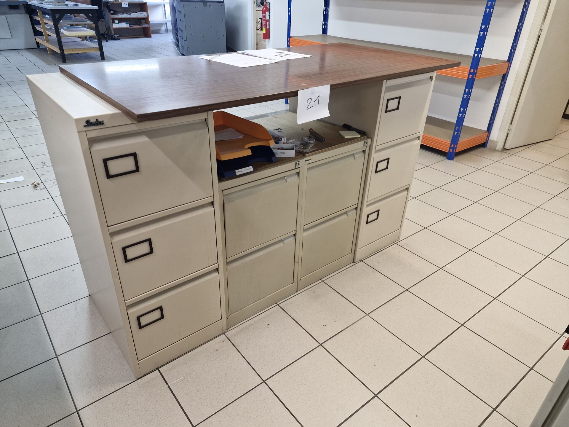 1 rembobineuse fabrication maison entrainement par perceuse BOSCH 5 axes sur meuble mobile métal bleu avec étagères 100 x 80 cm 1 table de travail fabrication maison plateau aggloméré et inox piètement métal gris 305 x 80 cm 4 classeurs à dossiers suspendus métal beige : 2 de 3 tiroirs, 2 de 2 tiroirs, avec plateau mélaminé 150 x75 cm