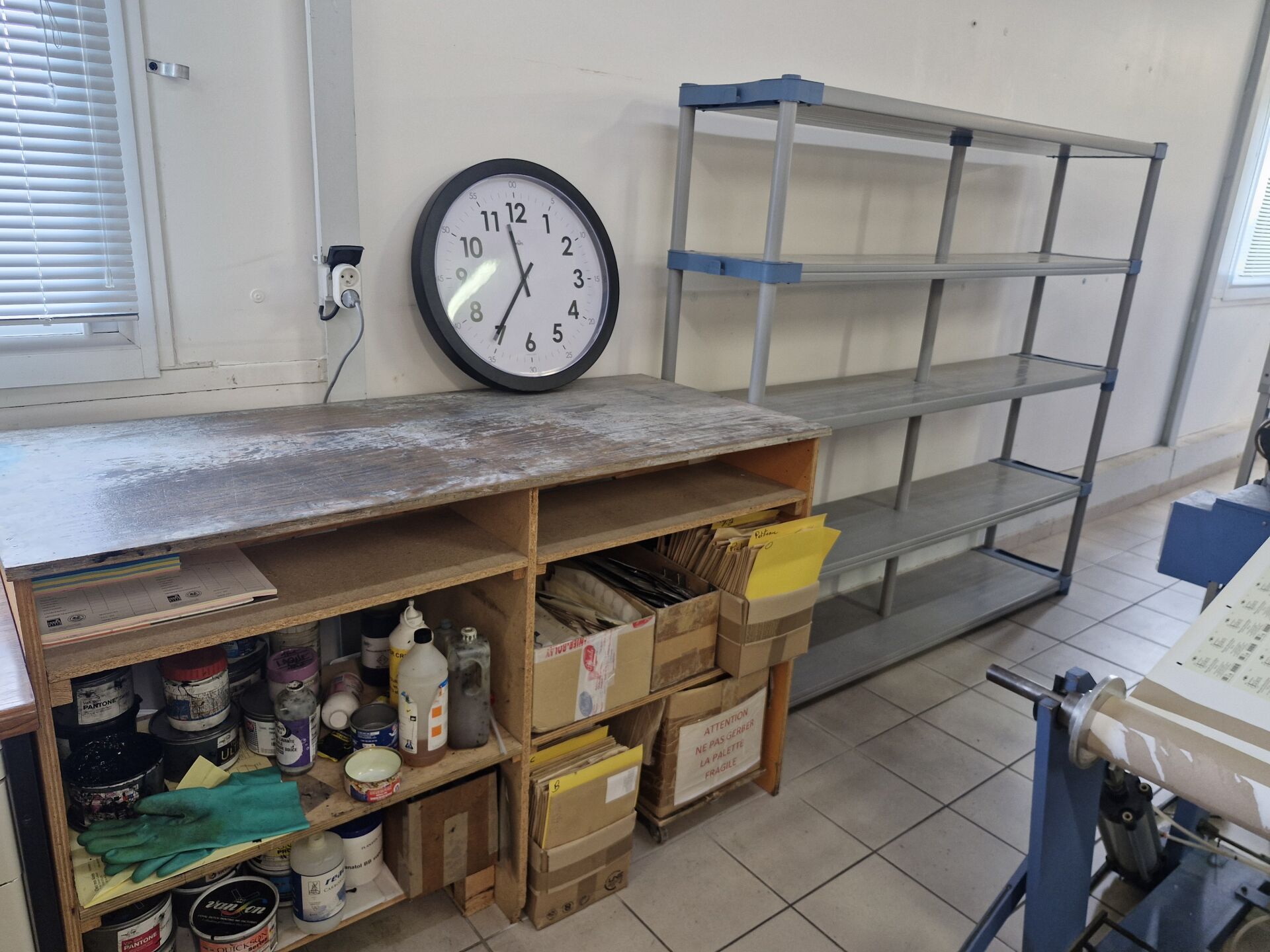 1 établi fabrication interne métal et bois avec crédence 125 x 95 cm avec étau mors parallèles , 1 horloge murale 1 bureau à caisson métal gris et bois 156 x 78 cm 1 plan de travail fabrication maison aggloméré 156 x 70 cm 1 étagère double plastique gris 200 x 40 x 174 cm VENDU SANS L OUTILLAGE