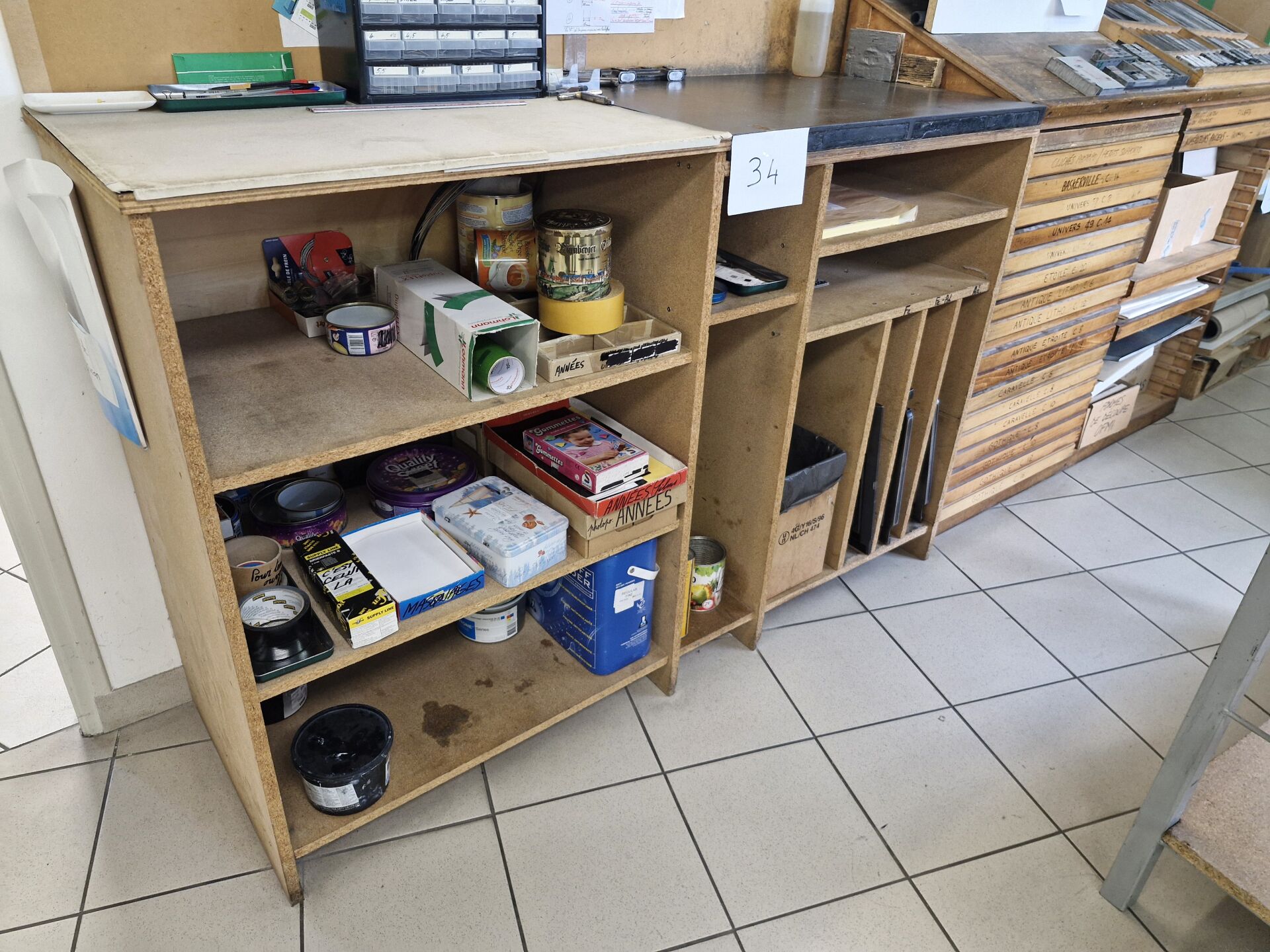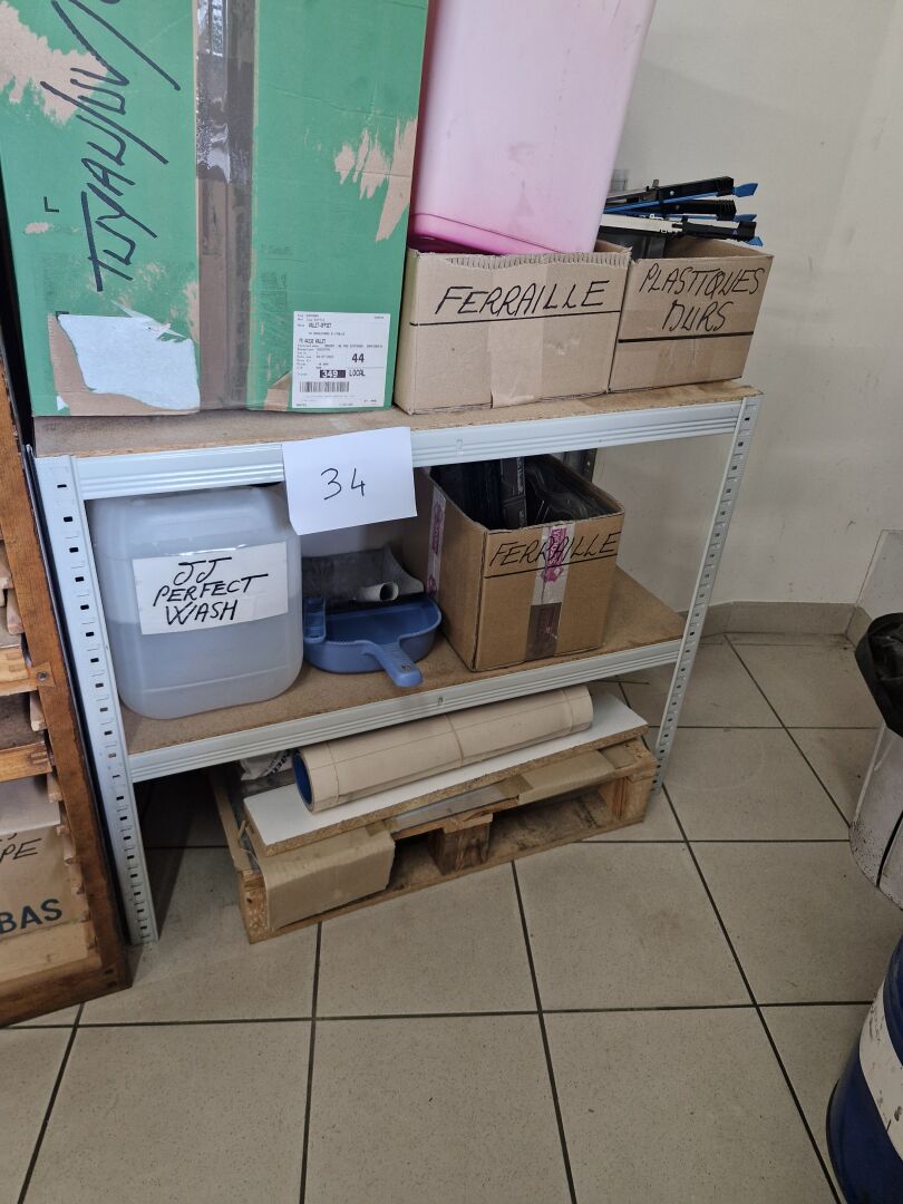1 grand plan de travail piètement métal plateau aggloméré équipé d'étagères en entrejambe 150 x 97 x 103 cm, 1 tabouret haut 1 étagère cornière basse 90 x 40 x 72 cm 1 meuble fabrication interne aggloméré 156 x 52 x 103 cm équipé d'un marbre de 80 x 50 cm